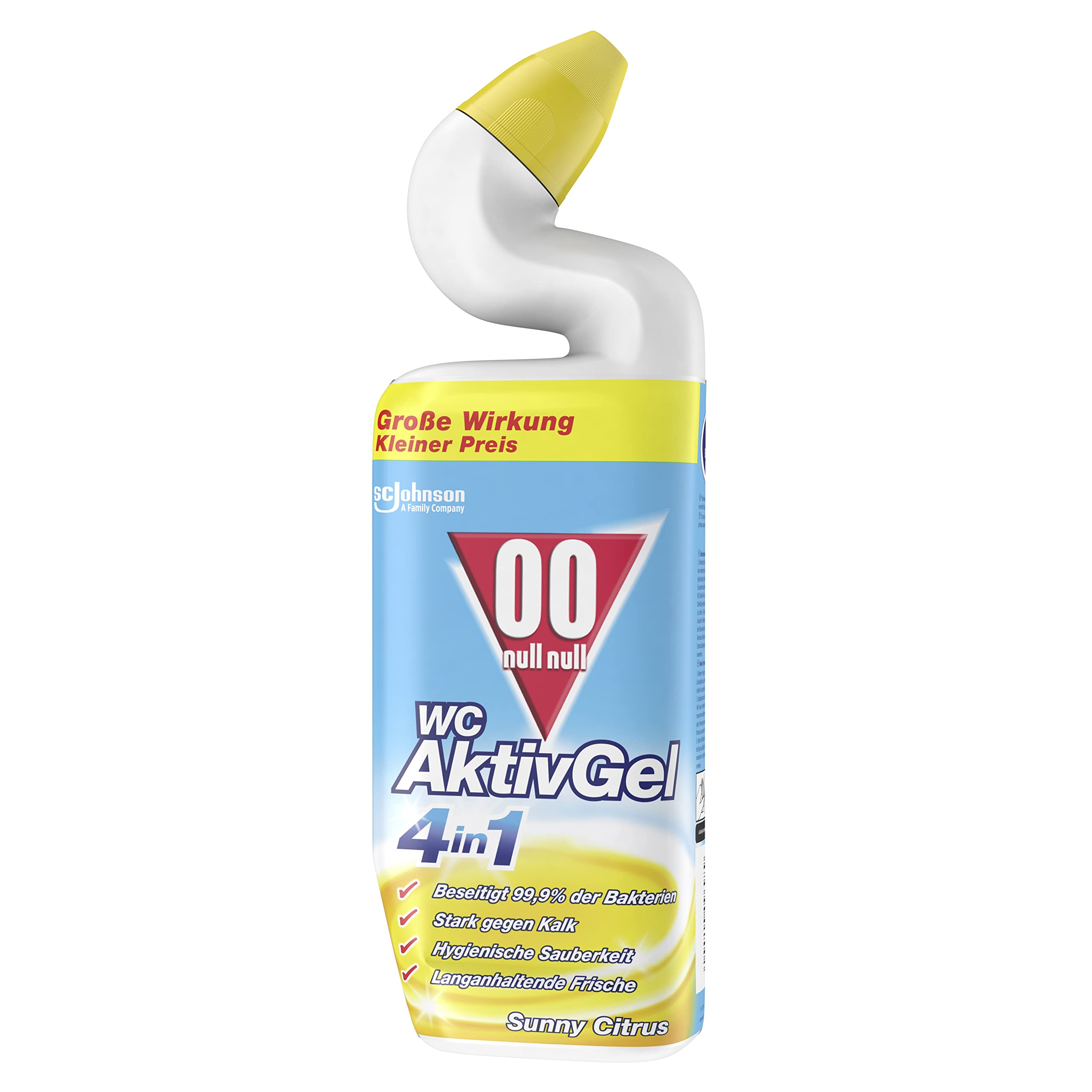 Das 00 null null Aktiv Gel 4in1 wurde für die zuverlässige und gründliche WC-Reinigung entwickelt, Es macht Ihre Toilette hygienisch rein und beseitigt 99,9Prozent der Keime und Bakterien, Die Formel ist stark gegen Kalk und sorgt für hygienische Sauberkeit und langanhaltende Frische, Das Produkt ist in einer Vielzahl von Düften erhältlich, Anwendungshinweise: Heben Sie den Toilettensitz an, Um die Kappe zu entfernen, drücken Sie die beiden strukturierten Flächen aufeinander und schrauben die Kappe dann vollständig ab, Kippen Sie die Flasche, um den Flaschenhals mit Reiniger-Gel zu befüllen, Flüssigkeit direkt unter den Toilettenrand geben und gleichmässig innerhalb der Schüssel verteilen, Anschliessend mit der Toilettenbürste den bereits angelösten Schmutz entfernen, Dann spülen, Kappe wieder aufsetzen und fest verschliessen,BAuA-Nummer: N-77105, Biozidprodukte vorsichtig verwenden, Vor Gebrauch stets Etikett und Produktinformationen lesen,