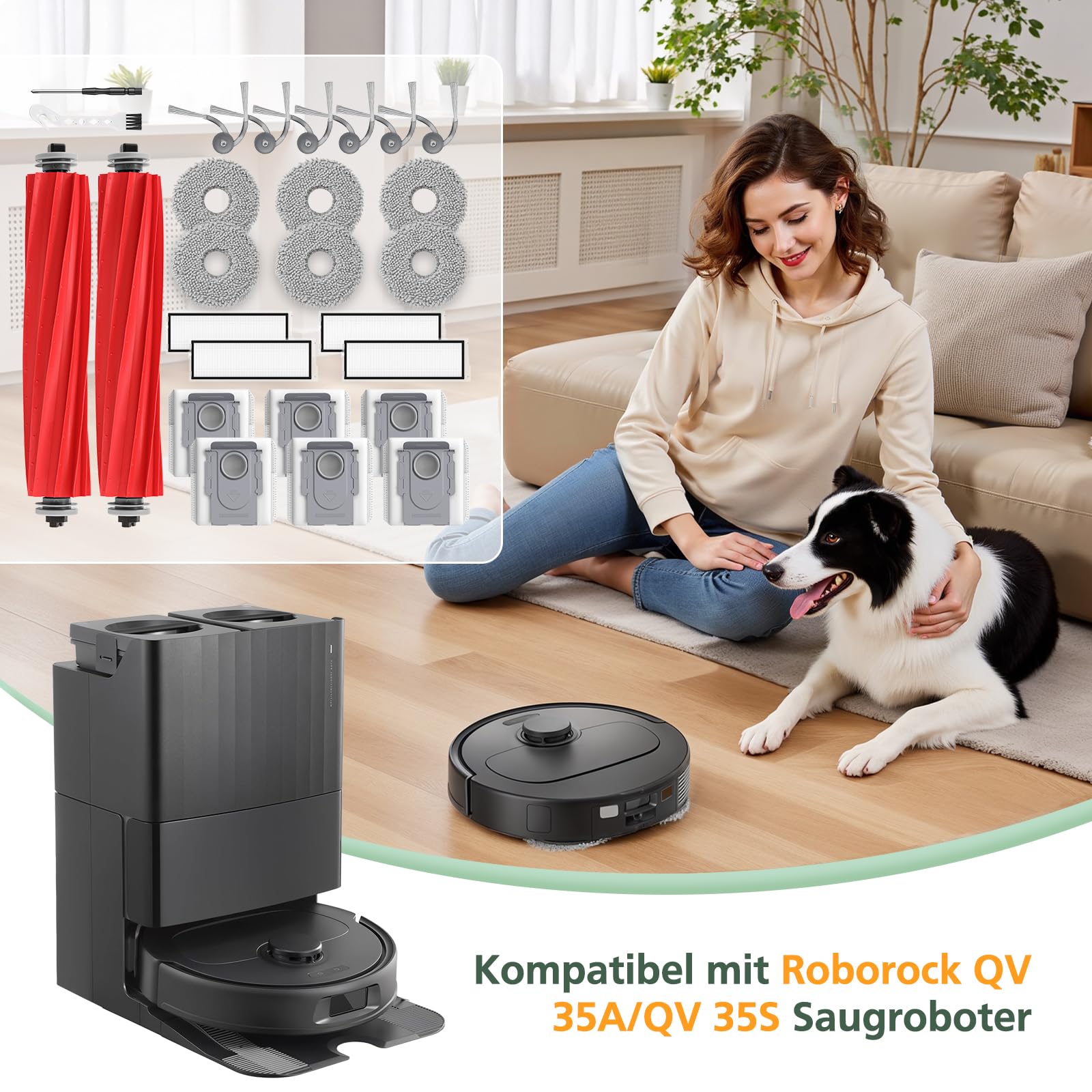 26 Stück Zubehör Ersatzteile für Roborock QV 35A/QV 35S Saugroboter, 2 Rollenbürste, 4 HEPA-Filter, 6 Staubbeutel, 6 Wischtücher, 6 Seitenbürsten, 1 Reinigungsbürste