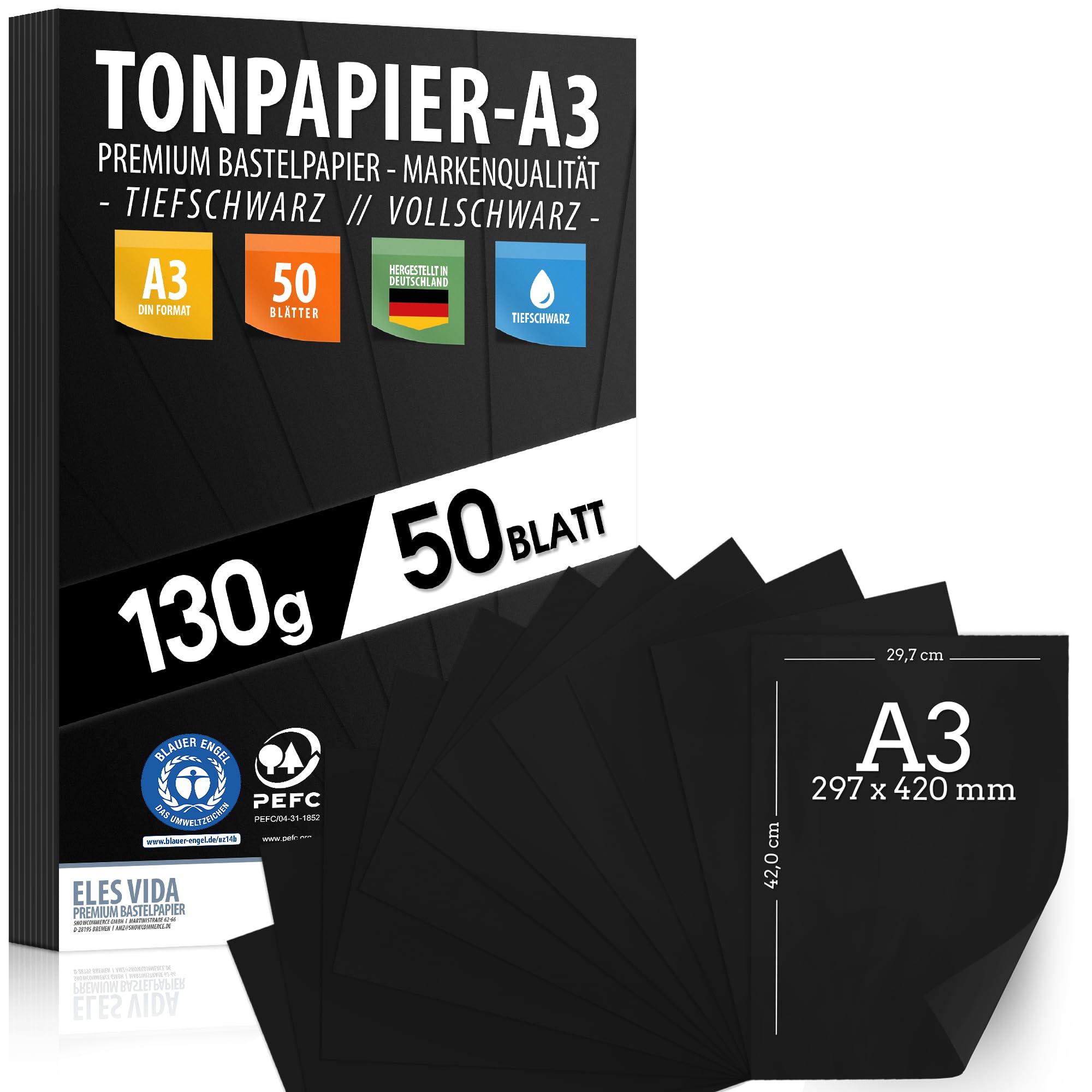 50 Blatt Tonpapier PROFI Tonzeichenpapier DIN A3-130g/m² Tiefschwarz - Festes Papier für DIY, Hobby, Schule, Uni, Zeichnen, Bastel Zubehör für Malen, Kreide und Geschenke MADE IN DEUTSCHLAND