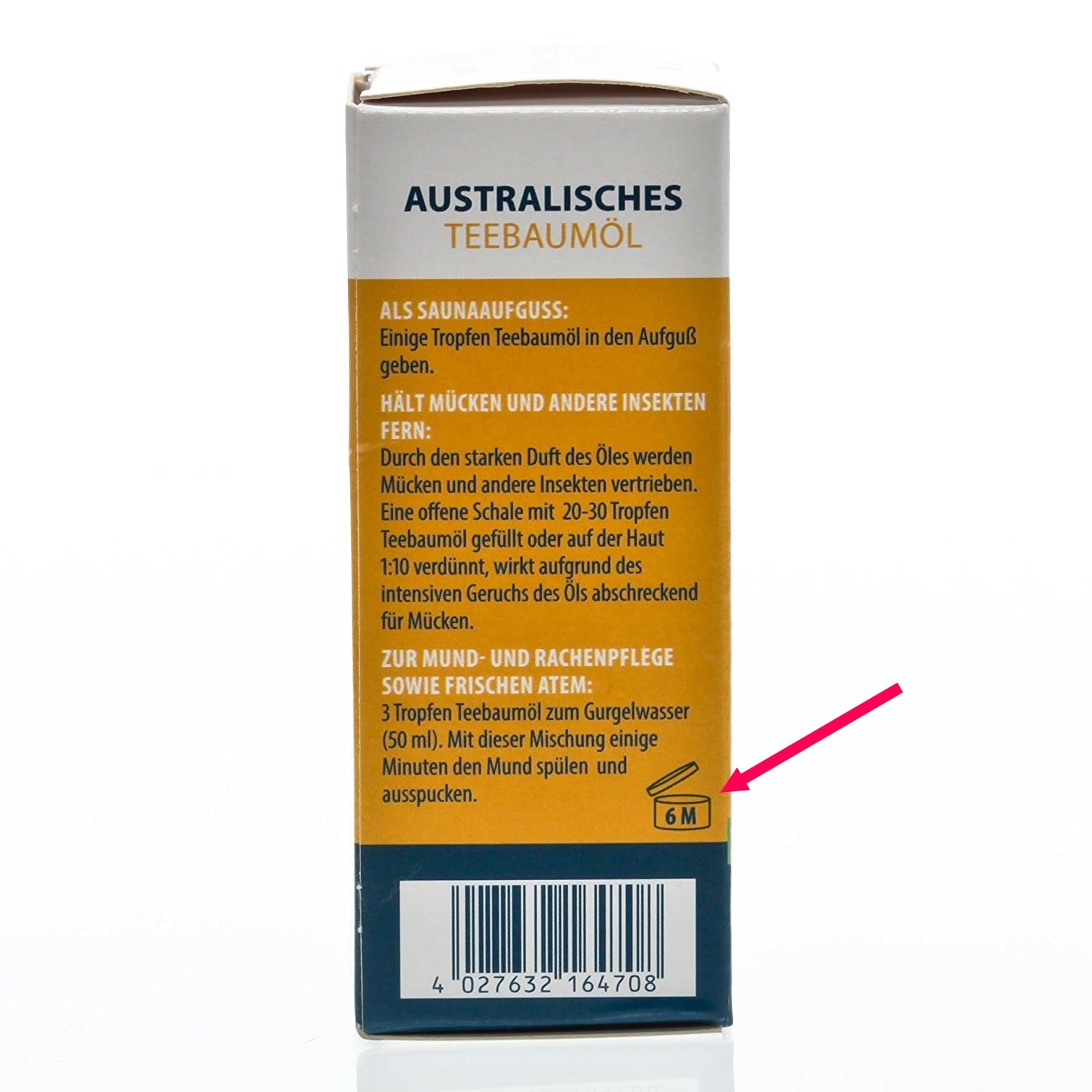 • WICHTIG! : Dieses Produkt ist ein Kosmetikum mit einer Haltbarkeit von über 30 Monaten. Laut Kosmetikverordnung ist somit kein Mindesthaltbarkeitsdatum auf der Verpackung, sondern es ist das Symbol eines geöffneten Cremetiegels aufgedruckt (Bild 3), bei dem die Verwendungsdauer nach der Öffnung steht: Das Symbol und die Angabe "6 M" sagen aus, dass dieses Produkt nach der Öffnung für die erste Anwendung noch 6 Monate lang angewendet werden kann.