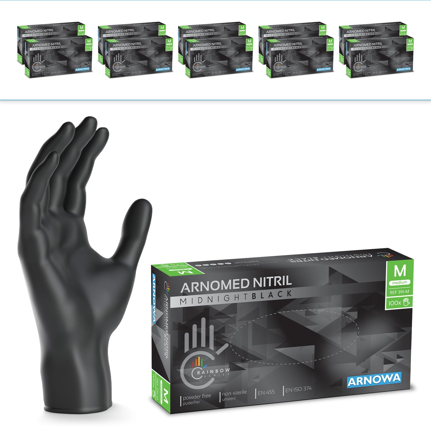 1000 Stück (10x100) ARNOMED Einweghandschuhe Schwarz, Einmalhandschuhe M, Nitril Handschuhe Einweg, Nitrilhandschuhe puderfrei, Gummihandschuhe Einweg, Schutzhandschuhe Nitril in XS, S, M, L, XL, XXL