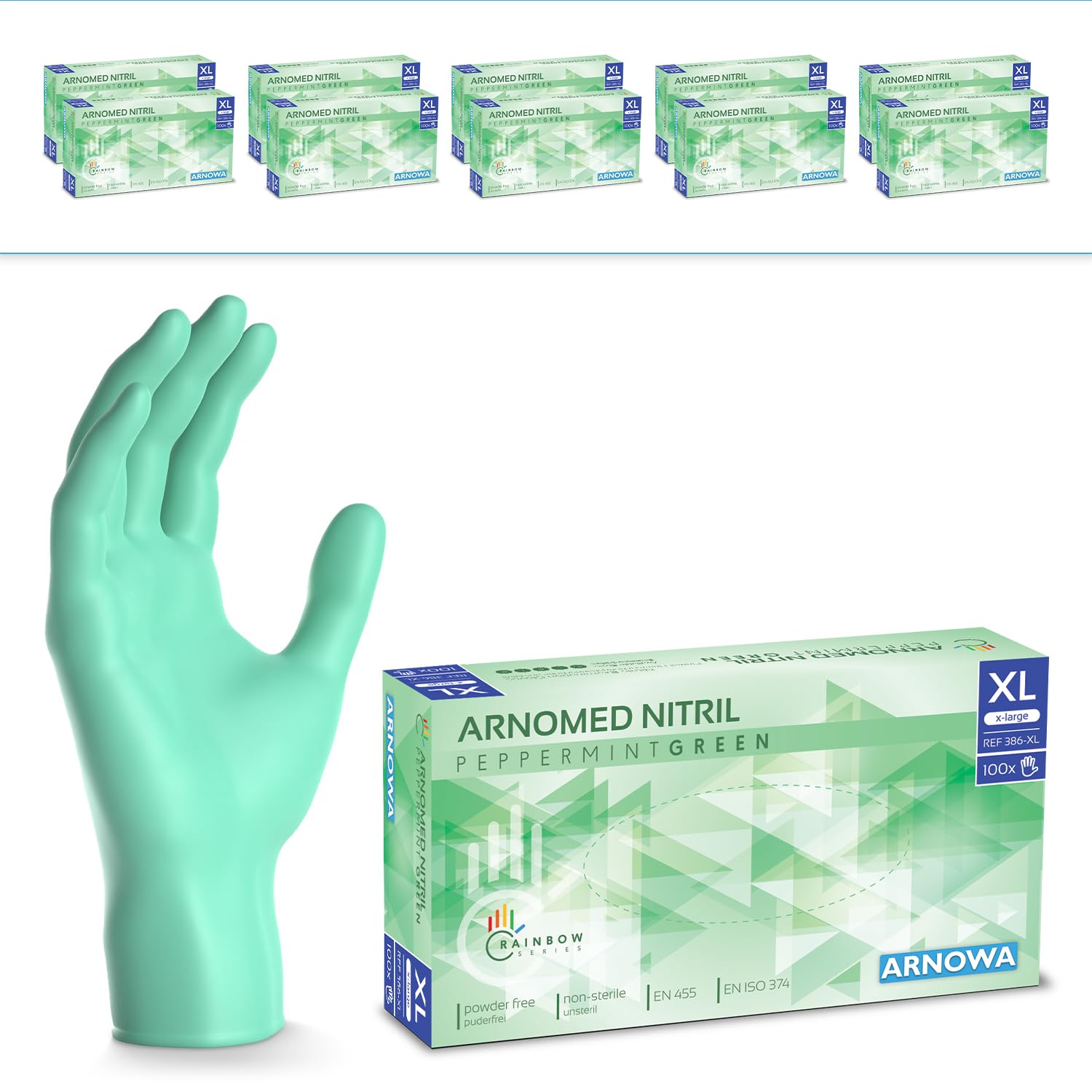 1000 Stk (10x100) ARNOMED Einweghandschuhe Grün, Einmalhandschuhe XL, Nitril Handschuhe Einweg, Nitrilhandschuhe puderfrei, Gummihandschuhe Einweg, Schutzhandschuhe, Handschuhe Nitril XS, S, M, L, XL