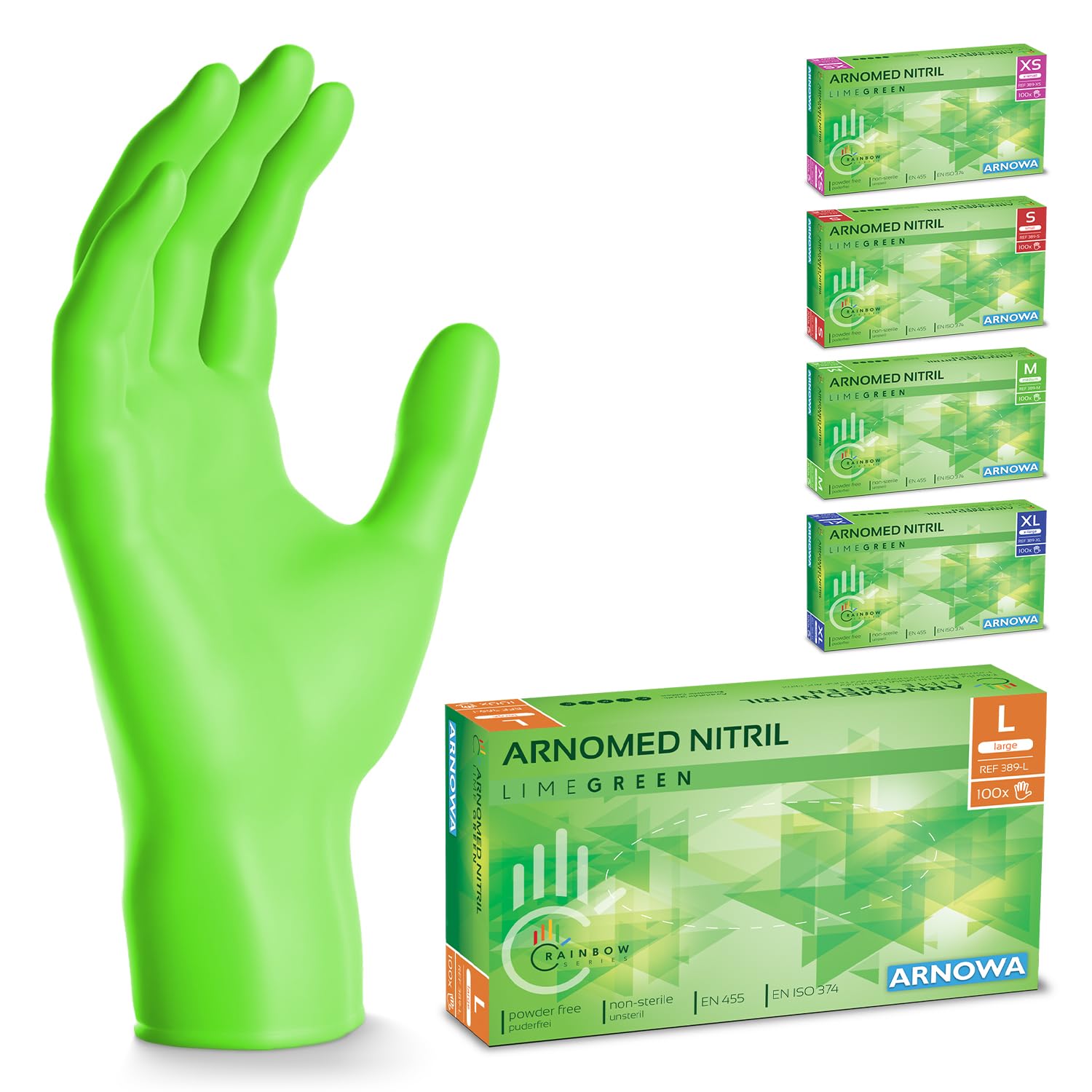 500 Stück ARNOMED Einweghandschuhe Grün, Einmalhandschuhe L, Nitril Handschuhe Einweg, Nitrilhandschuhe puderfrei, Gummihandschuhe Einweg, Schutzhandschuhe, Handschuhe Nitril in XS, S, M, L, XL