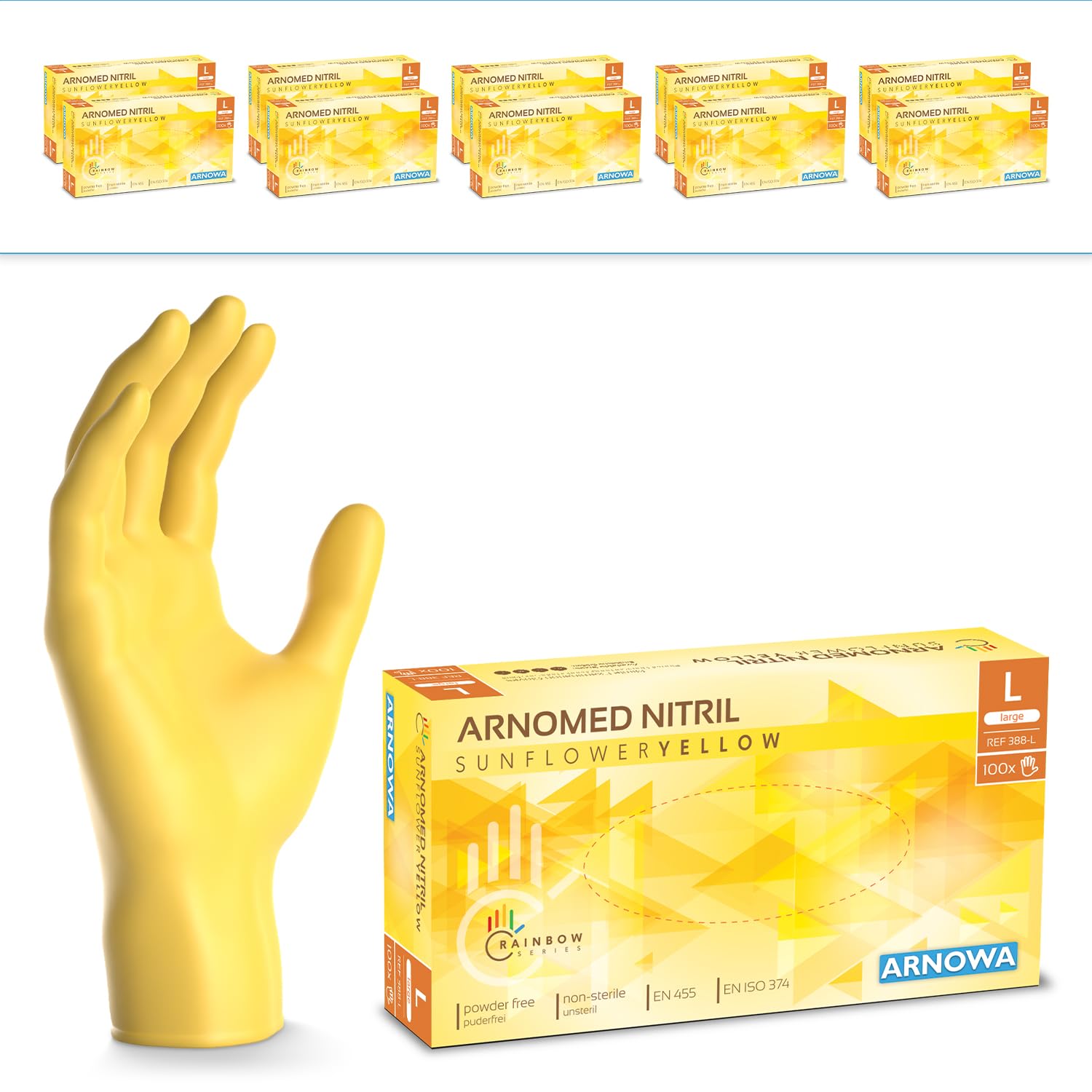 1000 Stk (10x100) ARNOMED Einweghandschuhe Gelb, Einmalhandschuhe L, Nitril Handschuhe Einweg, Nitrilhandschuhe puderfrei, Gummihandschuhe Einweg, Schutzhandschuhe, Handschuhe Nitril in S, M, L, XL