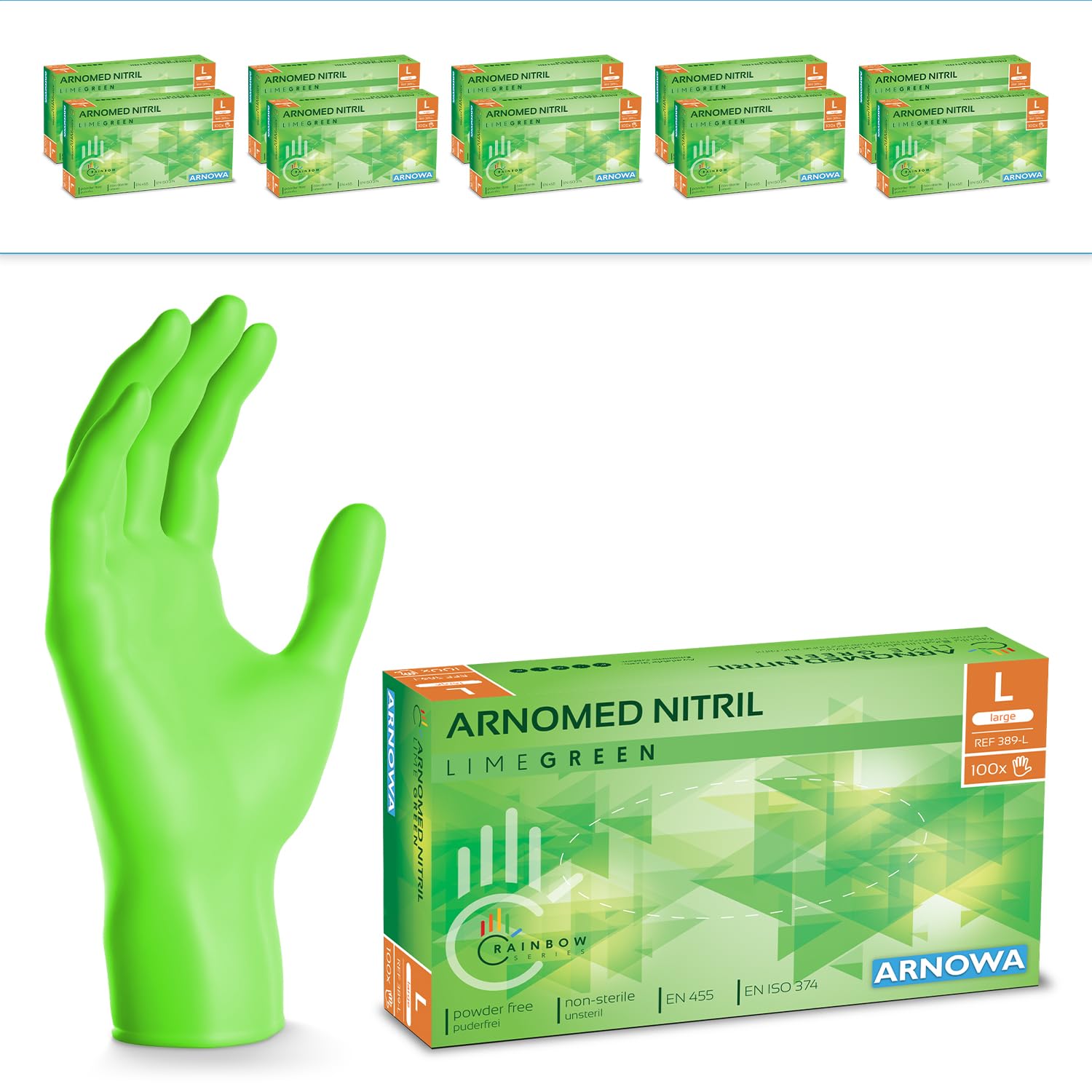 1000 Stück ARNOMED Einweghandschuhe Grün, Einmalhandschuhe L, Nitril Handschuhe Einweg, Nitrilhandschuhe puderfrei, Gummihandschuhe Einweg, Schutzhandschuhe, Handschuhe Nitril in XS, S, M, L, XL