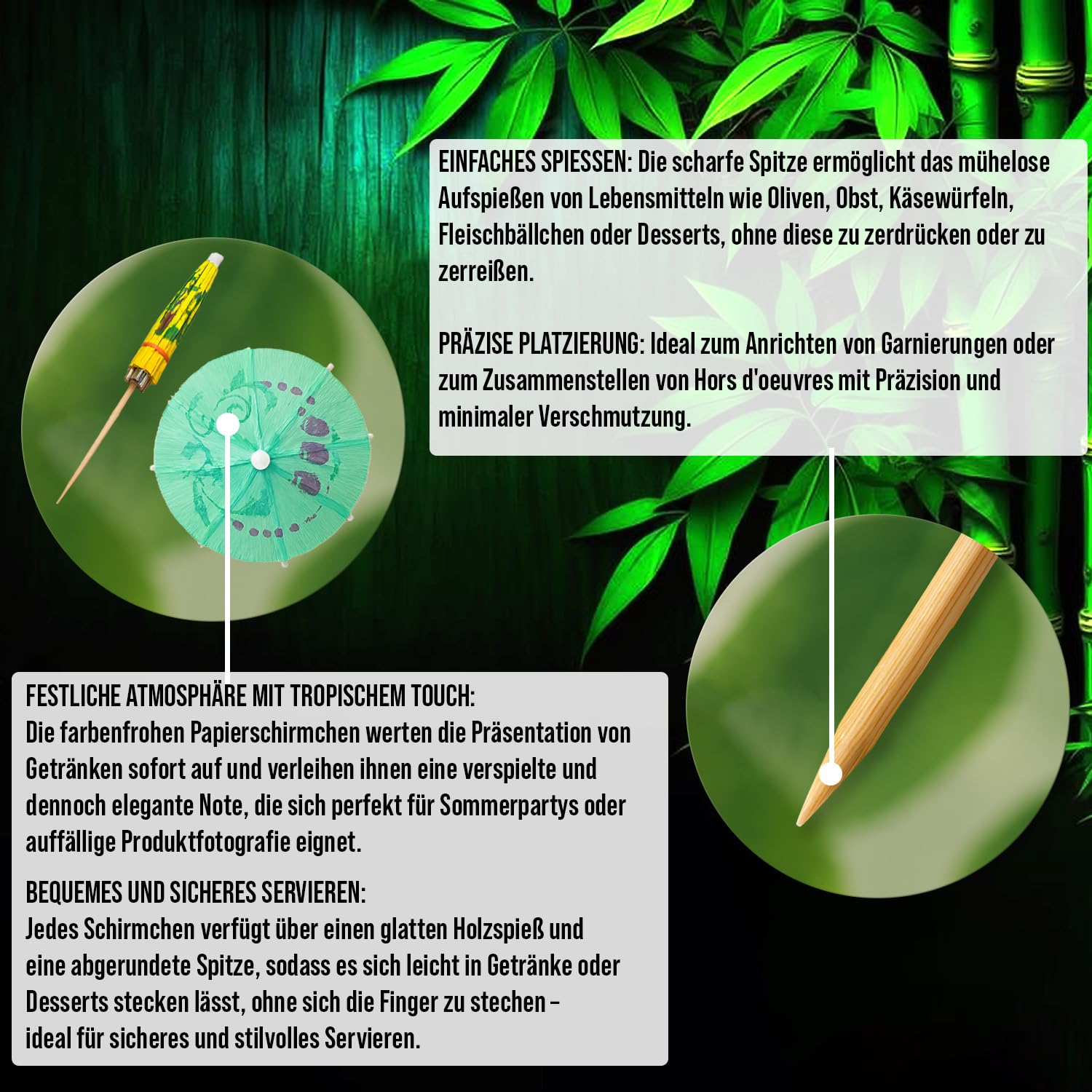 Was Du Bekommst - Enthält 220 gemischte Bambus-Schirmchen in leuchtenden tropischen Farben und verschiedenen Designs. Jeder Mini-Sonnenschirm besteht aus lebensmittelsicheren Materialien, darunter robustes Papier und ein stabiler Holzspiess - ideal zur Dekoration von Cocktails, Desserts, Vorspeisen und mehr. Dieses Vorteilspack ist perfekt für kleine Partys, Motto-Events oder die tägliche Unterhaltung.