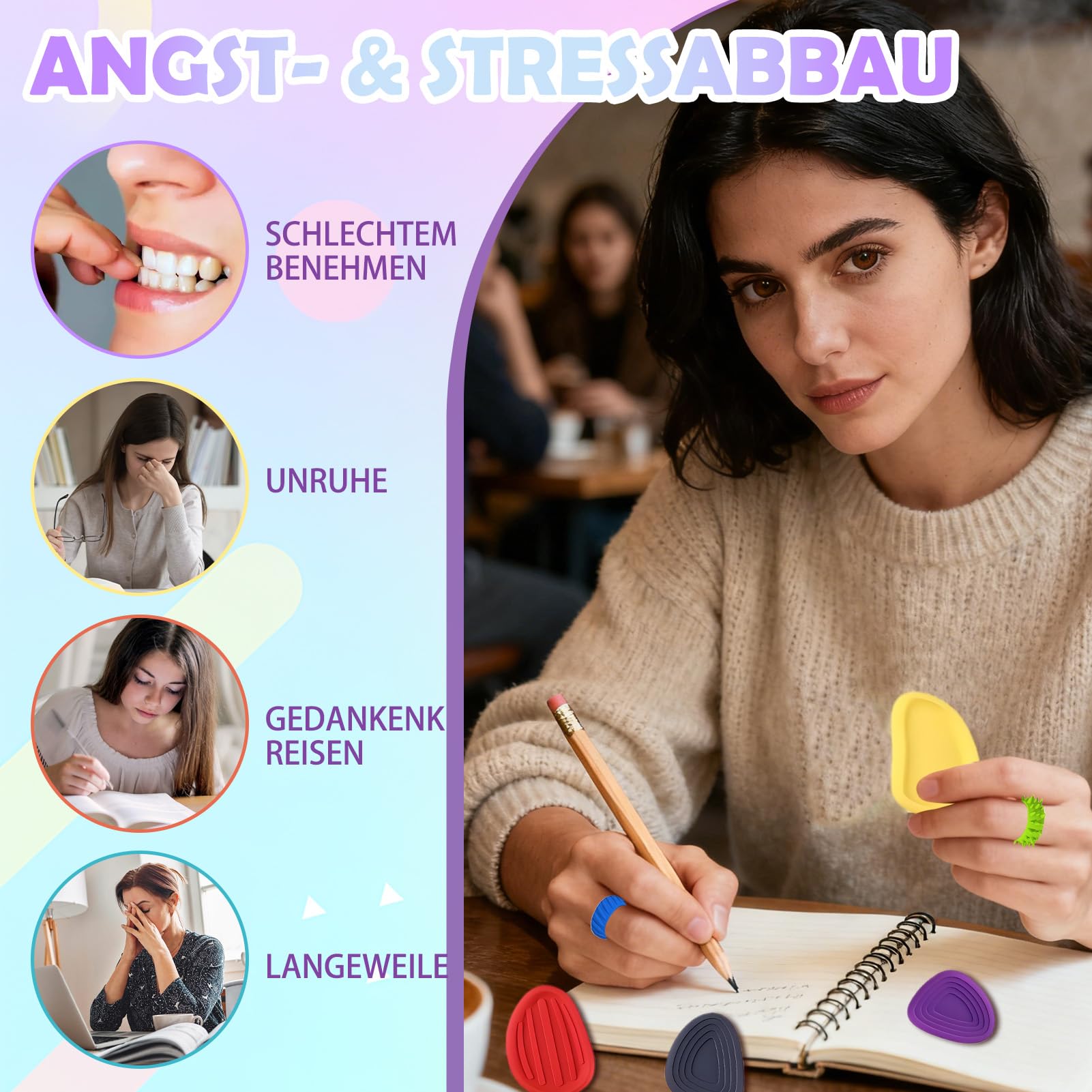 • Leise und tragbar -- Hergestellt aus weichem Silikon, leicht und einfach zu transportieren. Die Anwendung ist geräuschlos, geeignet für Klassenraum, Büro oder unterwegs. Einfaches Reiben und Drehen bietet Entspannung, ohne andere zu stören.