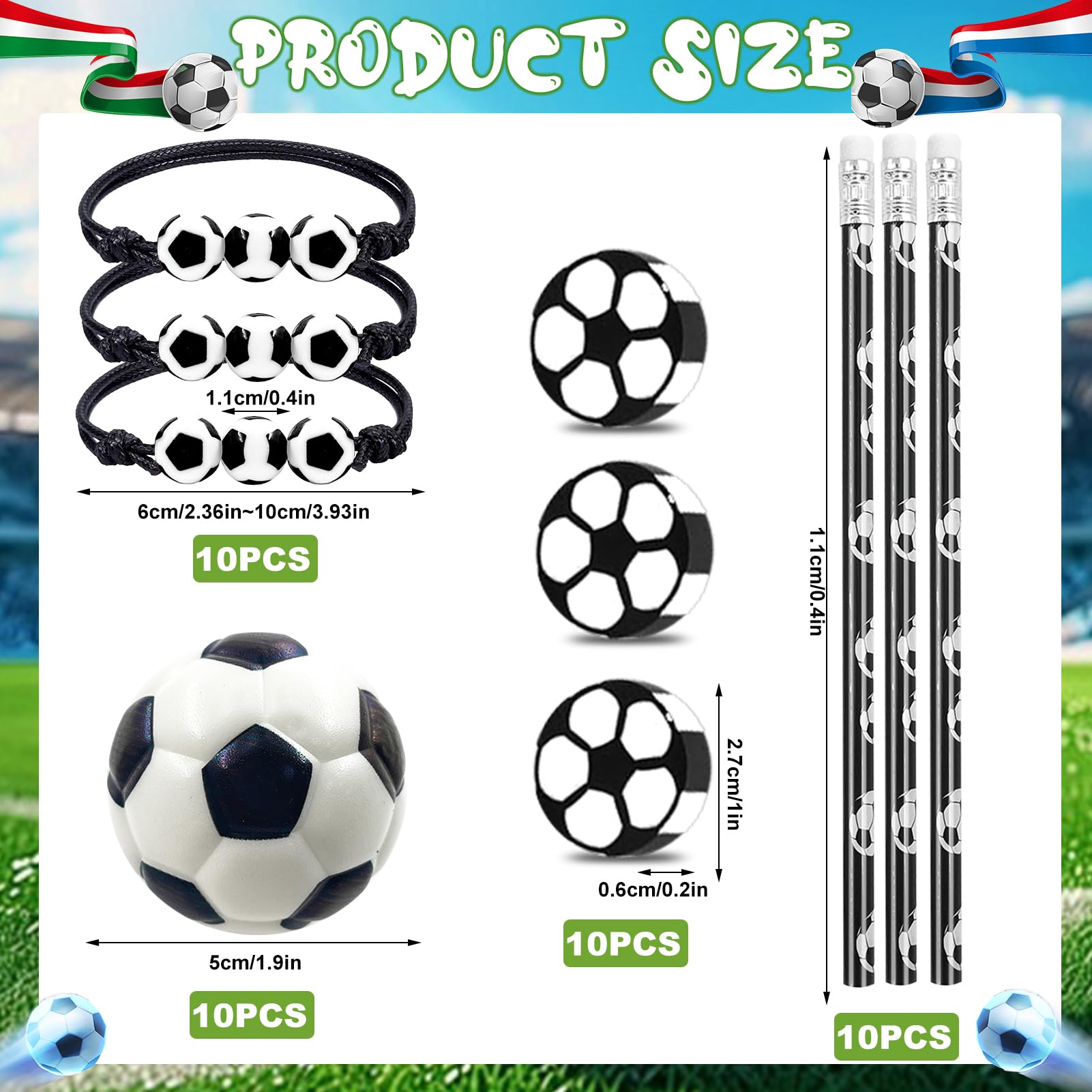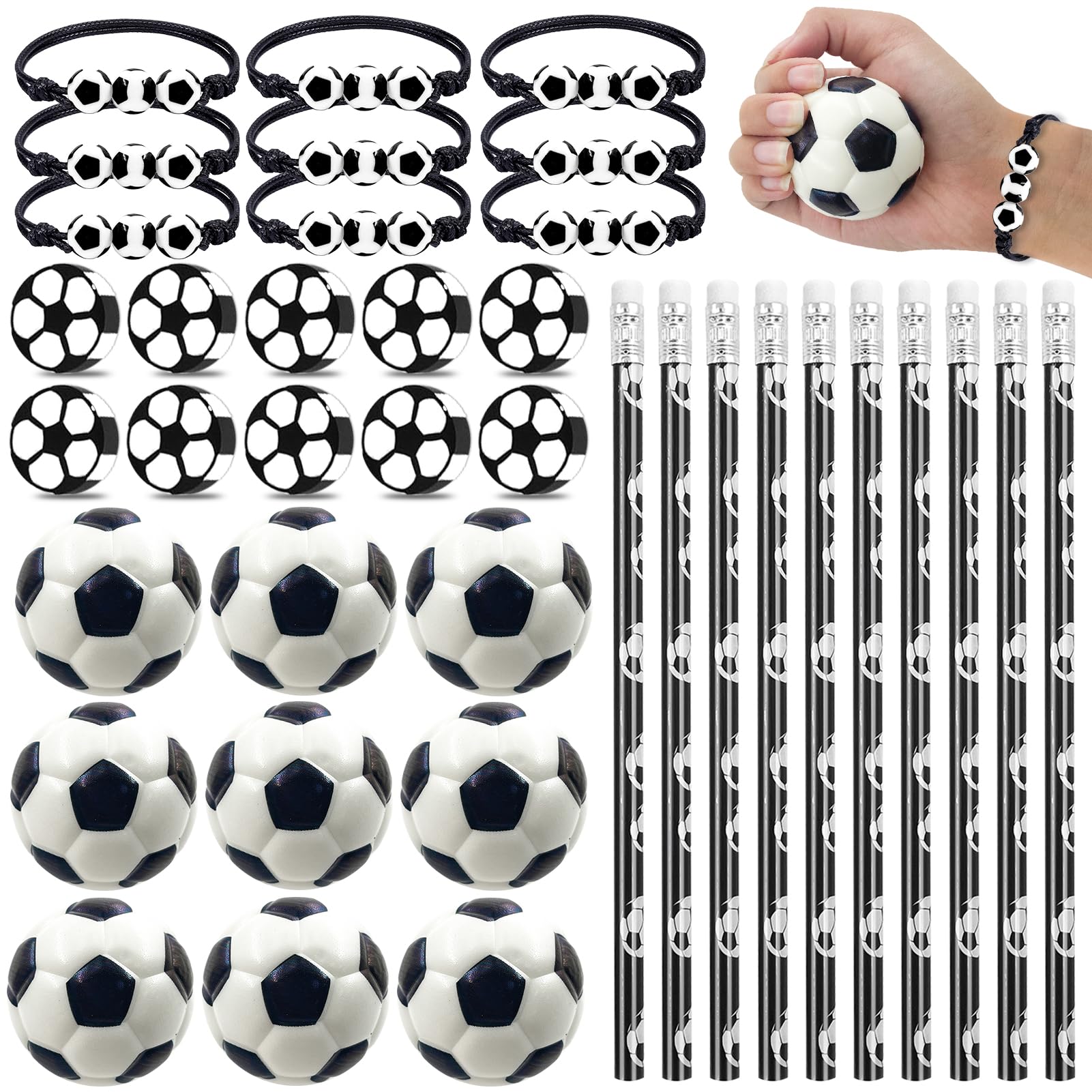• 【Fussball-Partypaket】: 10*kleine Fussbälle, 10*HB-Fussballbleistifte, 10*Fussball-Radiergummis, 10*Fussballarmbänder, insgesamt 40. Fussballdurchmesser: 5 cm. Es ist sowohl ein Spielzeug als auch ein Lernschreibwaren, voller Spass und praktisch, geeignet für Kinder, die Fussball mögen oder Fussballfans sind.