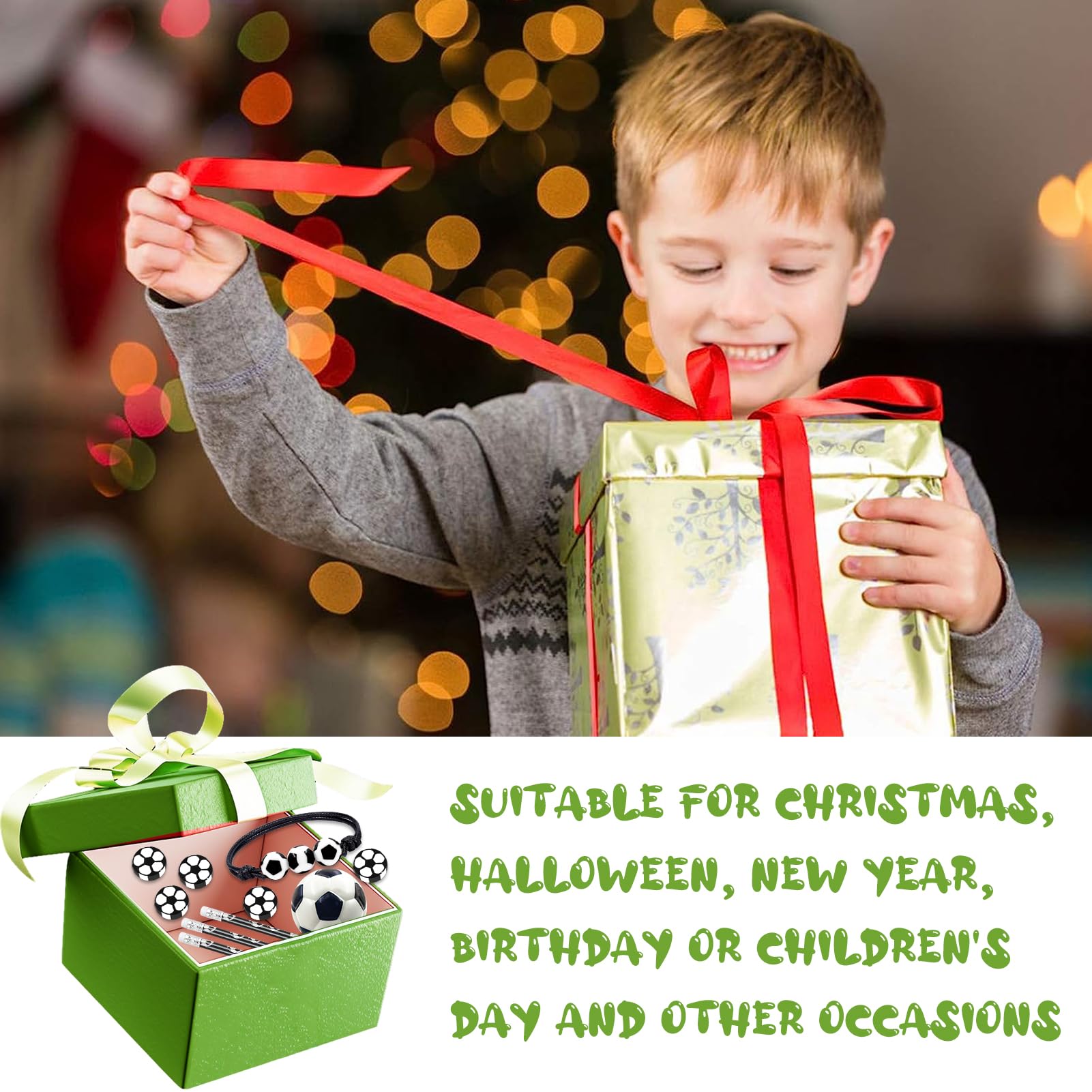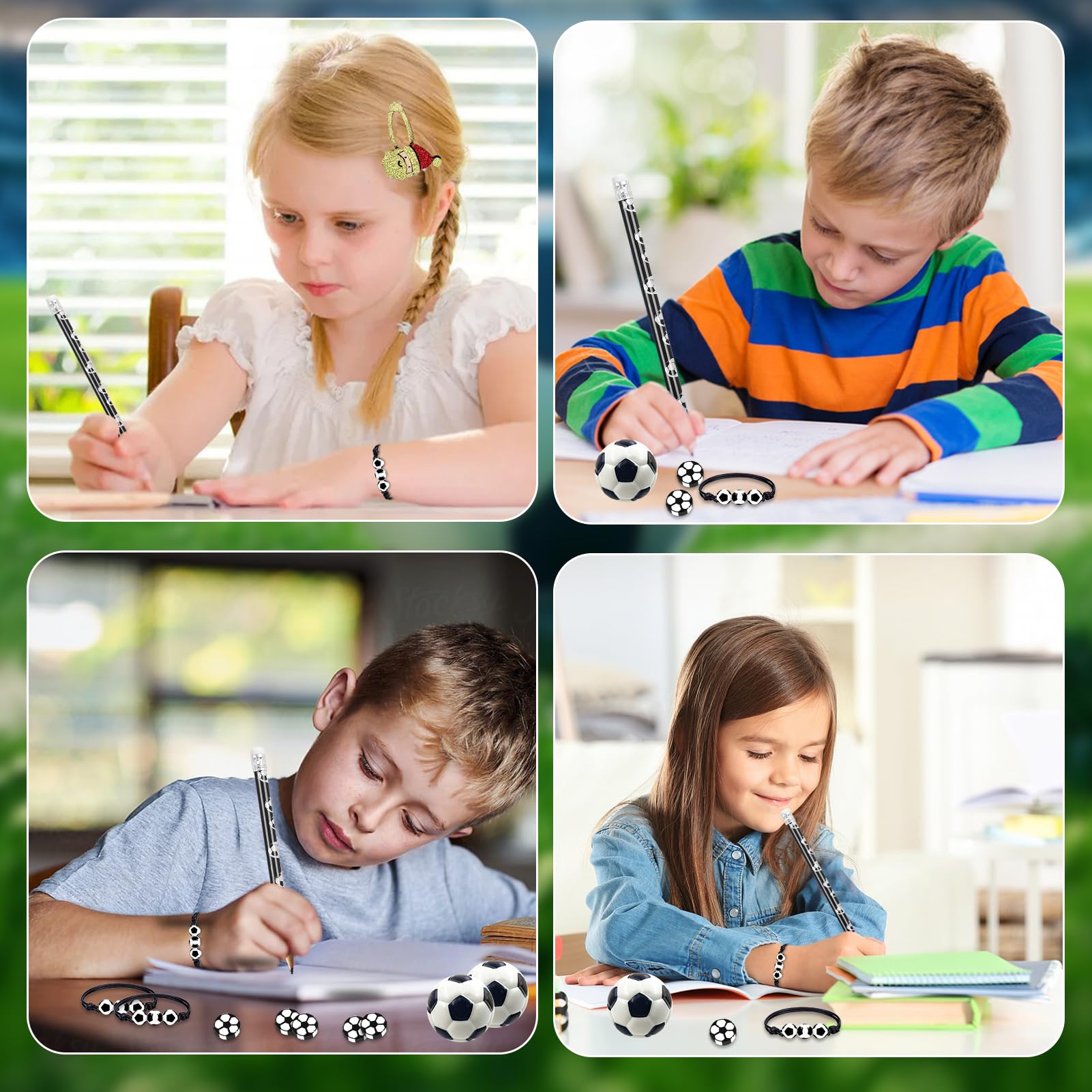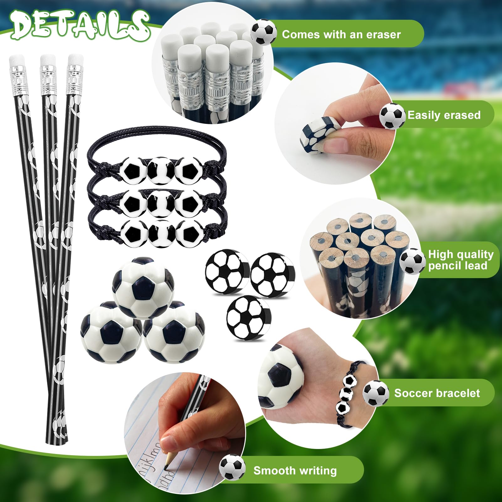 • 【Fussball-Schreibwaren】: Dieses Fussballparty-Paket für Kindergeburtstage enthält Bleistifte und Radiergummis mit Fussballmustern, die sowohl praktisch als auch sportlich sind und auch Spass beim Schreiben bringen können, sodass Kinder auch beim Lernen die Vitalität des Fussballs spüren können.