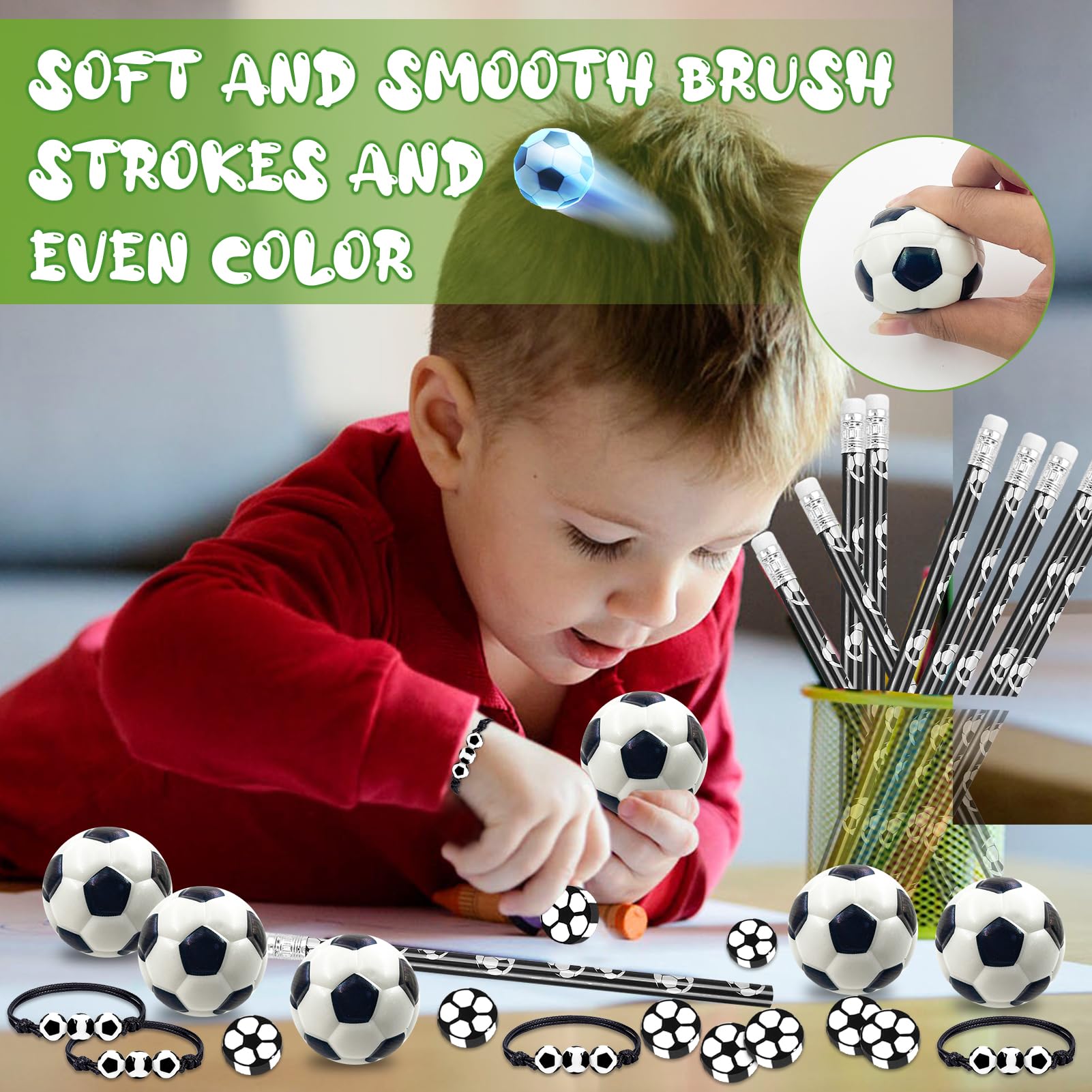 • 【Langlebige Qualität】: Fussball-Quetschspielzeuge haben eine hohe Elastizität, egal wie oft Sie sie drücken, sie behalten ihre gute Form und Elastizität und eignen sich sehr gut zum Dekomprimieren. Fussballbleistifte bestehen aus hochwertigem Holz und Graphit, haben eine einheitliche Farbe und brechen nicht leicht.