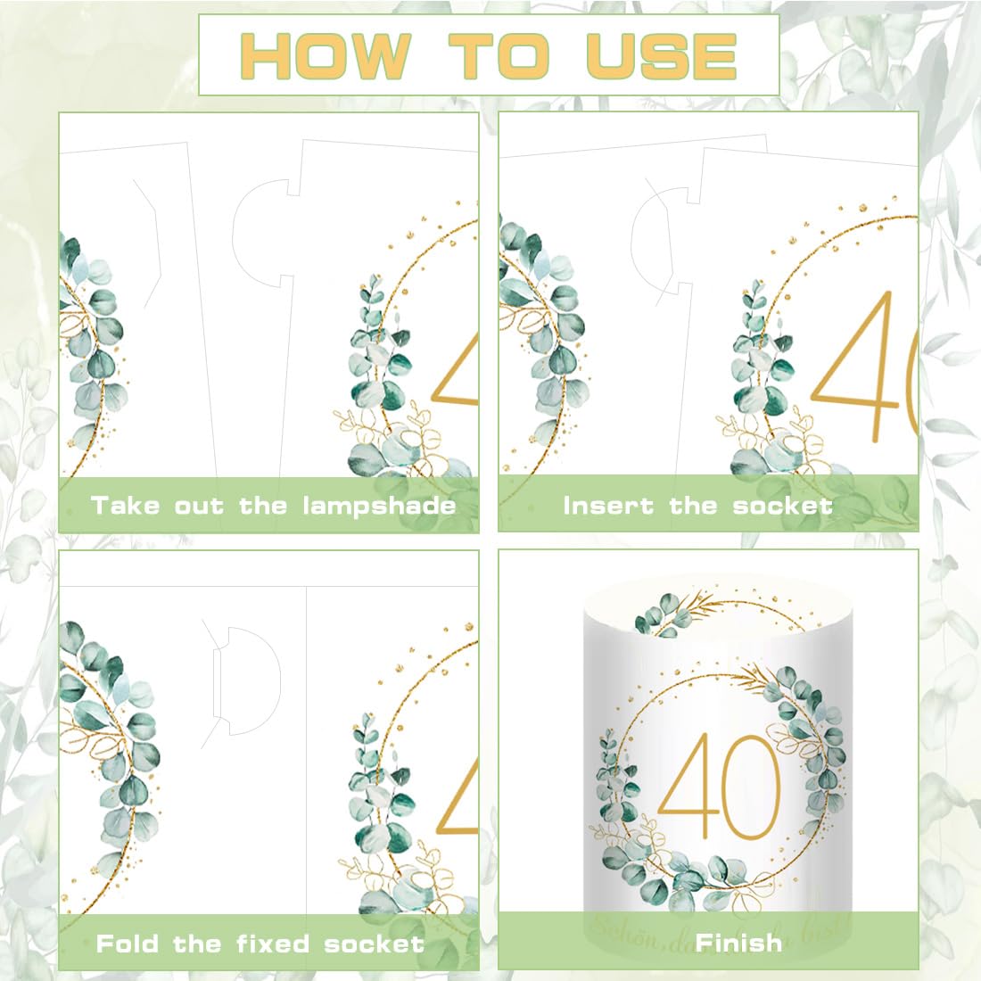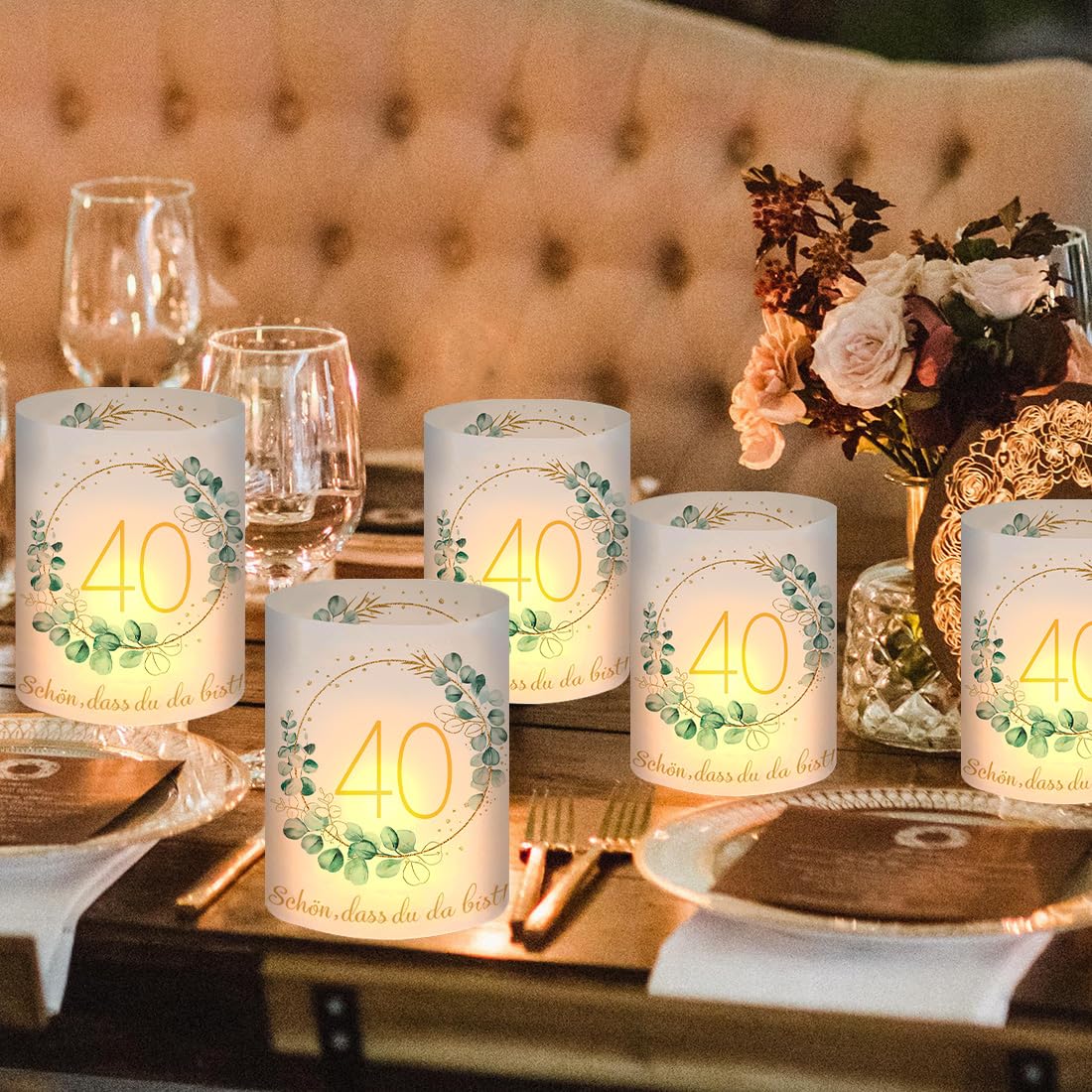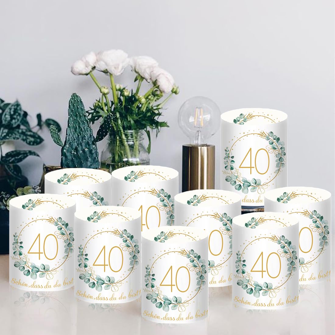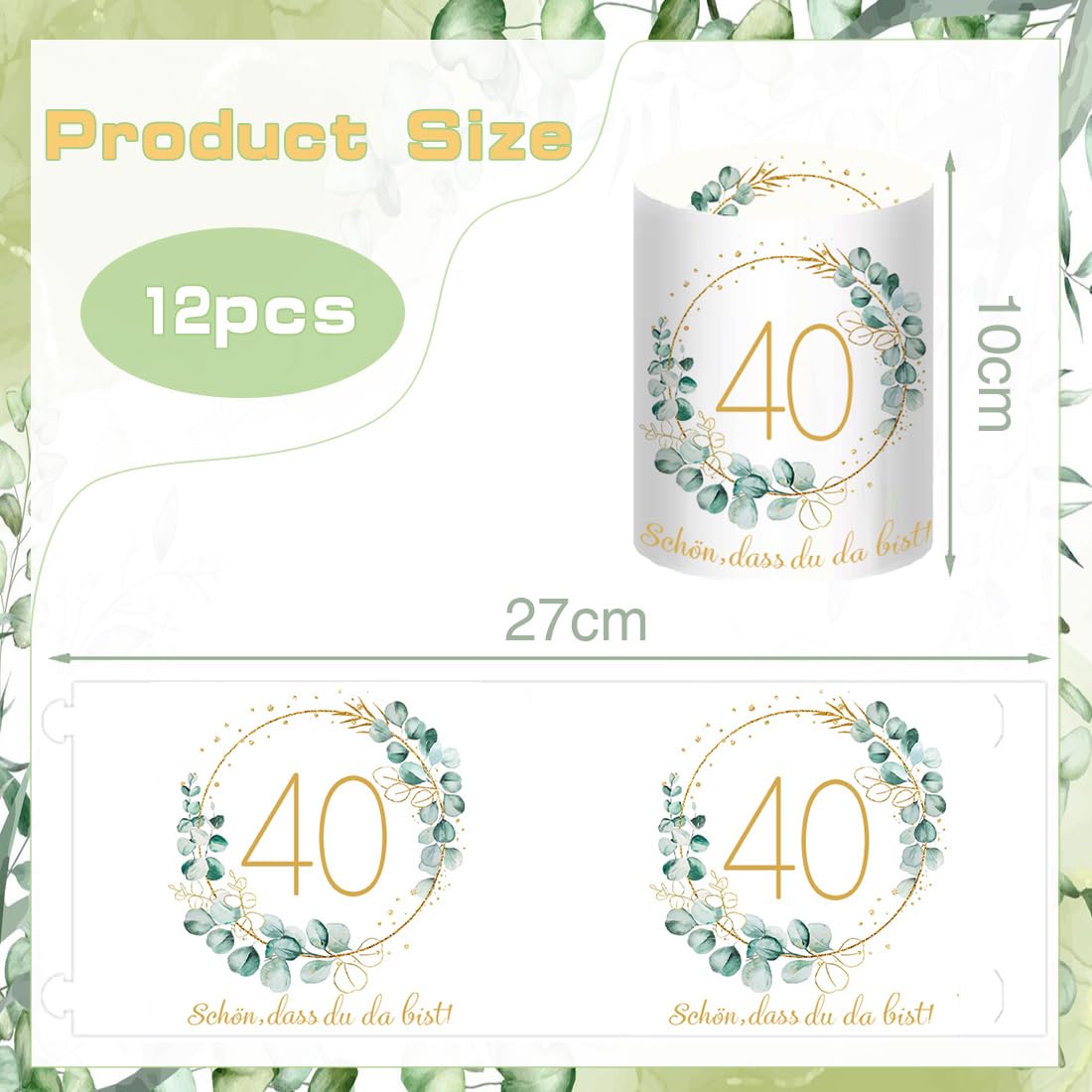 - 【Windlicht Geburtstag Tischdeko】: 12 Stück 40 Geburtstag Windlicht Tischdeko, Motiv: "40", "Schön dass du da bist" und Eukalyptus-Kranz. Ungefaltet Grösse: 27 * 10 cm, gefaltet Grösse: 8 * 10 cm