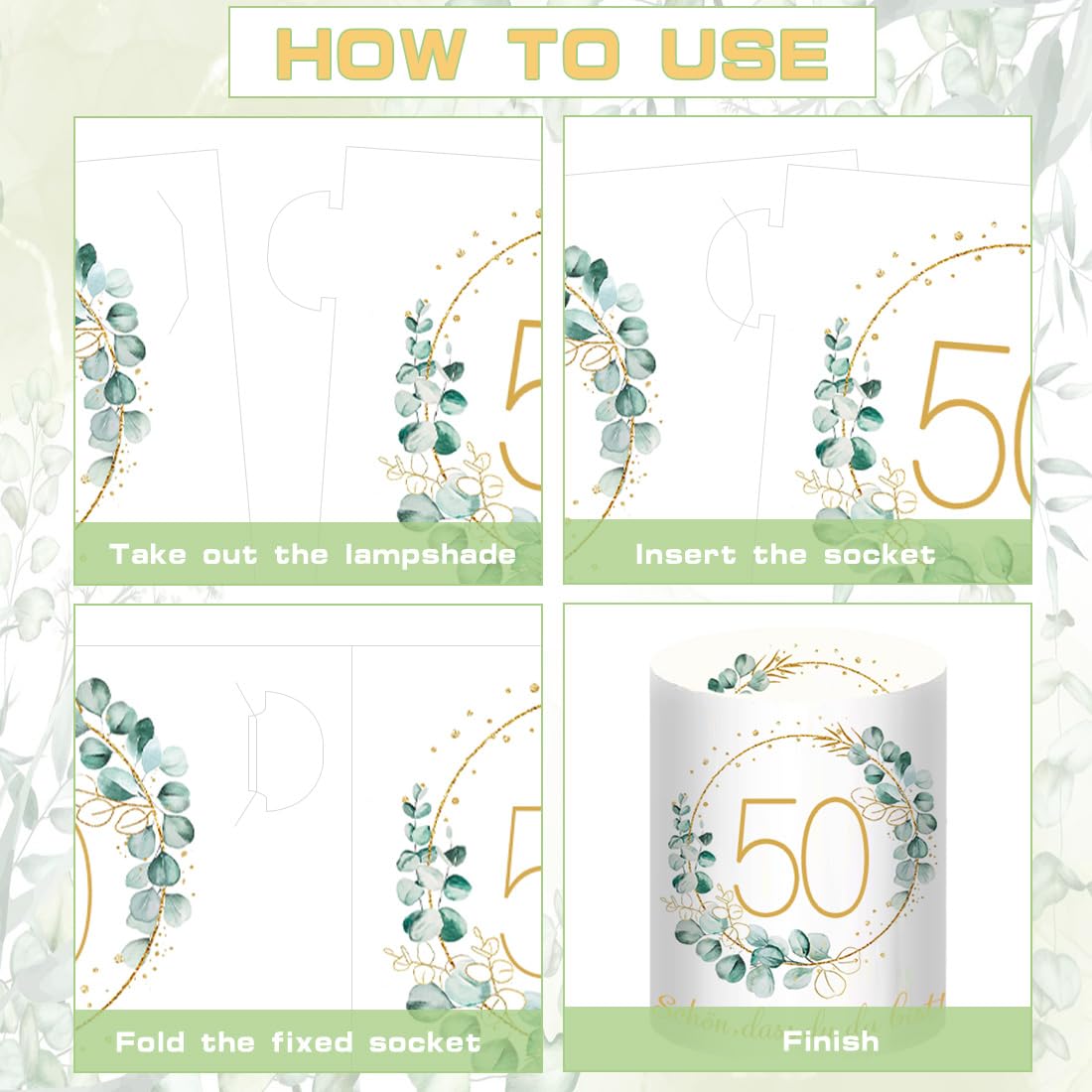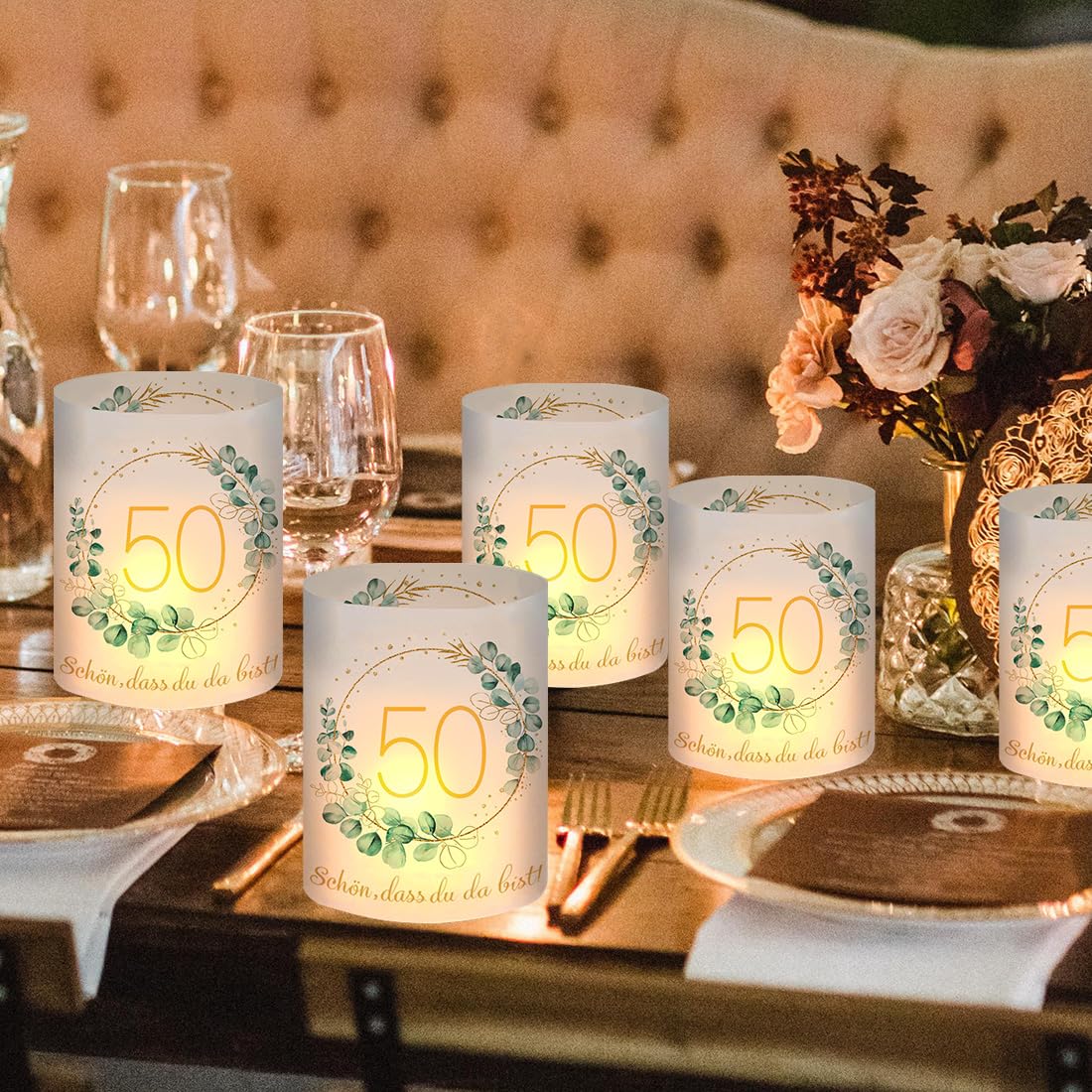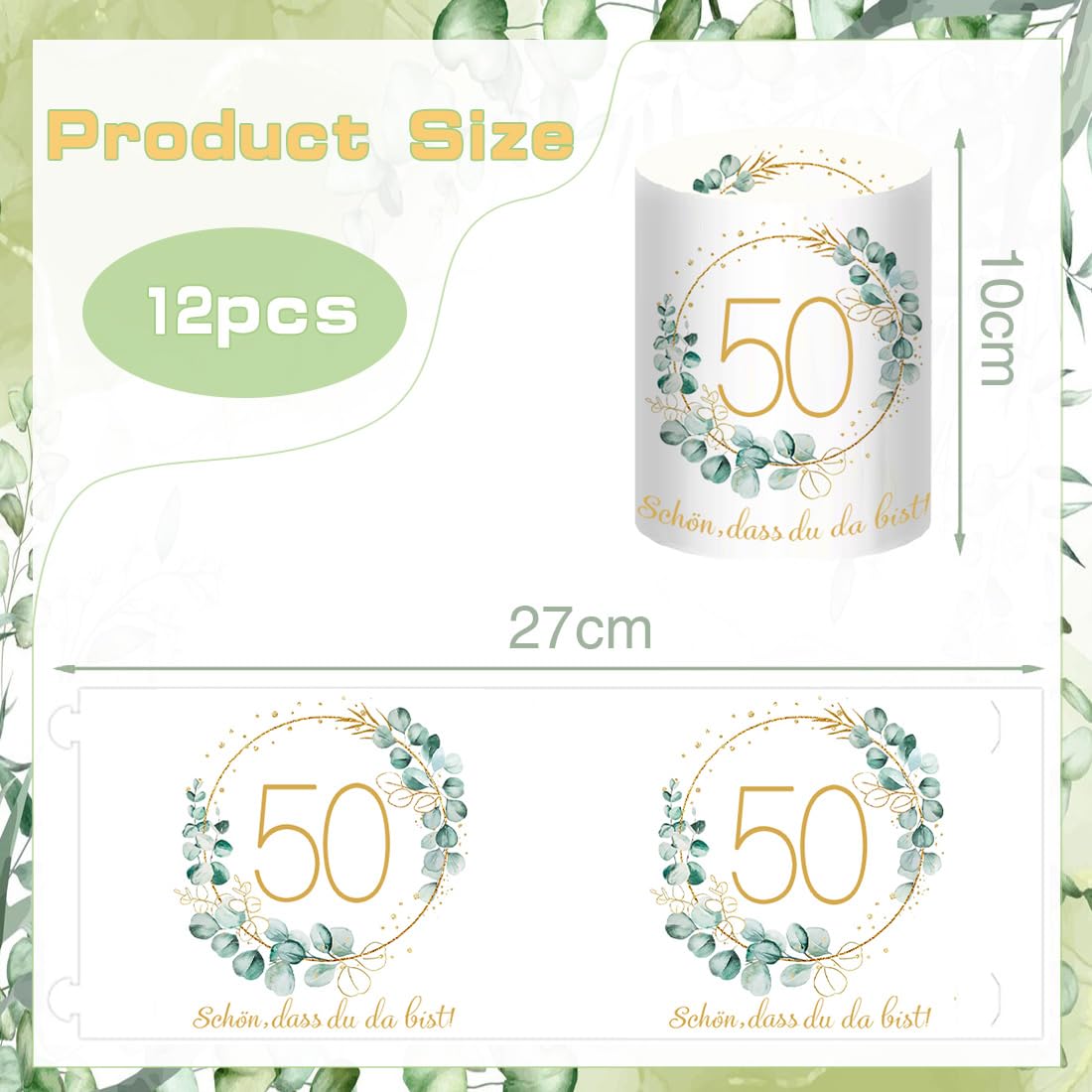- 【Windlicht Geburtstag Tischdeko】: 12 Stück 50 Geburtstag Windlicht Tischdeko, Motiv: "50", "Schön dass du da bist" und Eukalyptus-Kranz. Ungefaltet Grösse: 27 * 10 cm, gefaltet Grösse: 8 * 10 cm