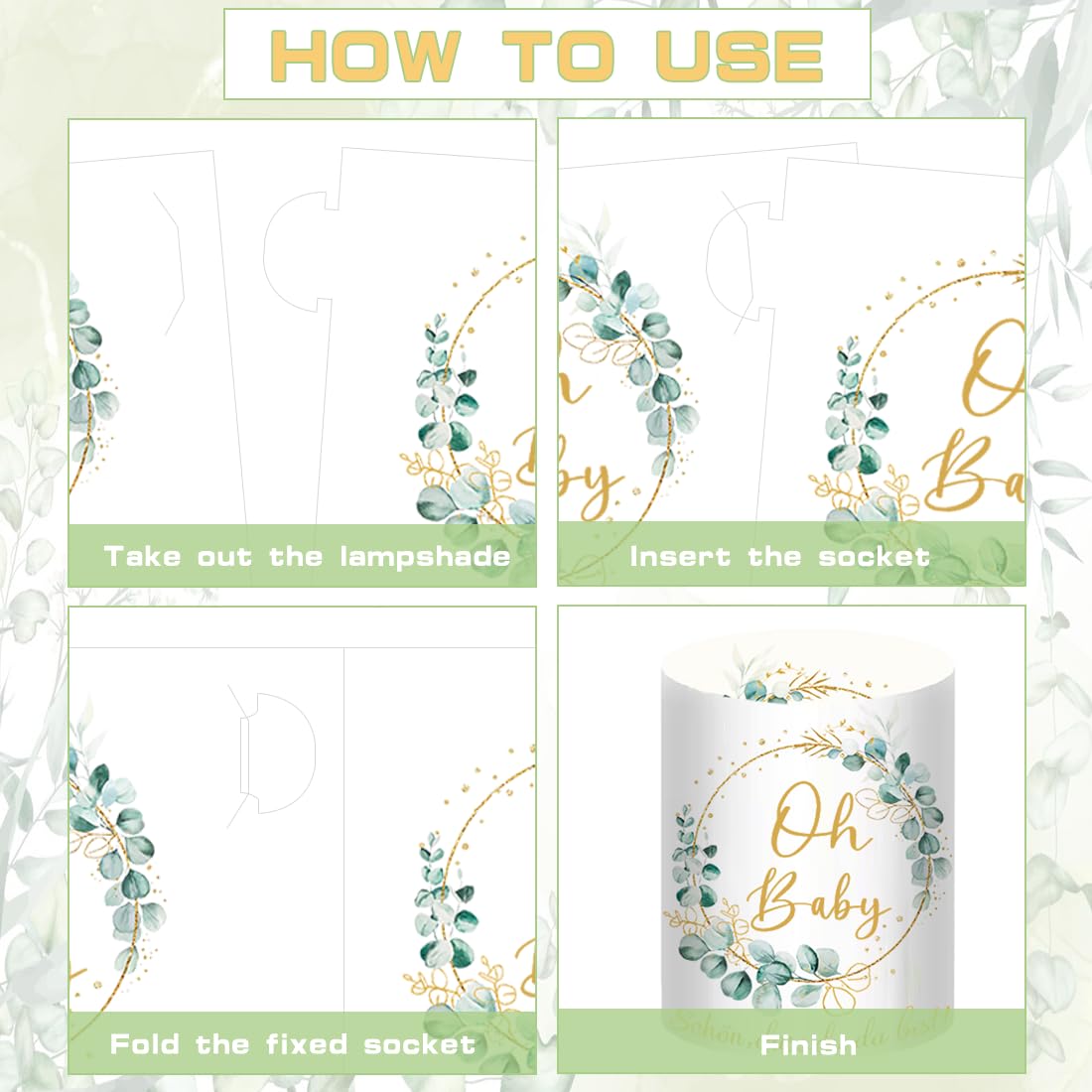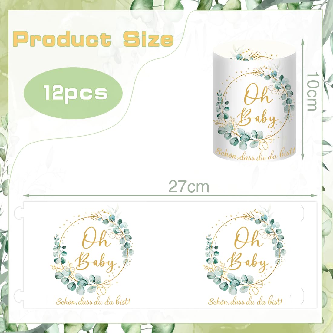 - 【Windlicht Babyparty Deko】: 12 Stück Windlicht Baby Shower Tischdeko, Bedruckt mit Oh Baby und Eukalyptus Kränzen. Ungefaltet Grösse: 27 * 10 cm, gefaltet Grösse: 8 * 10 cm