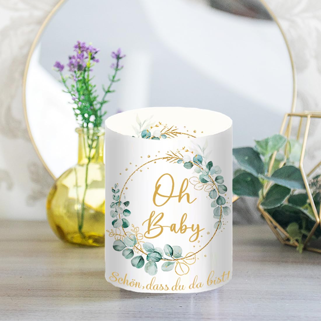 12 Windlicht Tischdeko Oh Baby, Babyshowerparty Deko Mädchen Junge, Teelichter Eukalyptus Grün Deko, Babyparty Deko Neutral, Schön DASS Du Da Bist, Geeignet Für Teelichter Oder Kerzen