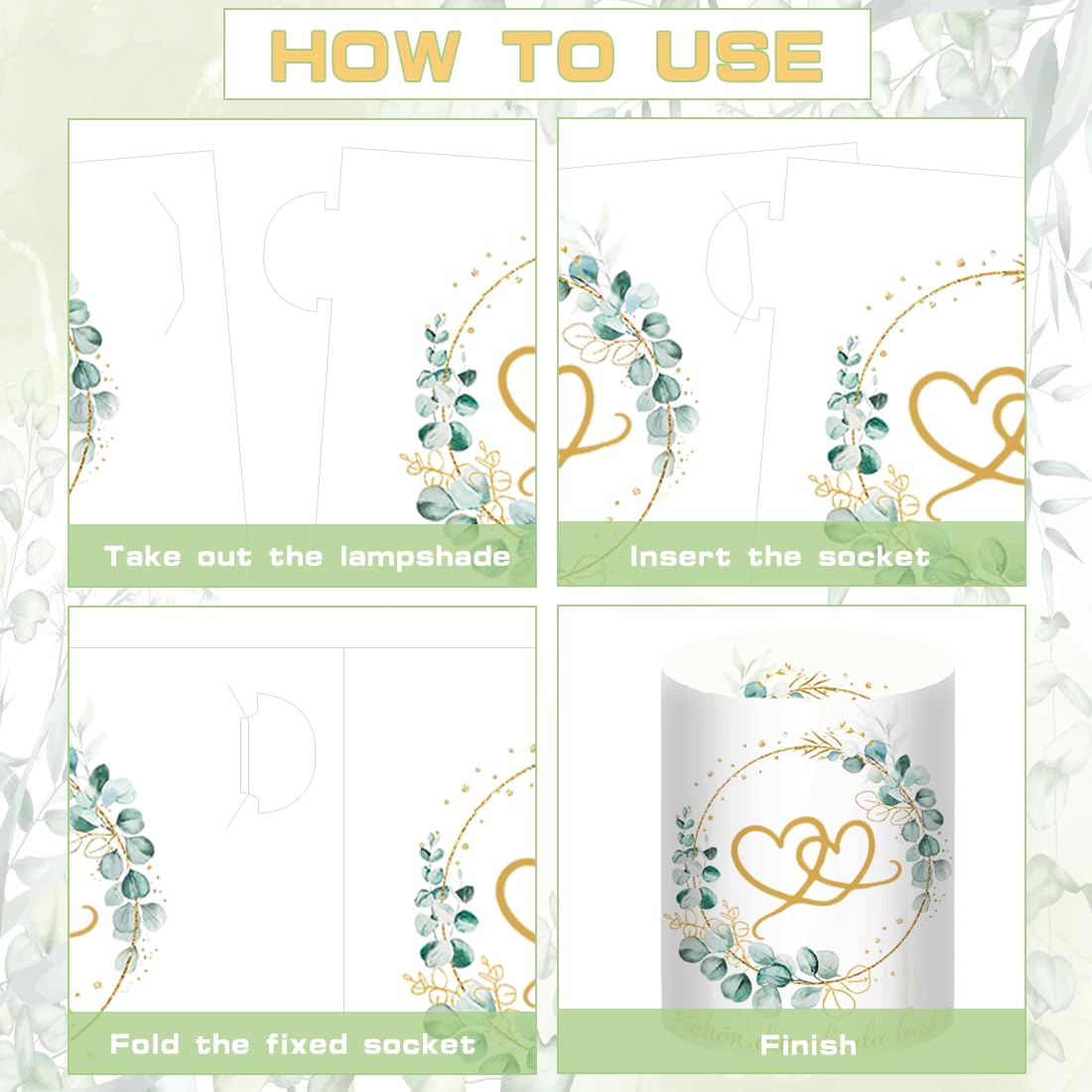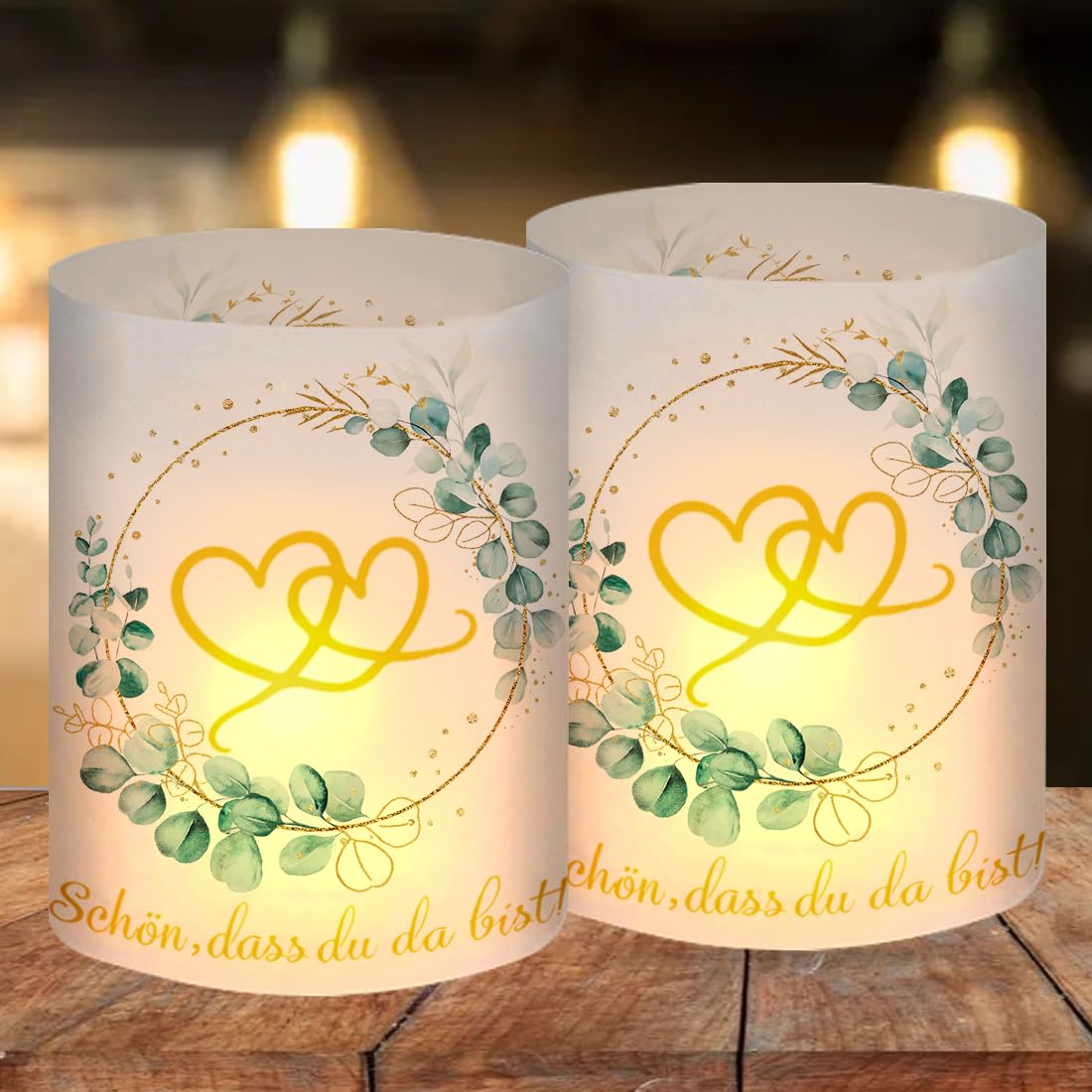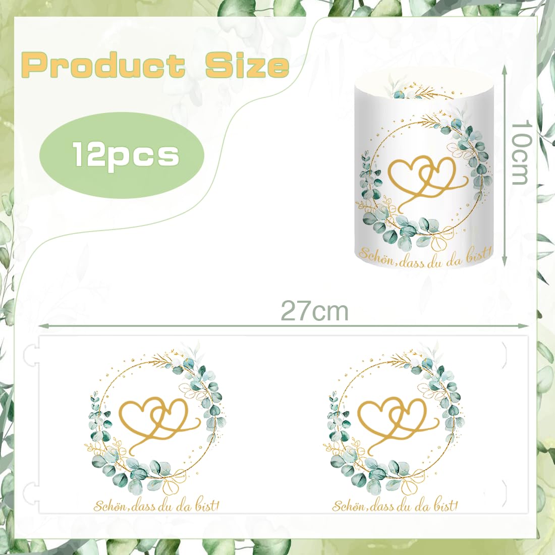 - 【Windlicht Hochzeit Deko】: 12 Stück Windlicht liebevoll Tischdeko, Bedruckt mit liebevoll und Eukalyptus Kränzen. Ungefaltet Grösse: 27 * 10 cm, gefaltet Grösse: 8 * 10 cm