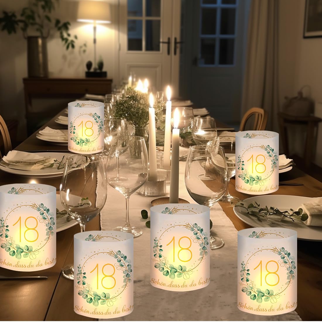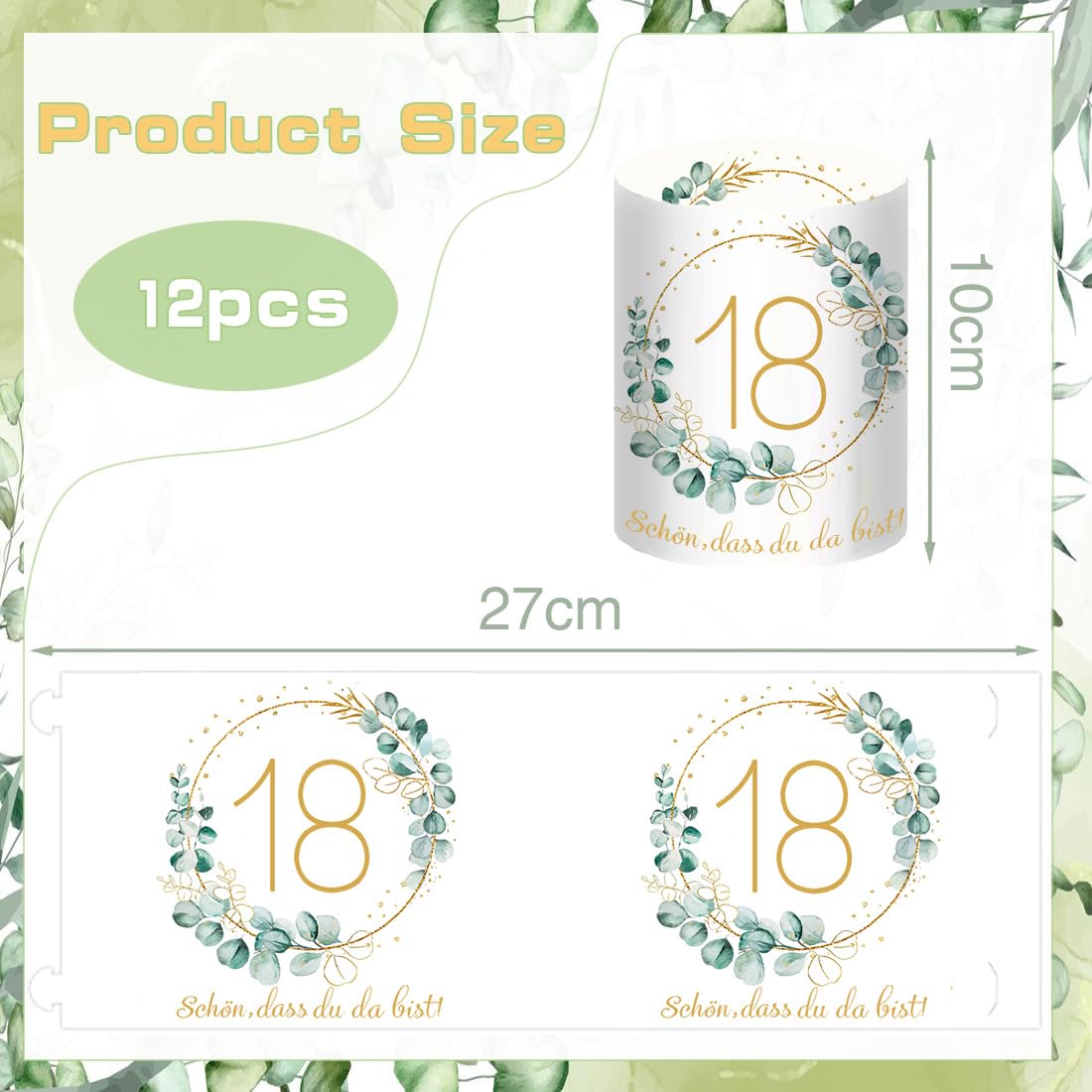 - 【Windlicht Geburtstag Tischdeko】: 12 Stück 18 Geburtstag Windlicht Tischdeko, Motiv: "18", "Schön dass du da bist" und Eukalyptus-Kranz. Ungefaltet Grösse: 27 * 10 cm, gefaltet Grösse: 8 * 10 cm