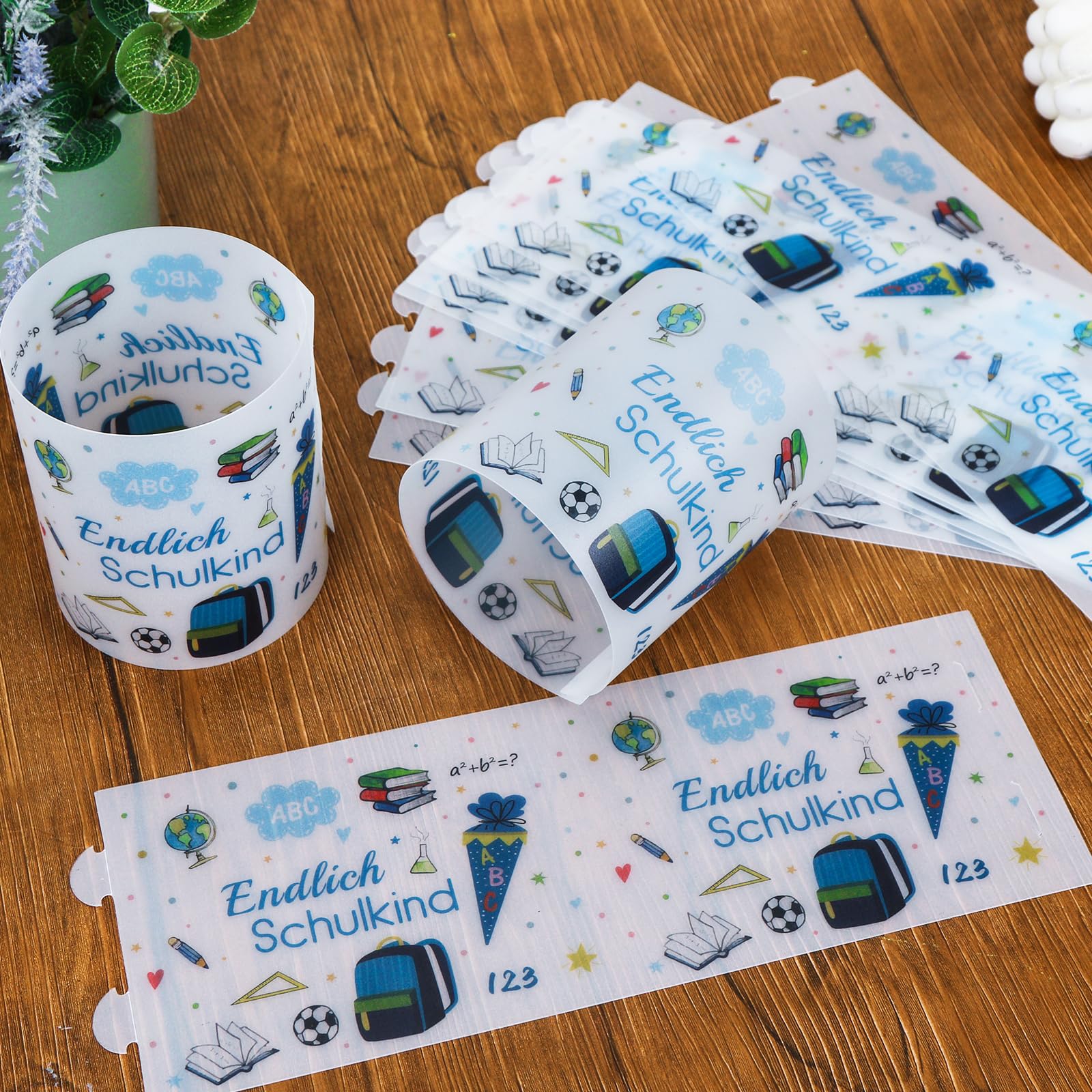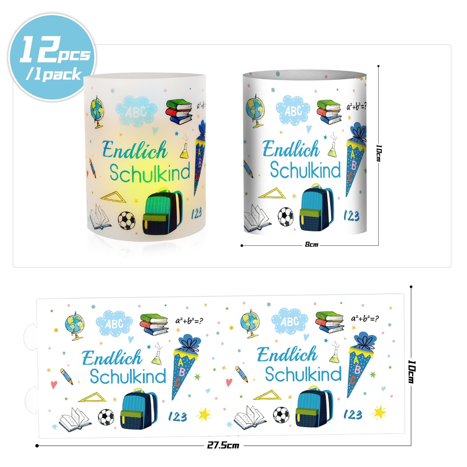 - 【Deko Einschulung Windlicht】: 12 Stück Windlichter Einschulung Tischdeko, Motiv: "Endlich Schulkind", Schultüte, ABC, Schulranzen, 123. Ungefaltet Grösse: 27 * 10 cm, gefaltet Grösse: 8 * 10 cm