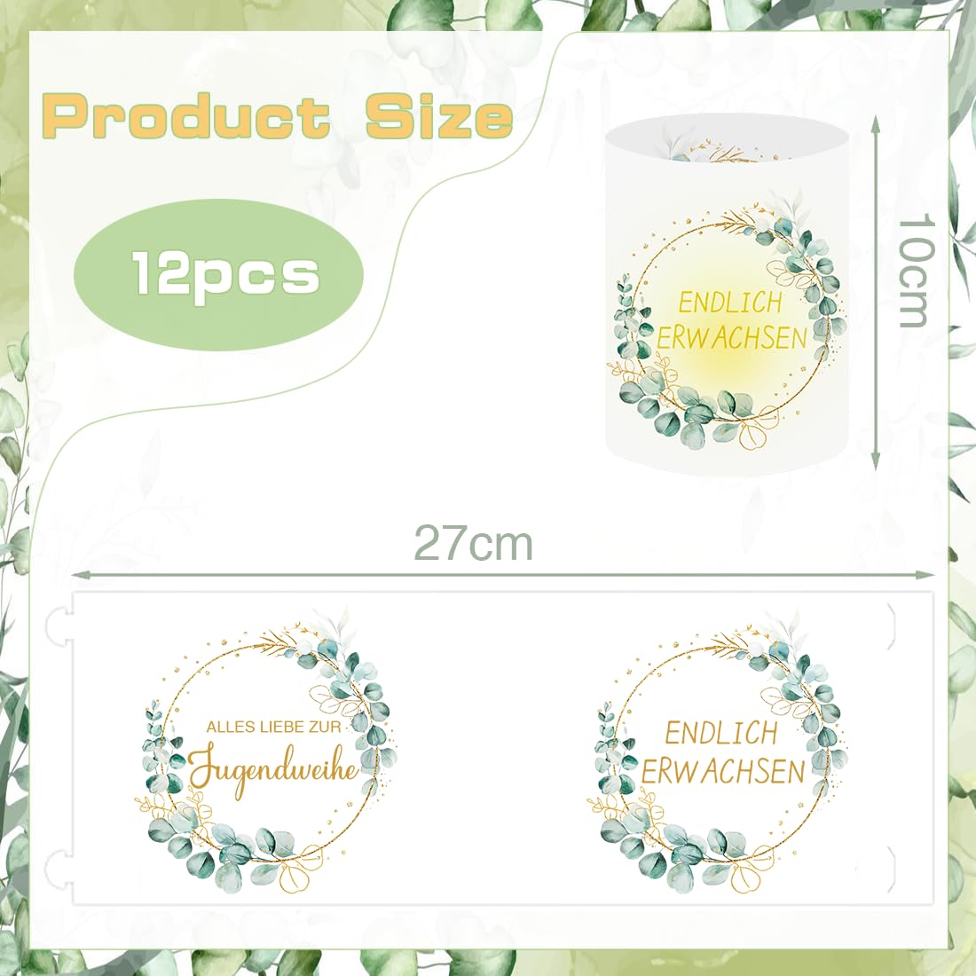 - 【Jugendweihe Windlichter Tischdeko】: 12 Stück Windlicht Jugendweihe Tischdeko, Bedruckt mit Alles Gute Zur Jugendweihe und Eukalyptus Kränzen. Ungefaltet Grösse: 27 * 10 cm, gefaltet Grösse: 8 * 10 cm