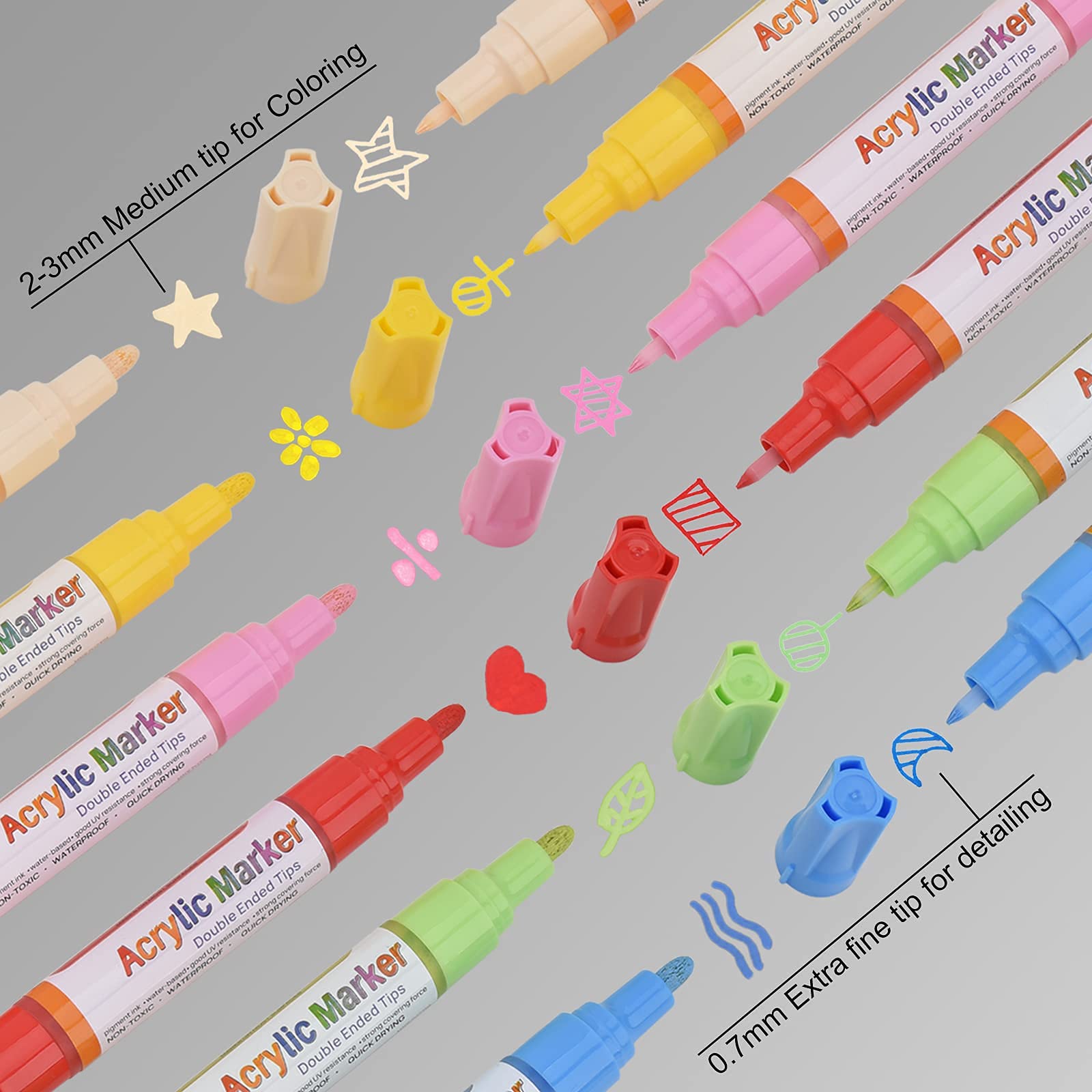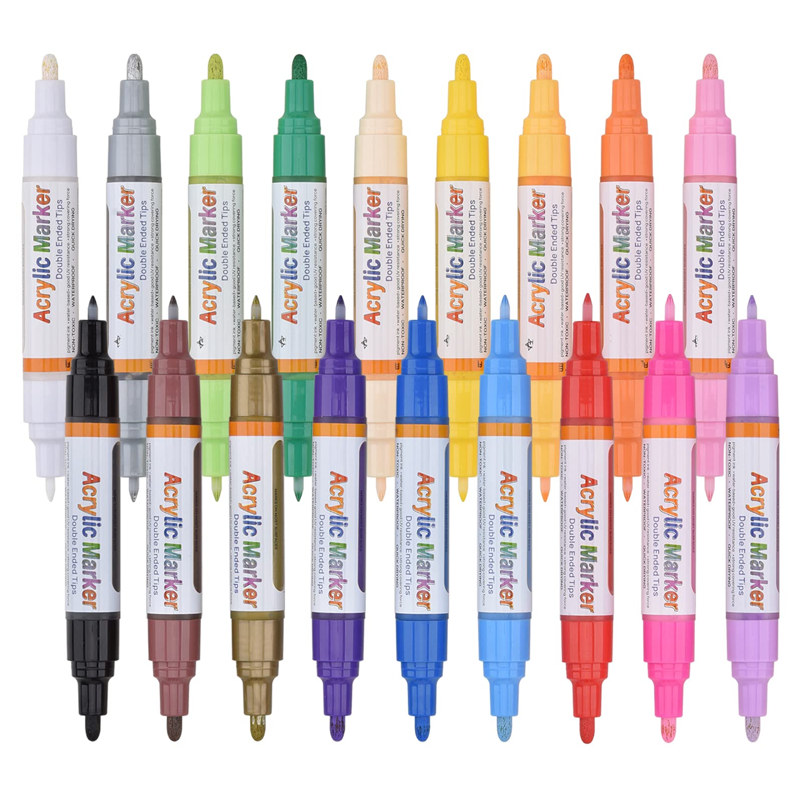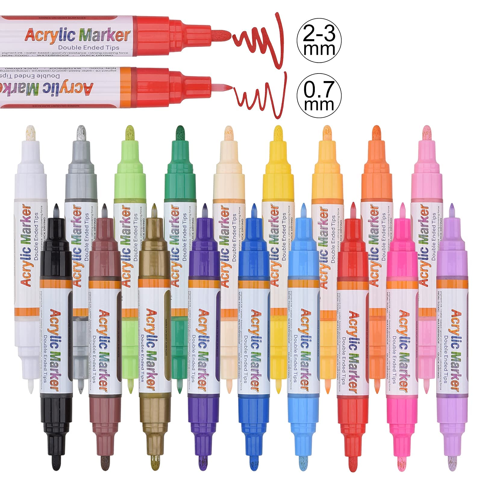 Acrylstifte Doppelspitze, 18 Farbige Doppelfasermaler Acrylstifte für Bemalen, Wasserfeste und Schnelltrocknend Acryl Permanent Marker für Papier Steine Fotoalbum Gästebuch Leinwand (3mm und 0.7mm)