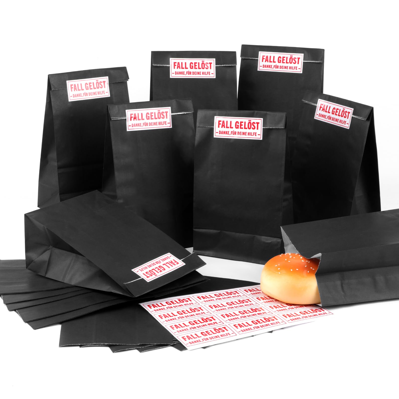 24 Stück Papiertüten zum Befüllen mit 24 Aufkleber Detektiv, Geschenktüten Kindergeburtstag, Geschenktasche Mitgebsel Tüten aus Kraftpapier, Schwarz Fall Gelöst Detektivparty für Junge, Mädchen