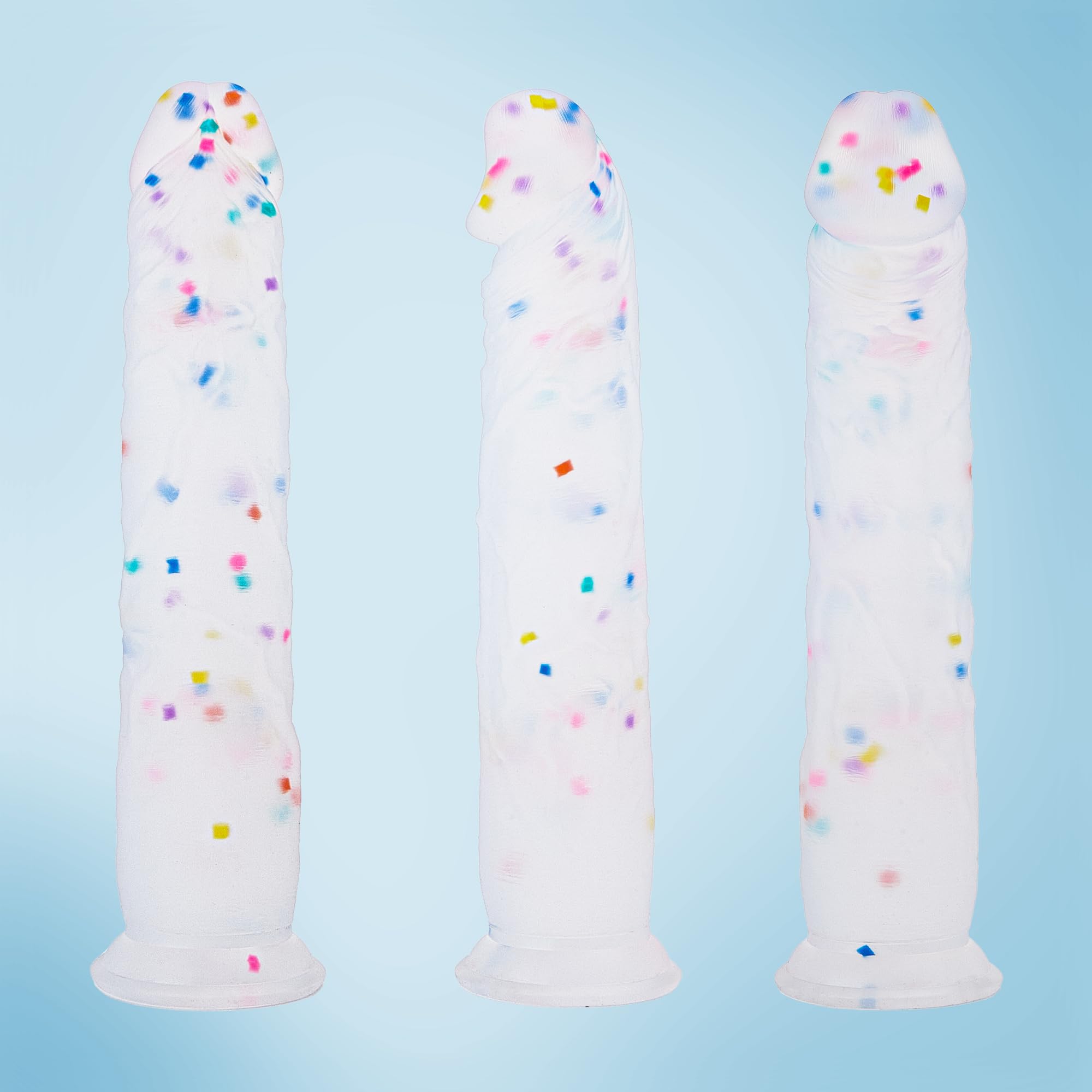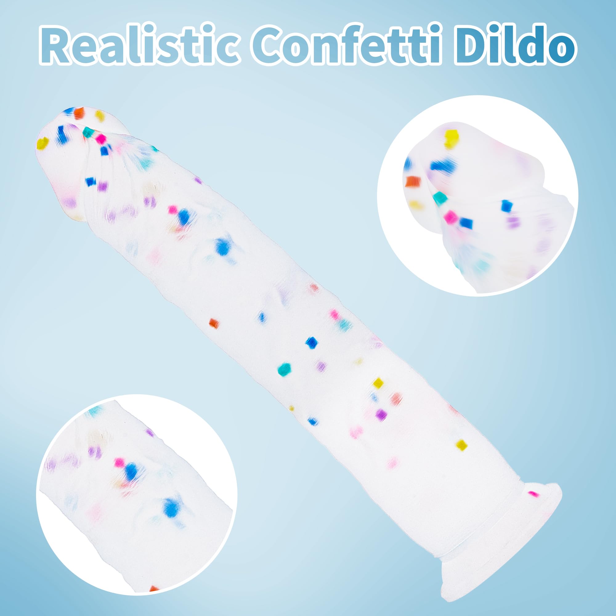 • Konfetti Transparent Design: Mit einem einzigartigen transparenten Design mit eingebetteten Konfetti bietet dieser realistische Dildo einen ästhetisch ansprechenden Look, der zur sensorischen Stimulation beiträgt.