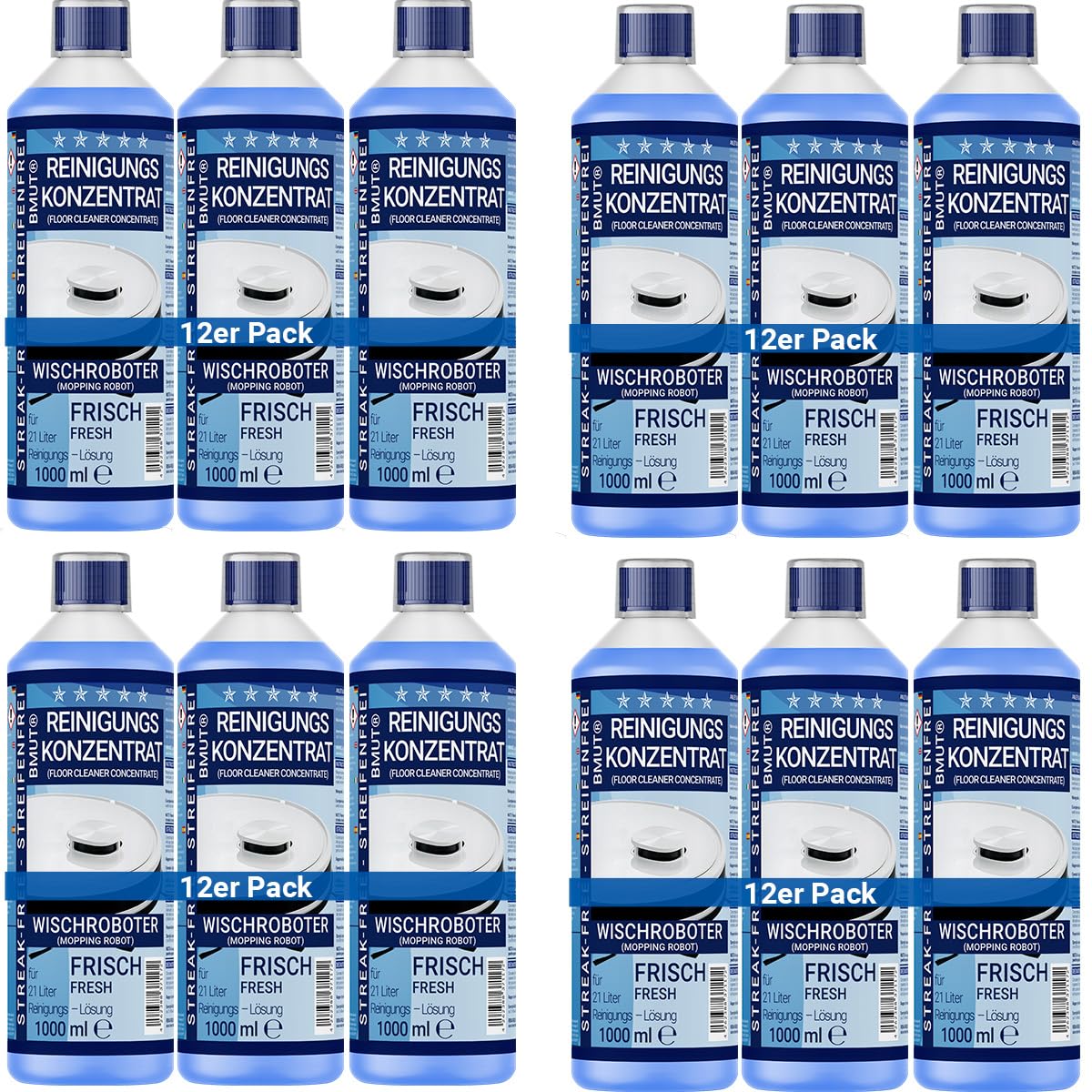12x 1000ml Wischroboter Reinigungsmittel Konzentrat | extra frischer Duft | streifenfrei & schaumarm + Dosierbecher | Bodenreiniger u.v.m.