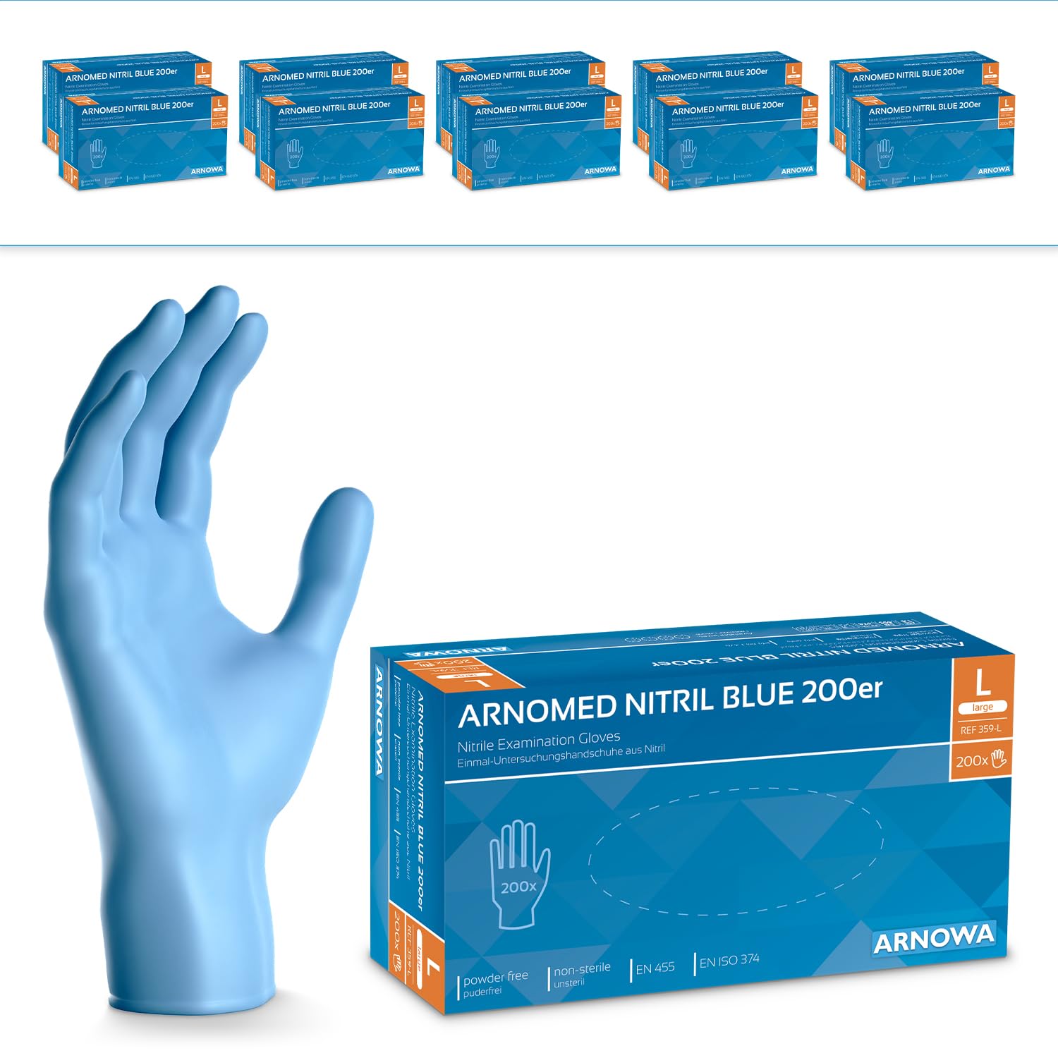 2000x ARNOMED Einweghandschuhe Blau, Einmalhandschuhe L, Nitrilhandschuhe (10x200 Stk), Handschuhe Einweg puderfrei, Gummihandschuhe Einweg, Handschuhe Nitril, Einmalhandschuhe in S, M, L & XL