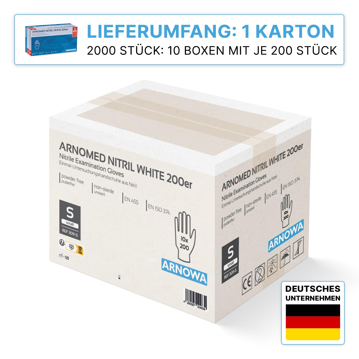 • NITRILHANDSCHUHE IM BUNDLE ✓ Bei den ARNOMED NITRIL 200ern erhalten Sie in diesem Bundle 2000 Stück Einmalhandschuhe aus Nitril in S, M, L oder XL (10 Boxen á 200 Stück/Box). Dieses Vorteilspack eignet sich ideal für Bereiche mit erhöhtem Bedarf!
