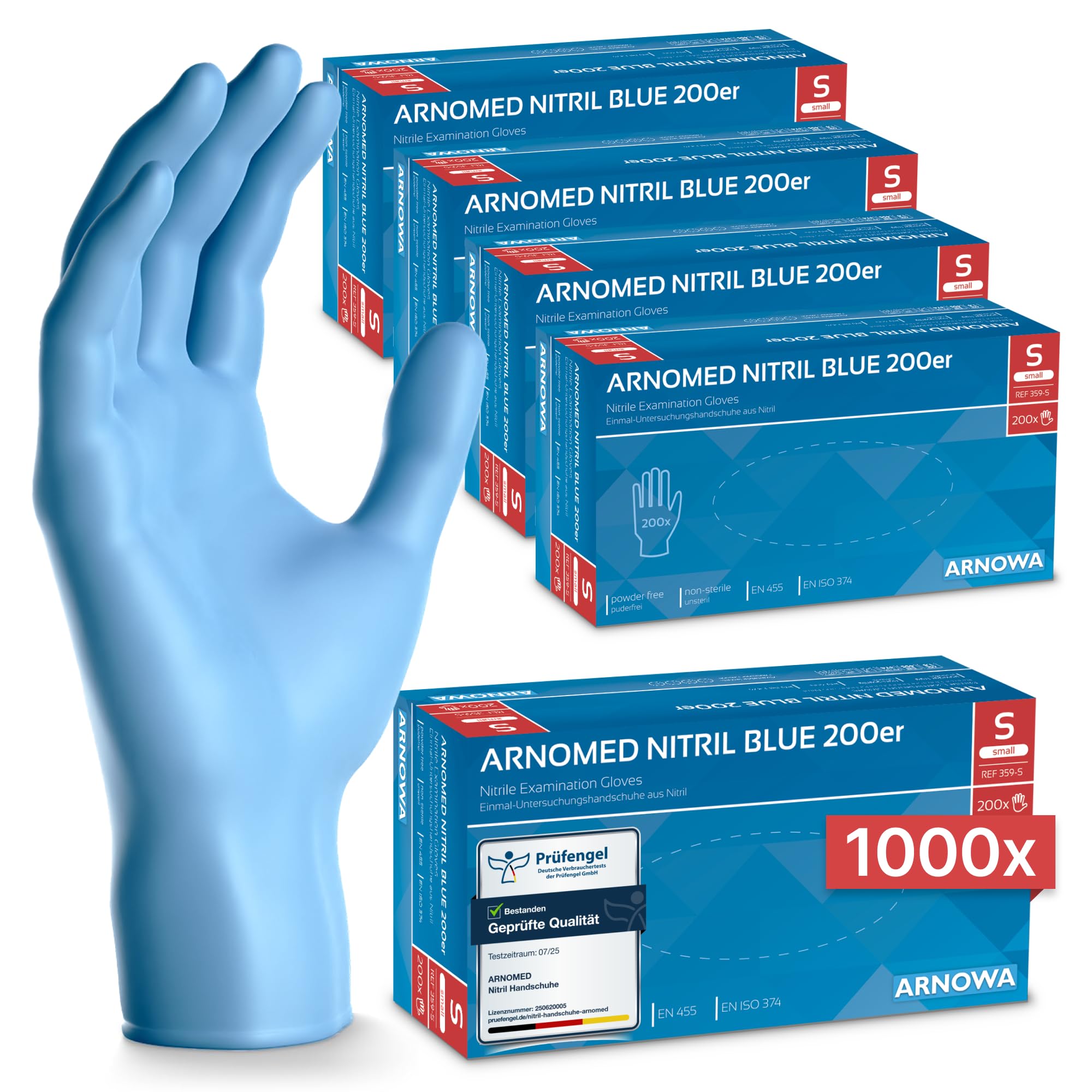 1000x ARNOMED Einweghandschuhe Blau, Einmalhandschuhe S, Nitrilhandschuhe (5x200 Stk), Handschuhe Einweg puderfrei, Gummihandschuhe Einweg, Handschuhe Nitril, Einmalhandschuhe in S, M, L & XL