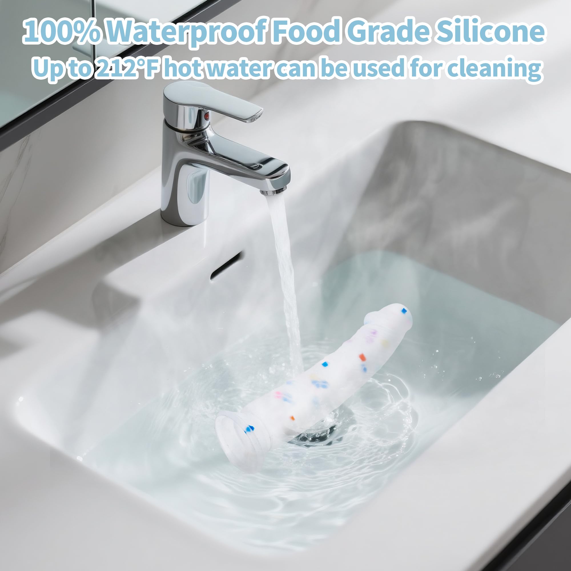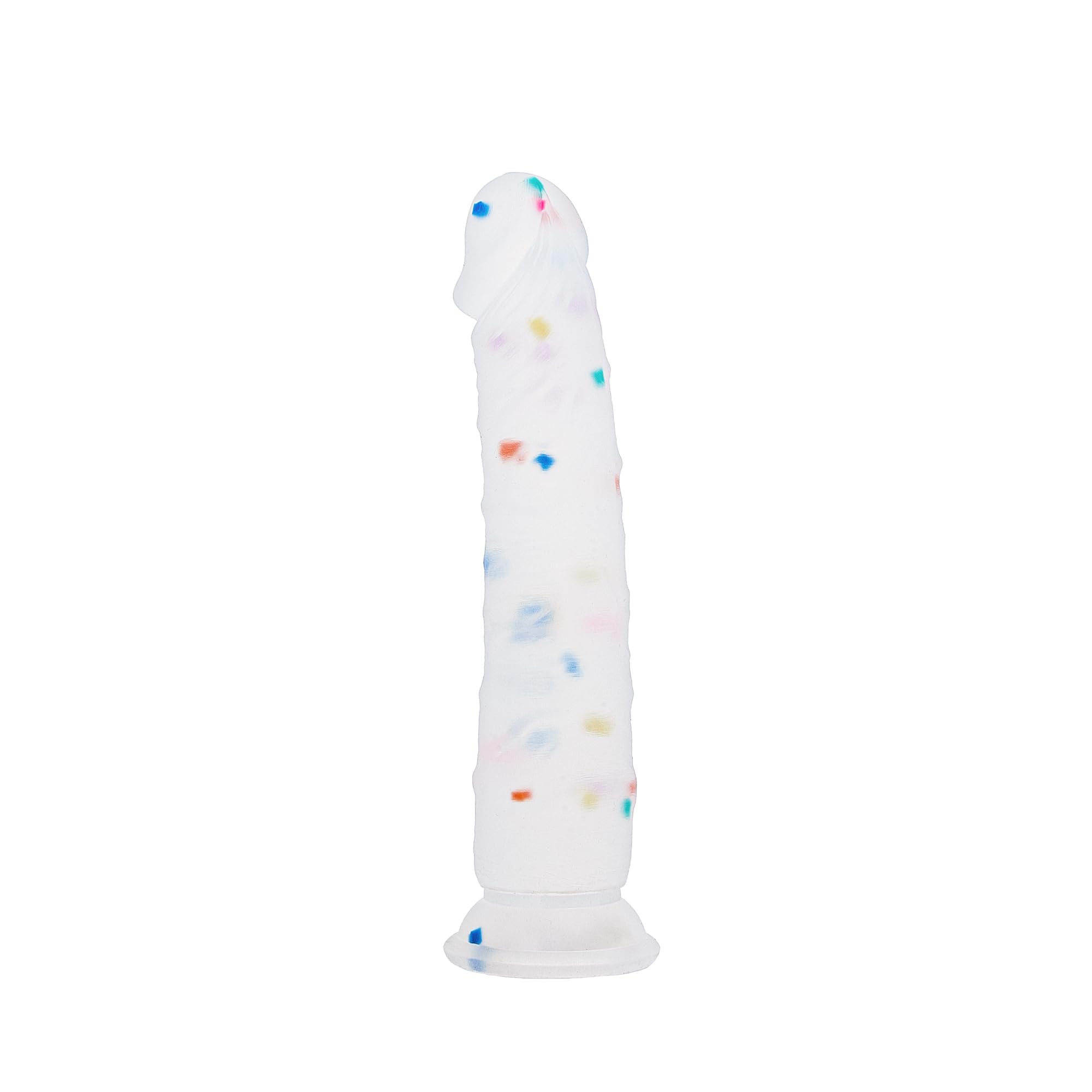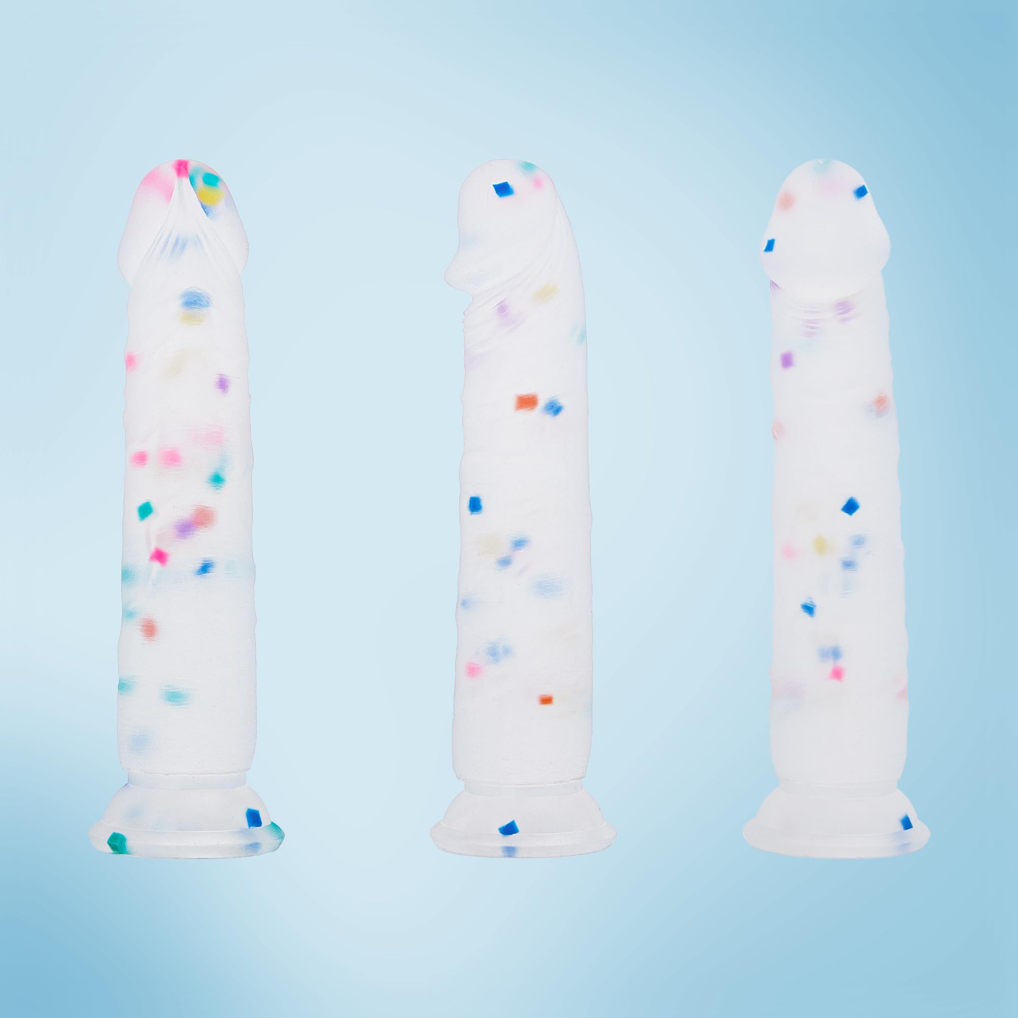 • Konfetti Transparent Design: Mit einem einzigartigen transparenten Design mit eingebetteten Konfetti bietet dieser realistische Dildo einen ästhetisch ansprechenden Look, der zur sensorischen Stimulation beiträgt.