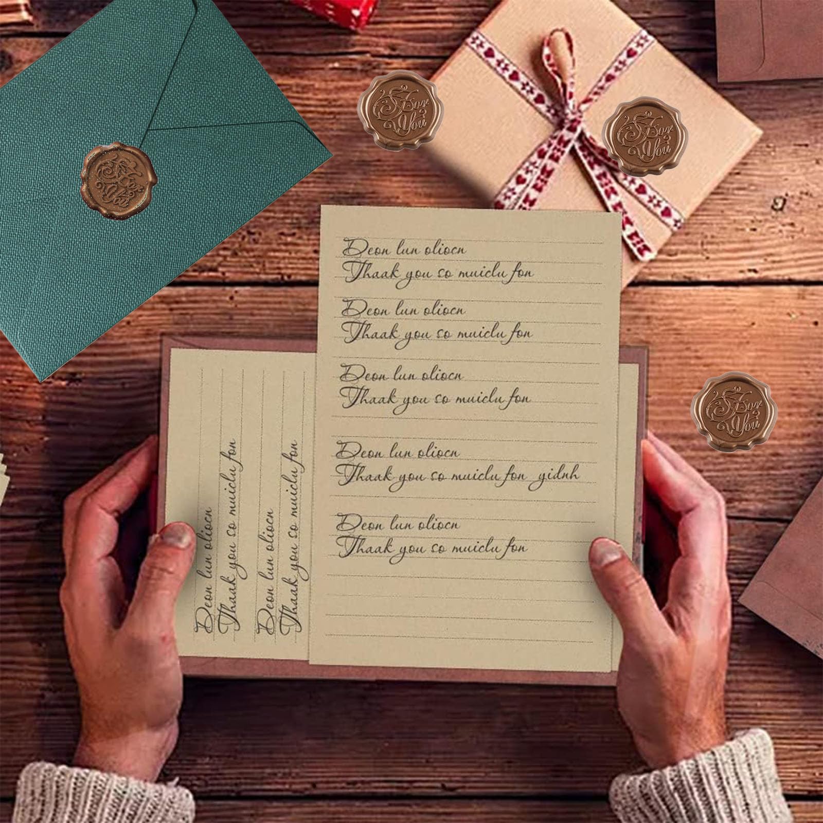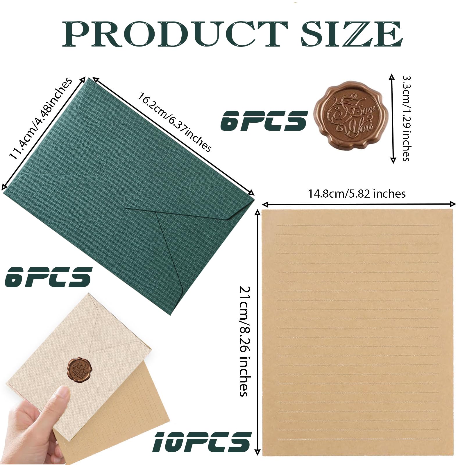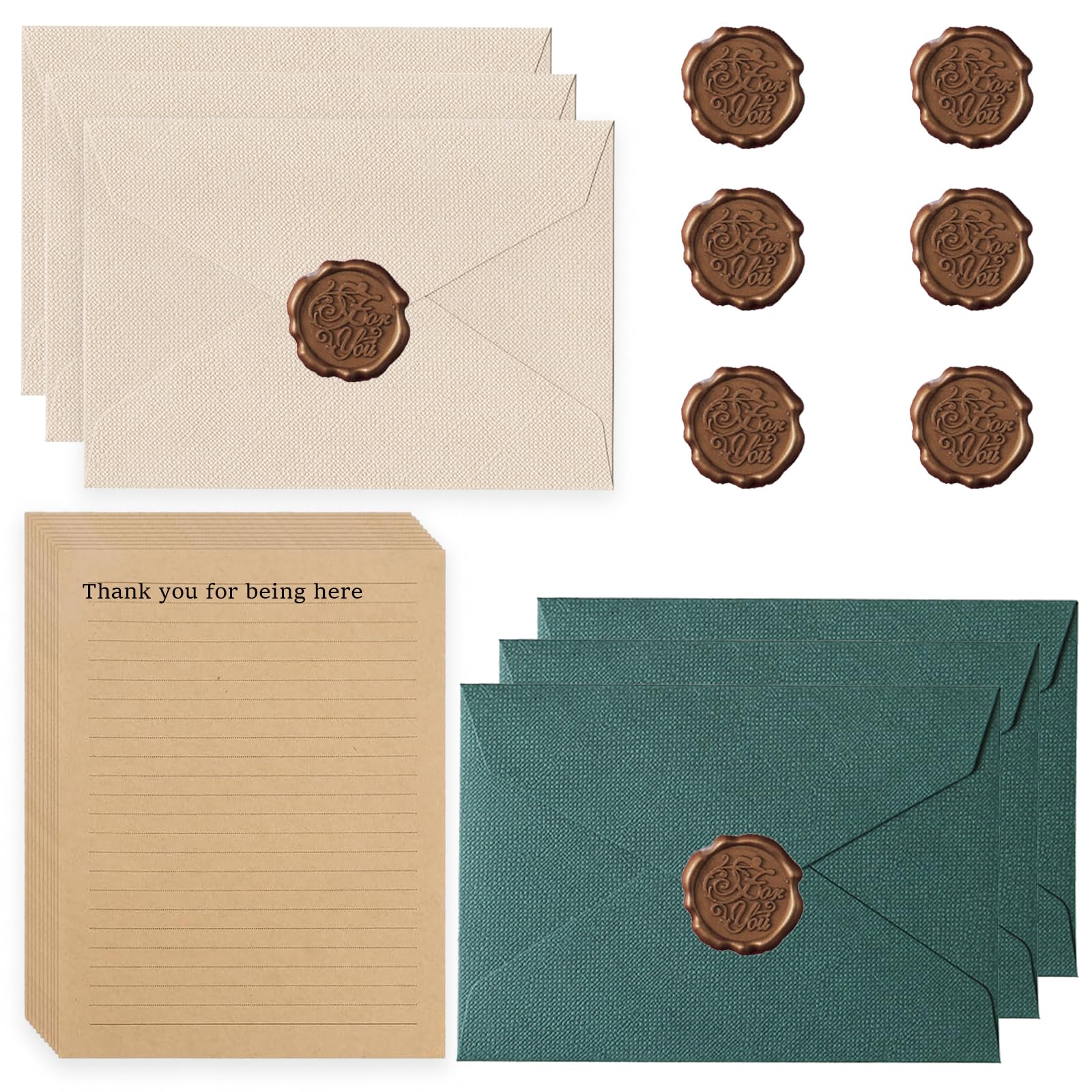 22 Stück Briefpapier Vintage Papier, Set mit 6 Leinenumschlag Umschläge und Wachssiegel 10 A5 Briefpapier Vintage Papier, Kraftpapier Umschläge für Geburtstag, Hochzeits Einladung Grusskarten (Grün)