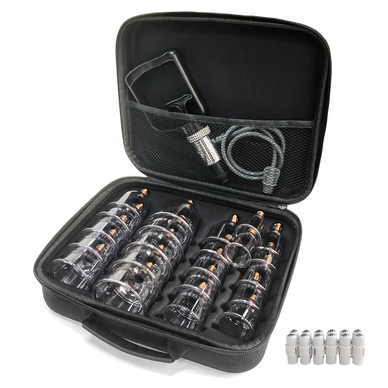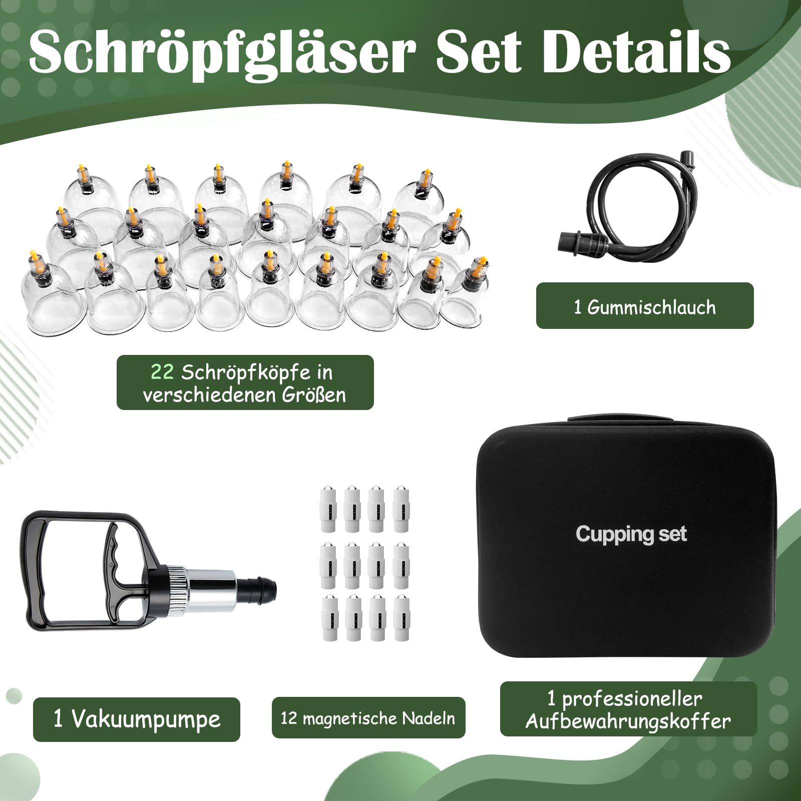 QUALITÄTSSCHRÖPFSET: Das Set enthält 22 Schröpfköpfe in verschiedenen Grössen für unterschiedliche Körperteile wie Schultern, Nacken, Rücken und Beine. Zusätzlich 12 magnetische Nadeln für Akupressur und 1 Anleitungsheft. Ein praktischer Organizer aus Stoff hilft bei der Aufbewahrung.