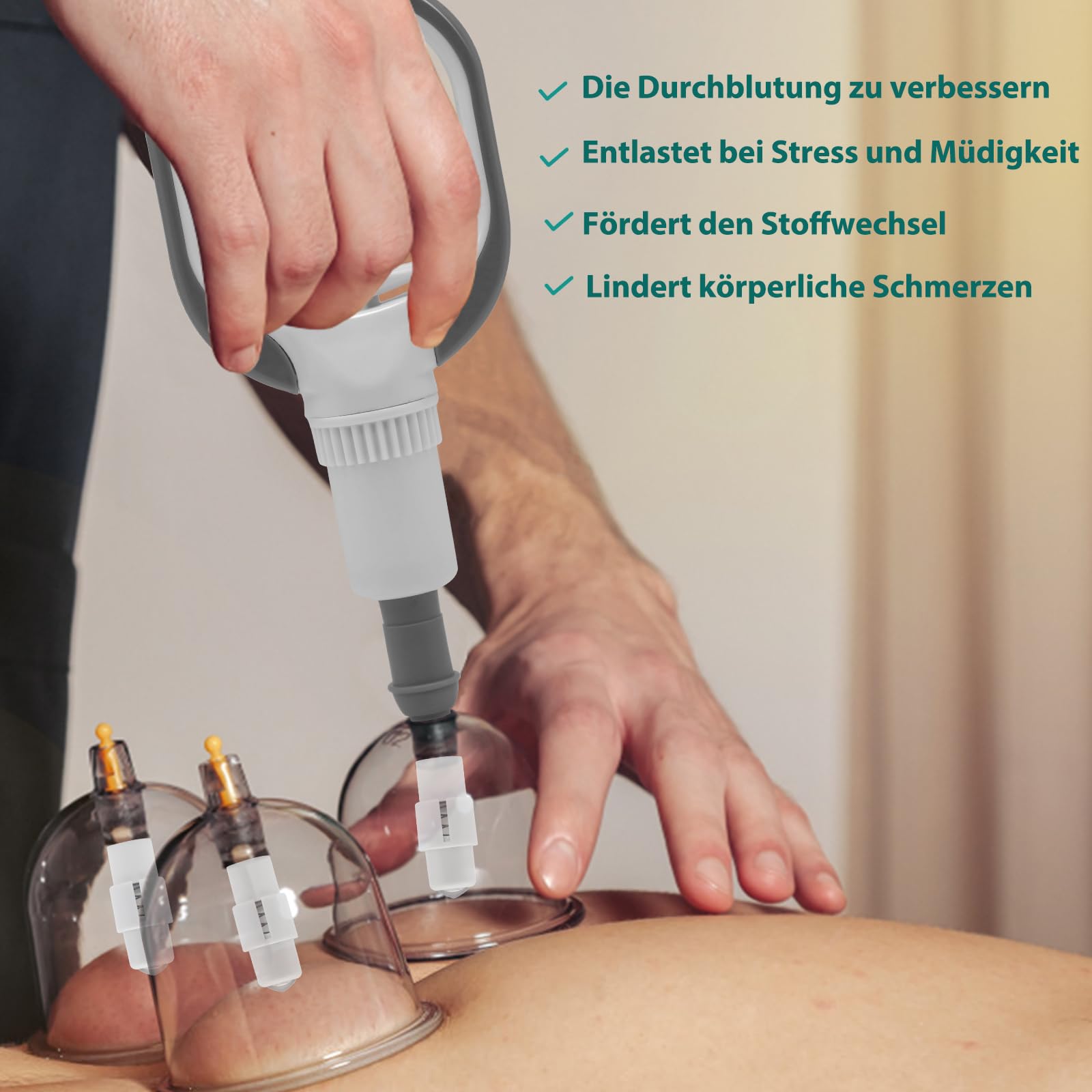Die Akupressurpunkt-Magnete in den Schröpfgläsern fördern die Linderung von Verspannungen und die Stimulation der Energieflüsse im Körper. Das Schröpfen hilft, Cellulite zu reduzieren, die Blutcirculation zu verbessern und die Regeneration der Haut zu fördern, wodurch das Hautbild sichtbar gestrafft wird.