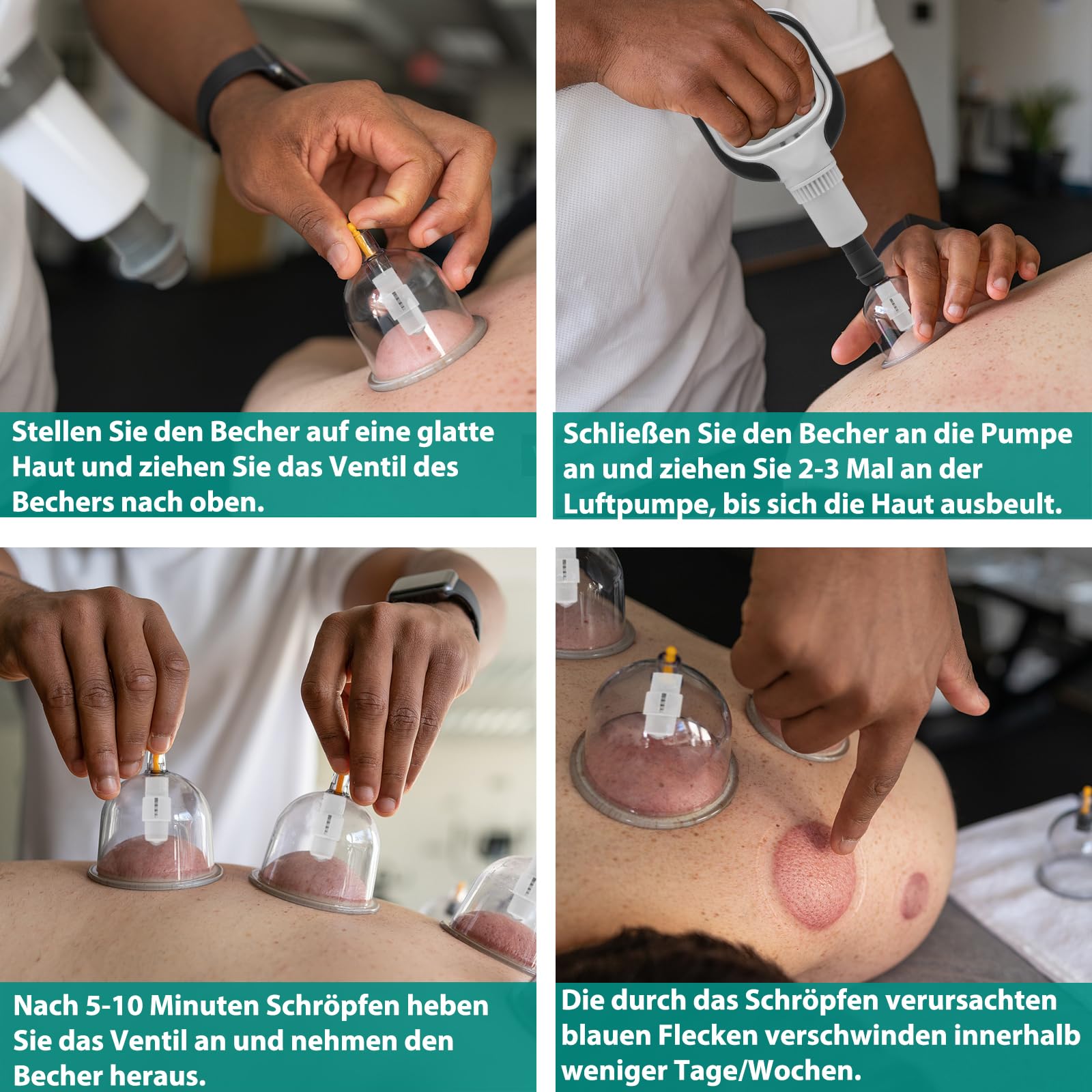 WICHTIGE TIPPS: Vor dem Schröpfen die Haut reinigen und Körperhaare entfernen, da unbehandelte, behaarte Haut die Saugkraft beeinträchtigen kann. Vermeiden Sie Schröpfen auf Wunden, Infektionen, Verbrennungen oder entzündeter Haut. Nach dem Schröpfen 8 Stunden lang nicht baden oder schwimmen.
