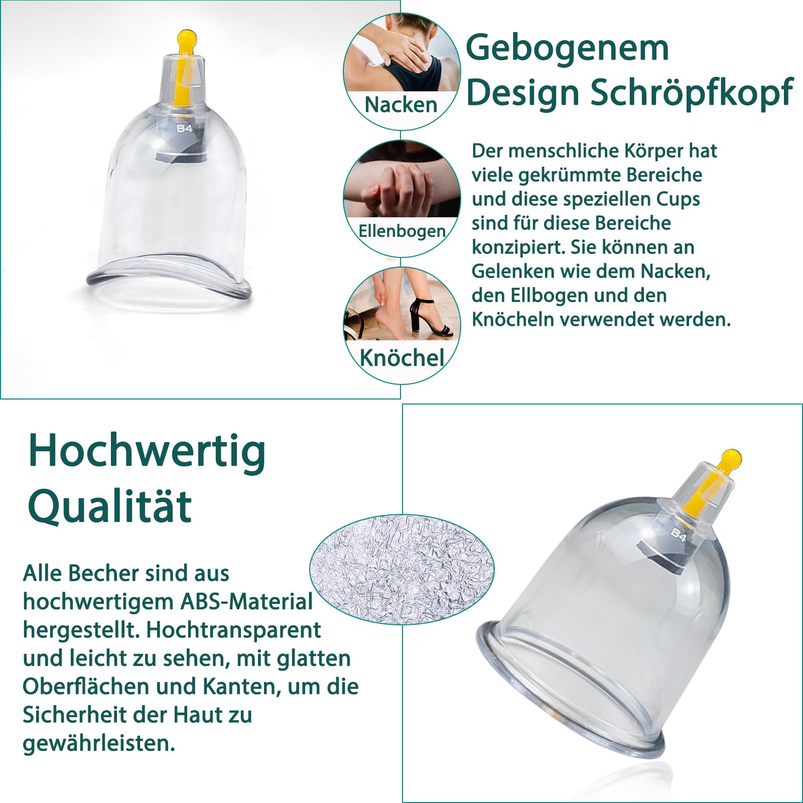 QUALITÄTSSCHRÖPFSET: Das Set enthält 24 Schröpfköpfe in verschiedenen Grössen für unterschiedliche Körperbereiche wie Schultern, Nacken, Rücken und Beine. U-förmige Schröpfköpfe speziell für Ellbogen, Knöchel und andere schwer zugängliche Stellen. Zusätzlich 10 magnetische Nadeln für Akupressur und 1 Anleitungsheft.