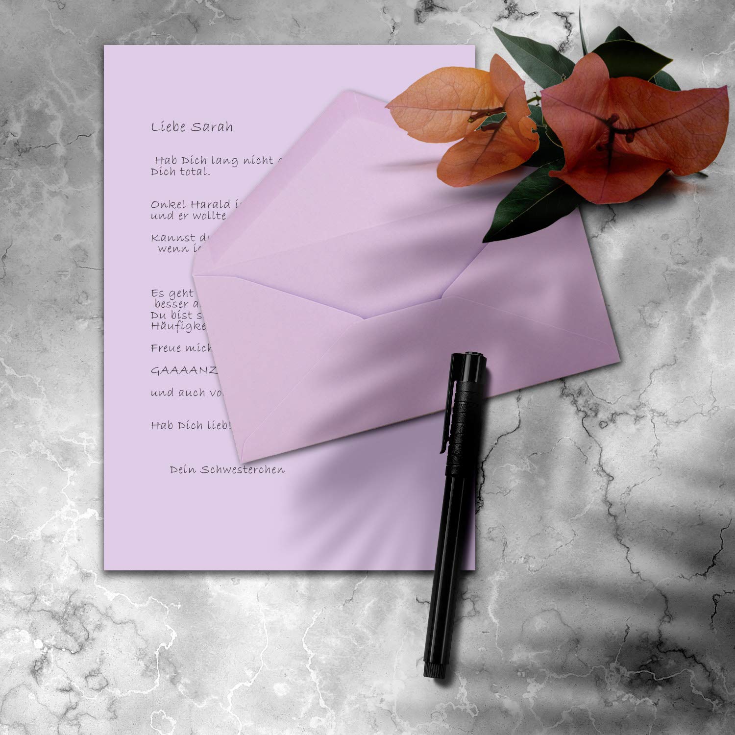 Mit diesem Brief-Set erhalten Sie das DIN A4 Briefpapier zusammen mit den farblich abgestimmten Umschlägen aus dem selben Material.