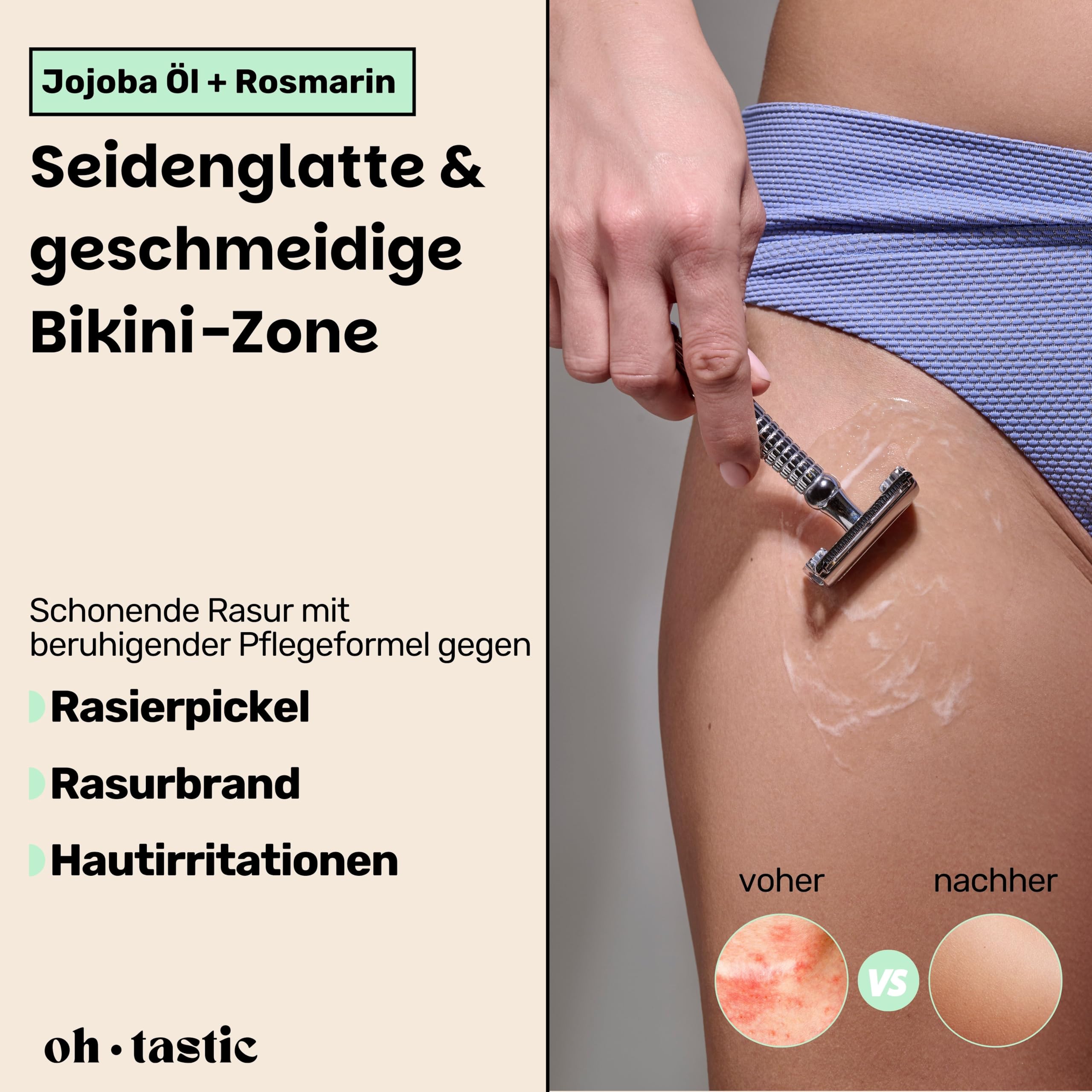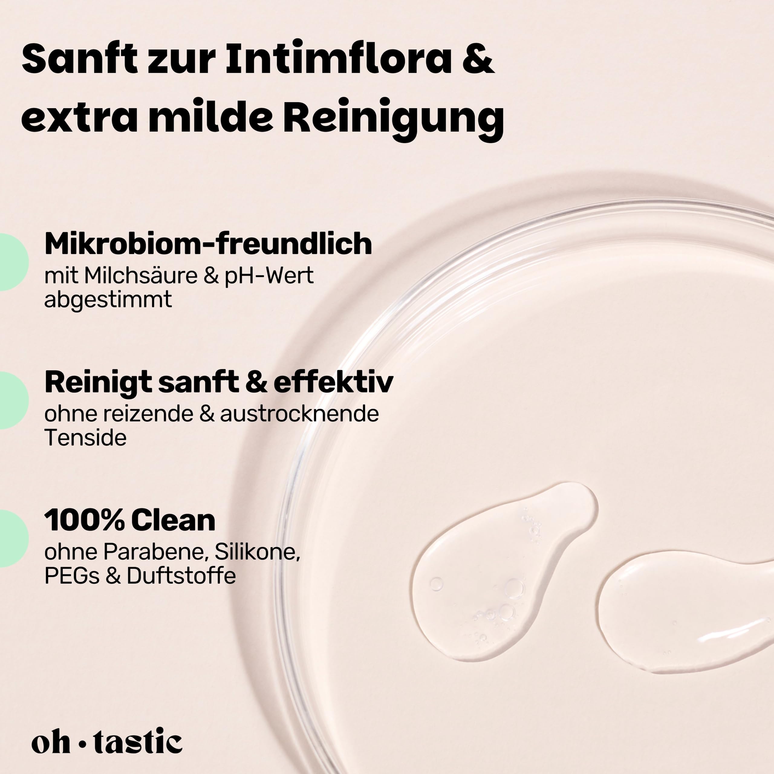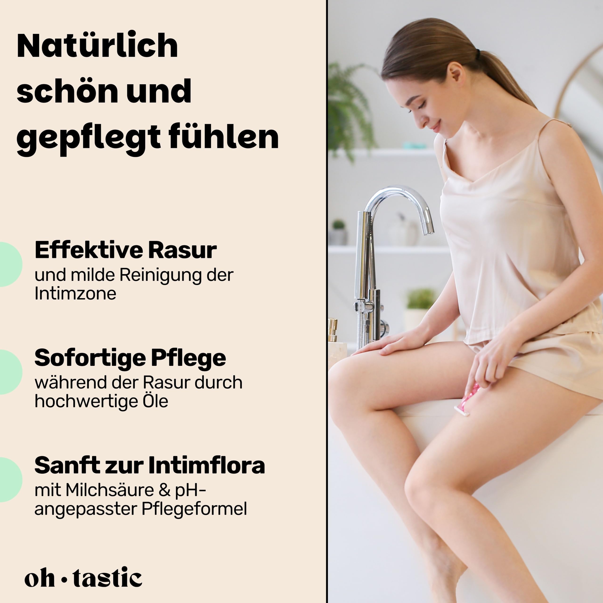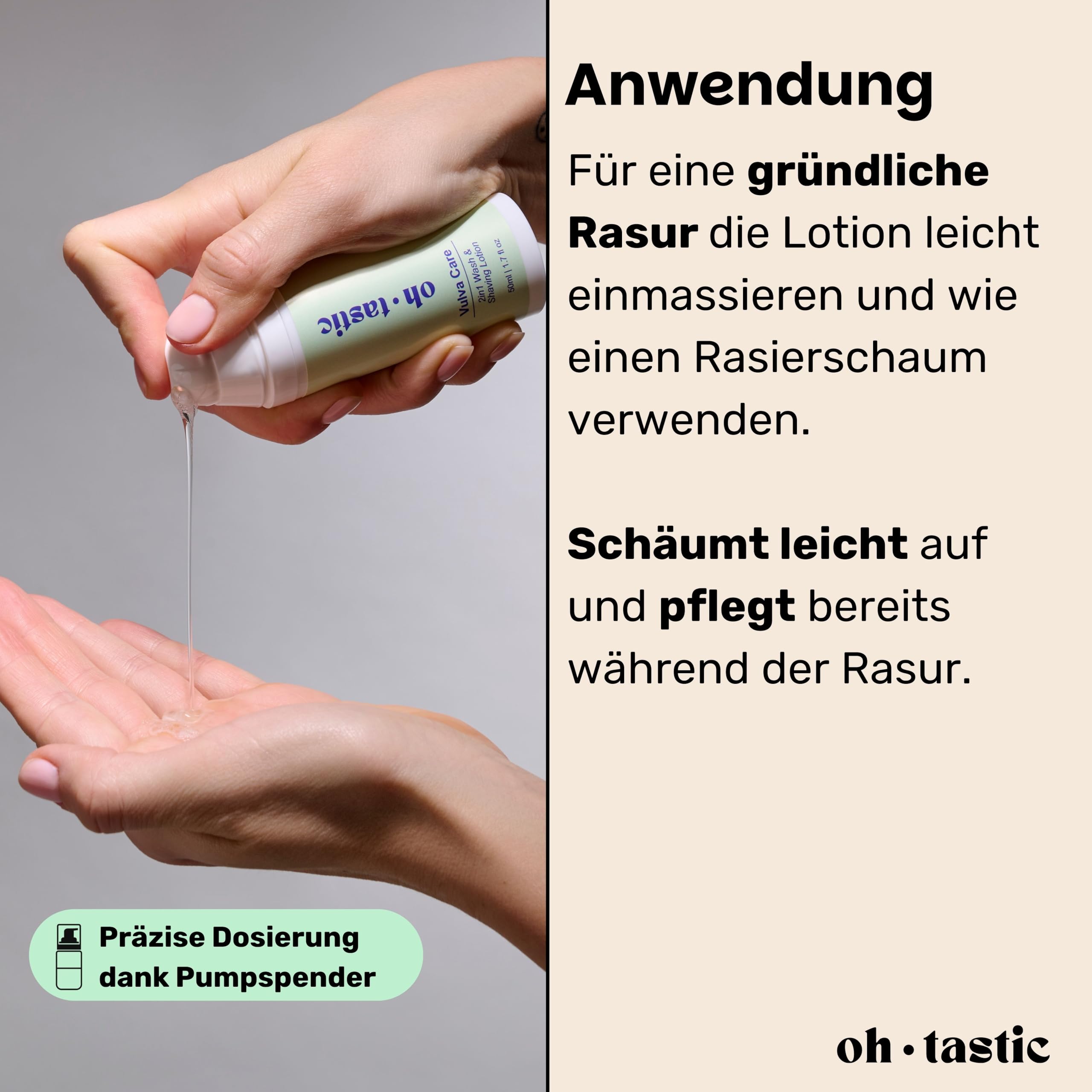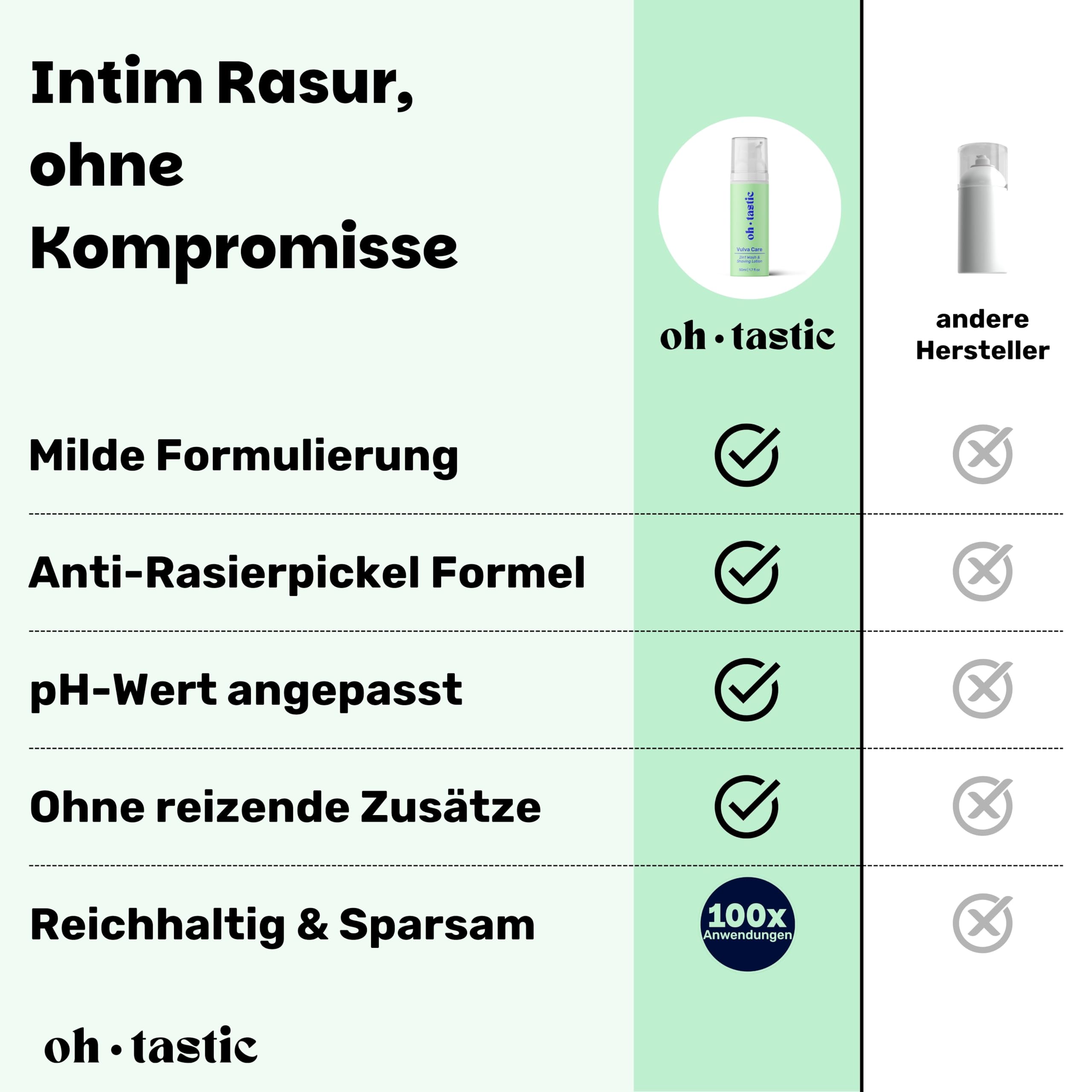 Du hast mit unangenehmen Rasierpickel oder Rasurbrand im Intimbereich zu kämpfen? Kennen wir! Genau deswegen haben wir eine 2in1 Wash & Shaving Lotion speziell für die Bedürfnisse von Frauen entwickelt! Damit du dich jeden Tag sexy & frisch fühlen kannst, egal ob Alltag, Sport, Bikini oder mit deinem Partner! Und wie das ganze? HAPPY VULVA - Die Waschlotion ist speziell auf die Anforderungen und den pH-Wert deines Intimbereichs abgestimmt und enthält natürliche Inhaltsstoffe wie Aloe Vera Extrakt, Kamillenblüten Extrakt und Milchsäure. Sie sorgt dadurch für eine super gepflegte und gesunde Vulva & eine natürliche Intimflora. OPTIMALER SCHUTZ UND PFLEGE JEDEN TAG - Mit ihren entzündungshemmenden Eigenschaften und natürlichen Extrakten schützt die Waschlotion vor kleinen Rissen & Rasierpickeln. Dabei wirkt sie antibakteriell, um Infektionen & unangenehme Gerüche vorzubeugen. EASY TO USE - Dank des hygienischen Pumpspenders kann das Wasch- und Rasiergel einfach dosiert werden und hält bis zu 2 Monate. Im Gegensatz zu anderen Produkten lässt sie sich leicht auftragen, wirkt sofort kühlend & ist geruchlos. Leicht einreiben funktioniert die Lotion wie herkömmlicher Rasierschaum. OHNE RISIKO - 100% frei von Parabenen, Farbstoffen, Mikroplastik, Acrylaten und Mineralöl. Unabhängig Laborgeprüft, Naturkosmetik konform & Vulva-approved! OHTASTIC - Wir sind ein junges Unternehmen, dass sich für die intimsten Bedürfnisse von Frauen einsetzt. Für uns war von Anfang an klar, dass wir hochwertige, natürliche und effektive Produkte anbieten wollen JETZT IN DEN EINKAUFSWAGEN LEGEN