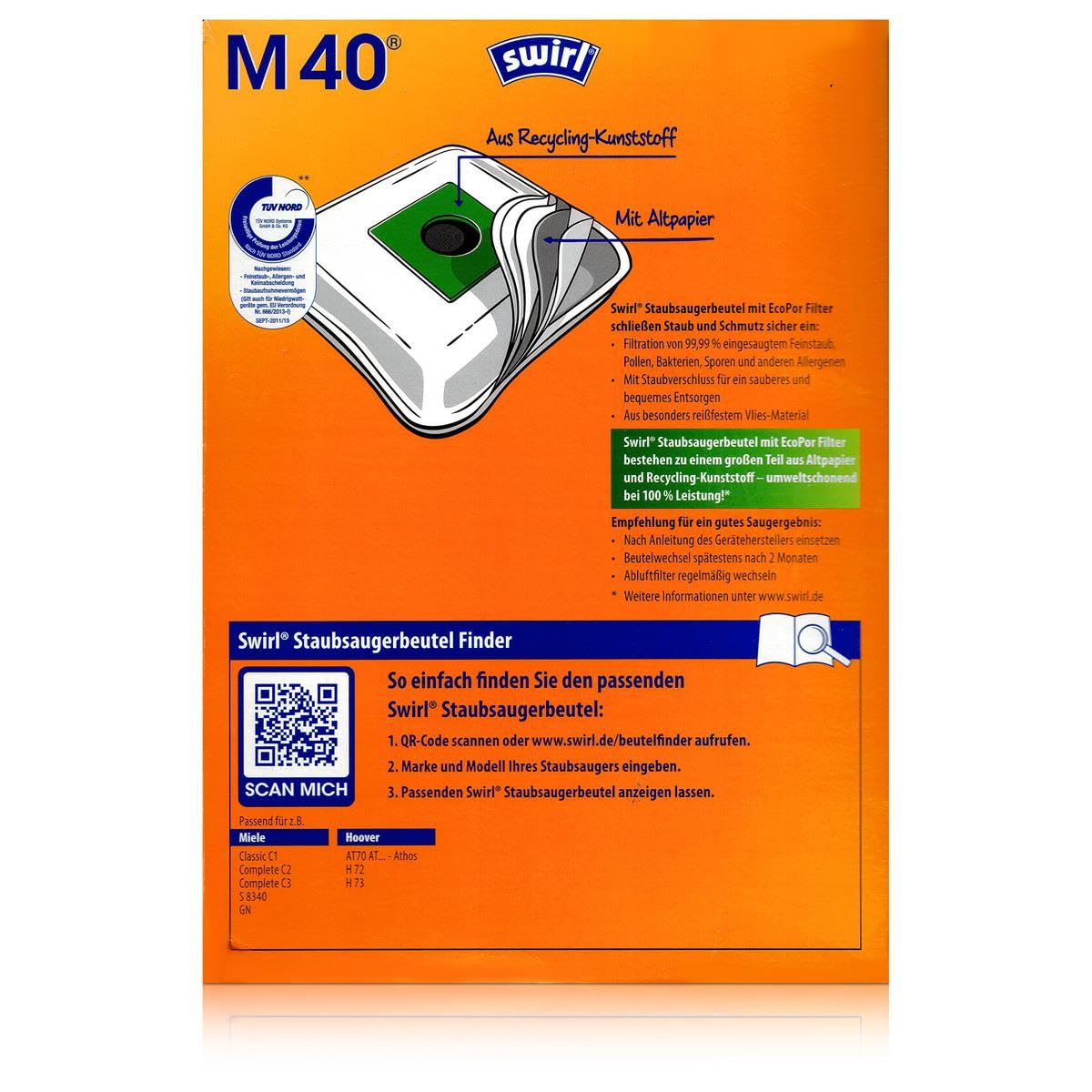 3 Pakete Swirl Staubsaugerbeutel M40 (M54) / M 40 MicroPor Plus AirSpace für Miele Staubsauger Typ: G