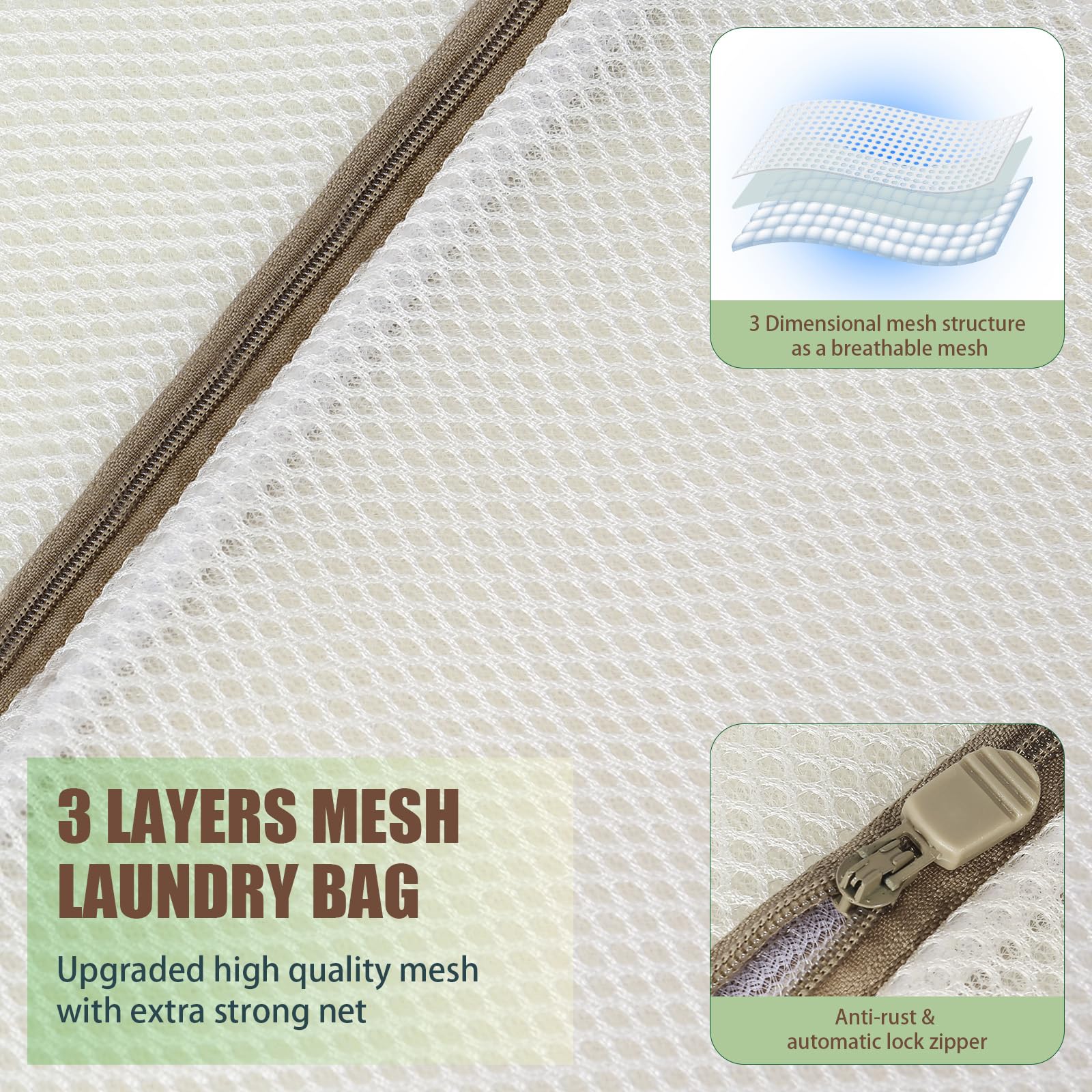 ●【Hohe Spezifikationen】Wir verwenden verstärktes dreidimensionales Sandwich-Netzgewebe mit einer Dichte von 140 g/m² für die Herstellung unserer Wäschesäcke, da es von hoher Qualität ist und eine super starke Struktur ergibt, was zu einer längeren und haltbareren Lebensdauer führt. In der Zwischenzeit bietet dieses spezielle Gewebe einzigartige atmungsaktive Maschen und das weiche innere Netzmaterial kann Ihre empfindlichen Gegenstände perfekt schützen. ●【Mehr Schutz】 Die robusten Netzbeutel mit dreidimensionaler Struktur aus hochwertigem Material können Ihre Kleidung perfekt vor Verheddern, Rissen oder Zerren schützen und minimieren die Möglichkeit, dass sich die Farben in der Waschmaschine und im Trockner gegenseitig verfärben. Ideal zum Organisieren Ihrer Kleidung, wenn Sie sich auf eine Reise vorbereiten. ● 【Aktualisierter Reissverschluss】 Unser rostfreier Upgrade-Reissverschluss mit automatischer Verriegelung und seitlichem Reissverschluss-Schutzband verhindert, dass der Beutel während des Wasch- und Trocknungszyklus geöffnet wird. Und die Hauptstossstelle aus verdicktem Edelstahl ist nicht leicht zu brechen. Sie werden ein neues, ruhiges und reibungsloses Wäscheerlebnis haben. ●【Wertpackung】 Du erhältst 2 Wäschebeutel mit den Abmessungen 40,6 x 50,8 cm für deine Wäschebedürfnisse an Unterwäsche, Innenwäsche, Blusen, Socken, Hosen, Strumpfhosen, Socken usw. Intelligente Wahl: Entscheide dich für unsere Netzwäschebeutel, um deine Kleidung zu schützen, ihre Lebensdauer zu verlängern und langfristig Geld zu sparen. Und sie sind auch eine grosse Hilfe, um Ihr Zuhause und Ihr Gepäck während der Reise zu organisieren. Ihre Kleidung wird in der Waschmaschine gründlich und sauber gewaschen und in der Trocknermaschine gleichmässig getrocknet. Vereinfacht erheblich Ihren Wäscheprozess!