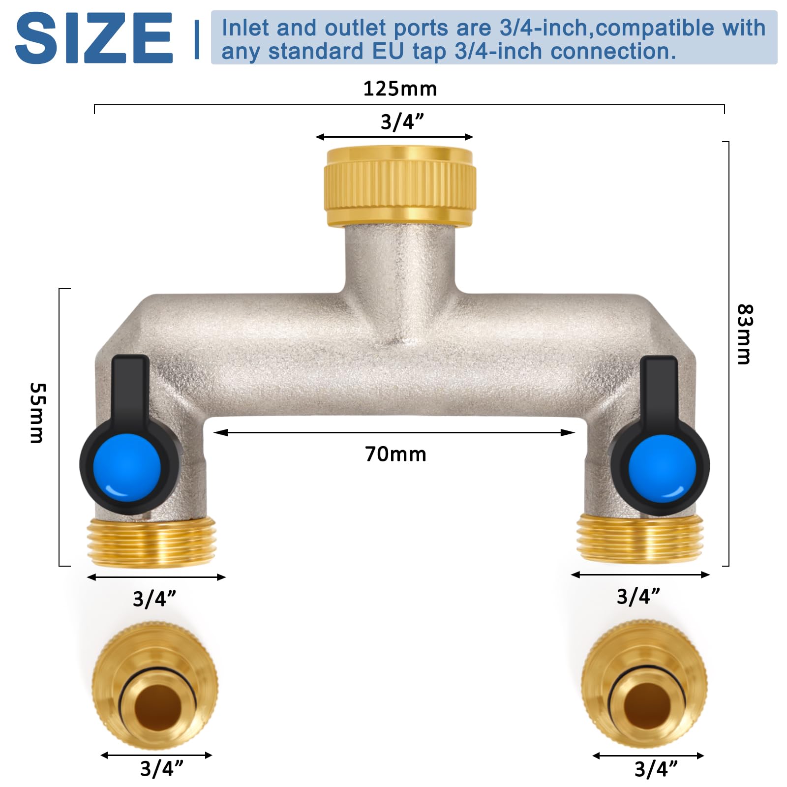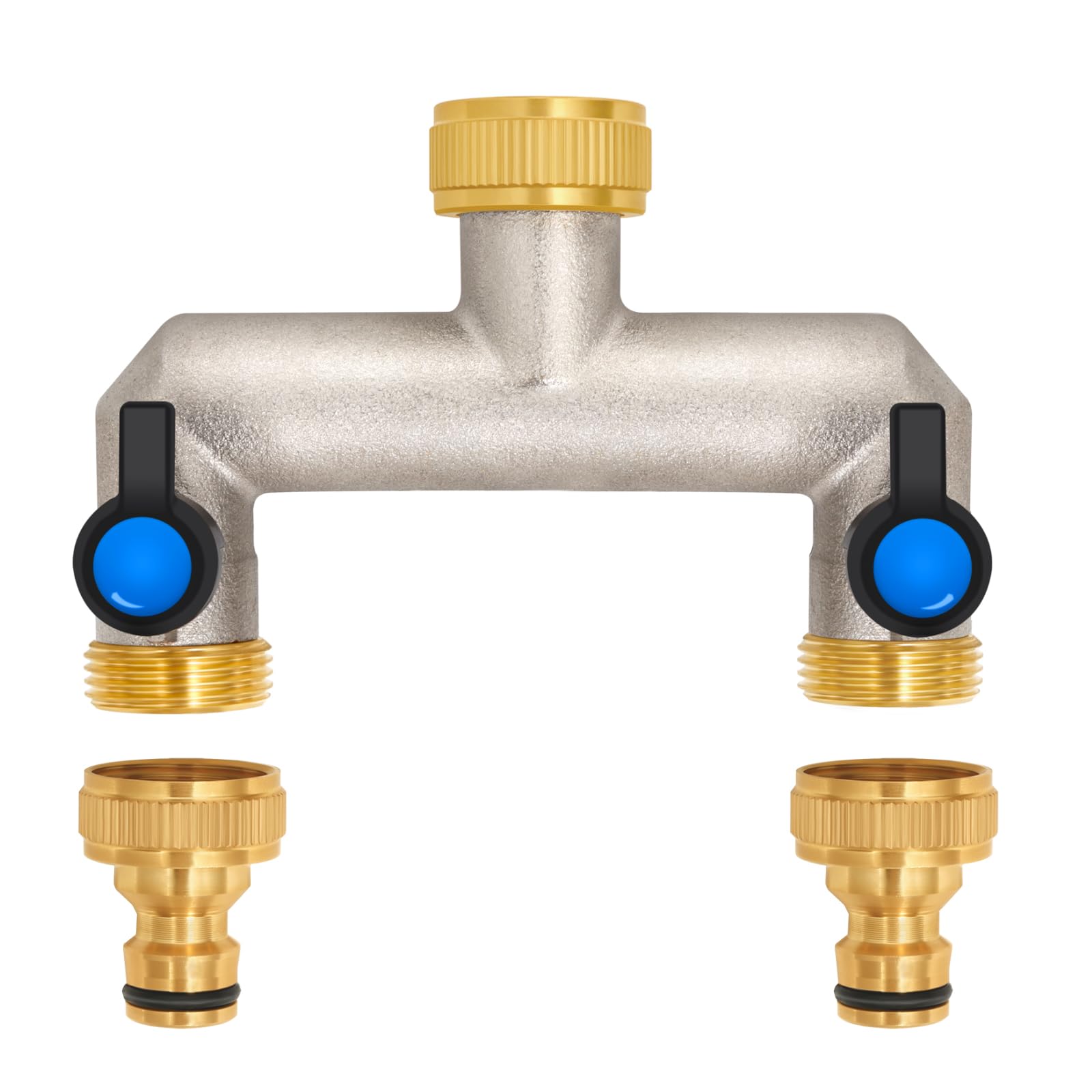 2-Wege Wasserhahn Wasserverteiler aus Messing für 2 Geräte/Gartenschläuche, 2er Verteiler 3/4" Adapter 1/2" mit Kugelhahn zum Einstellen und Absperren des Wasserflusses