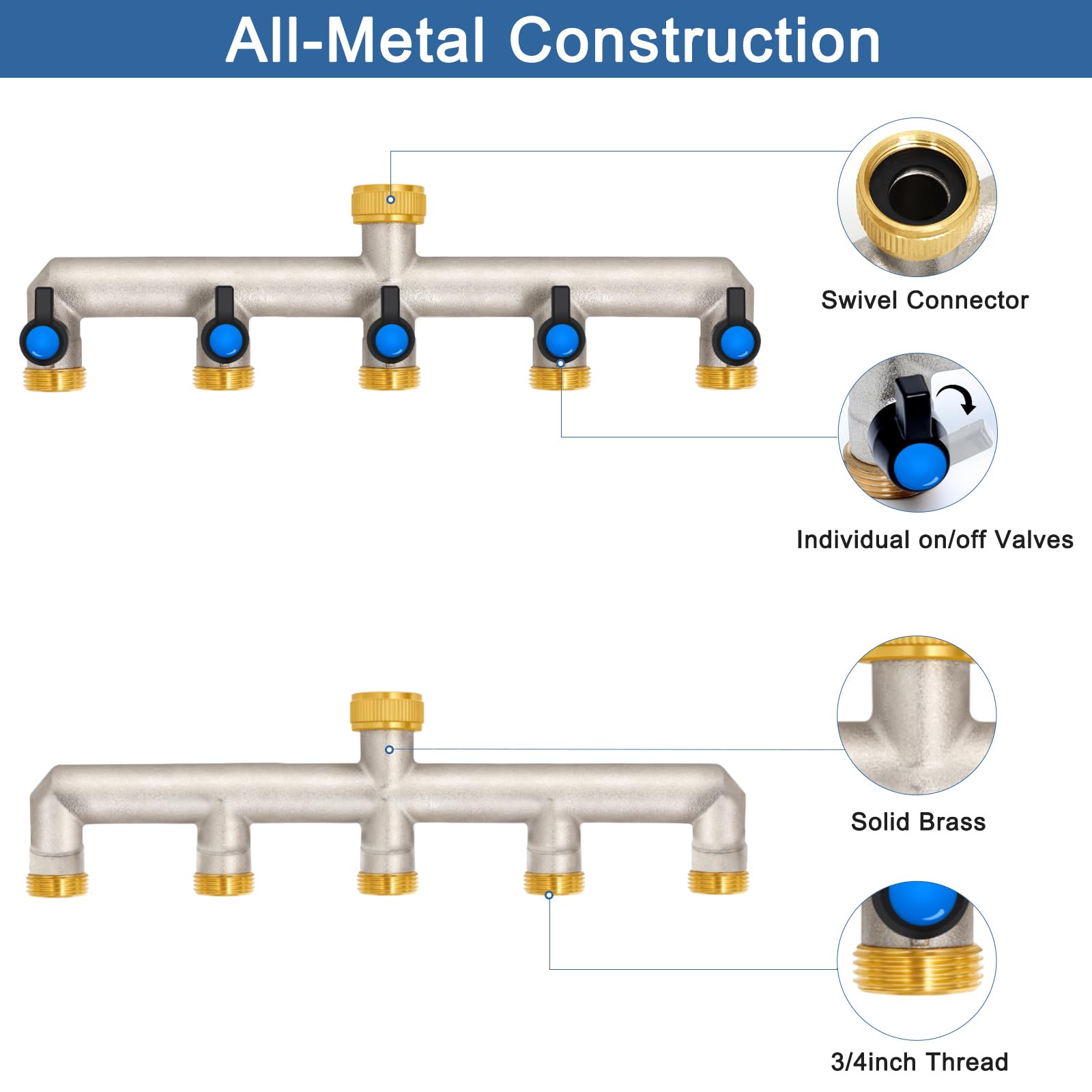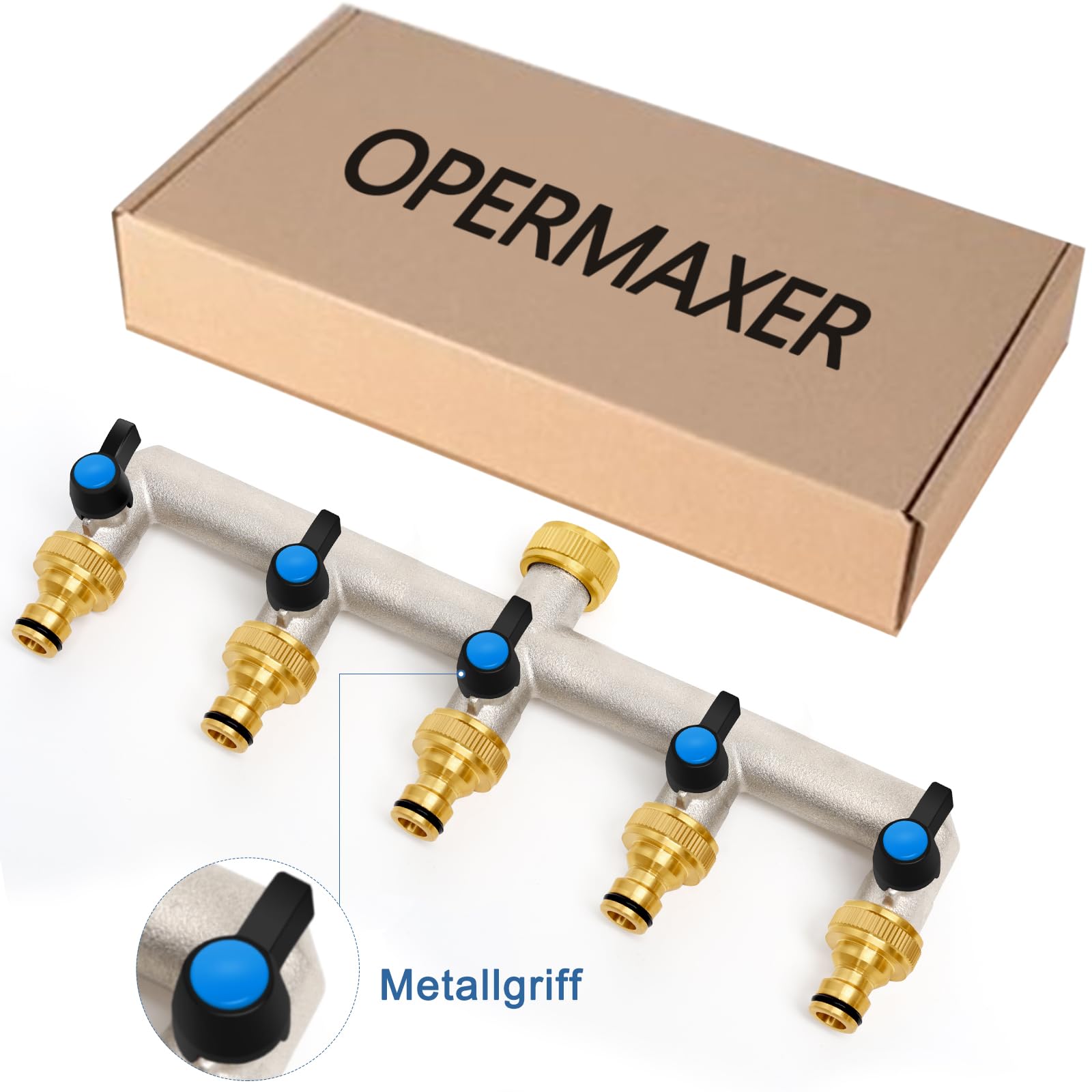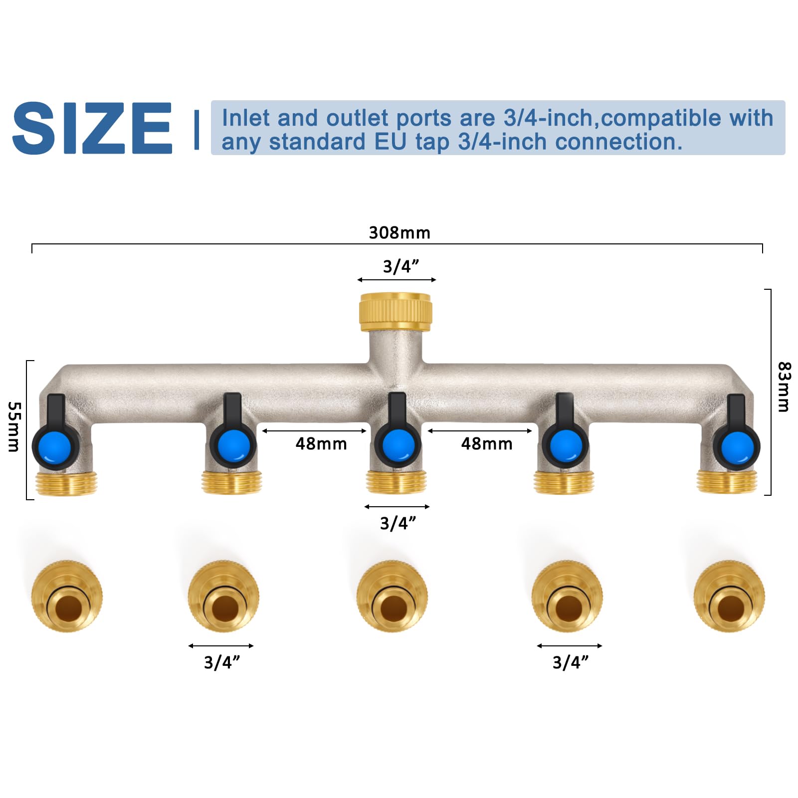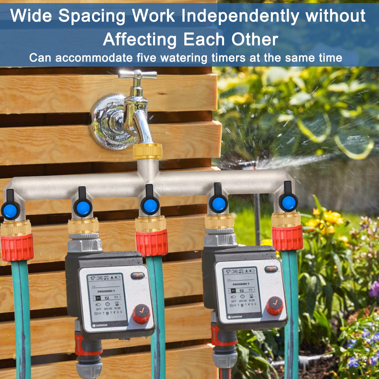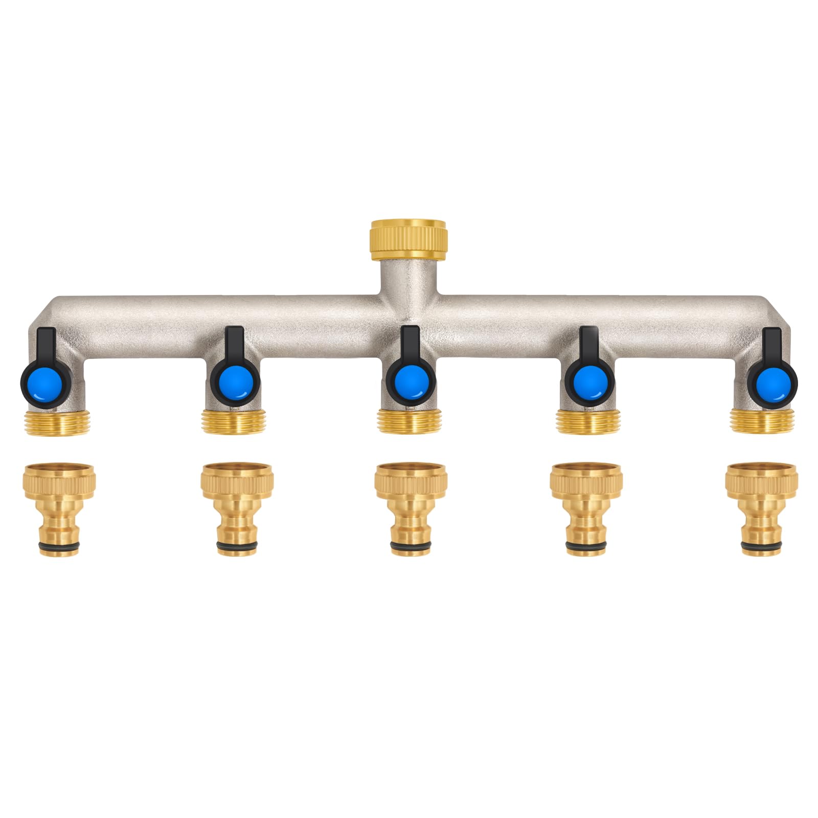 5-Wege Wasserhahn Wasserverteiler aus Messing für 5 Geräte/Gartenschläuche, 5er Verteiler 3/4" Adapter 1/2" mit Kugelhahn zum Einstellen und Absperren des Wasserflusses