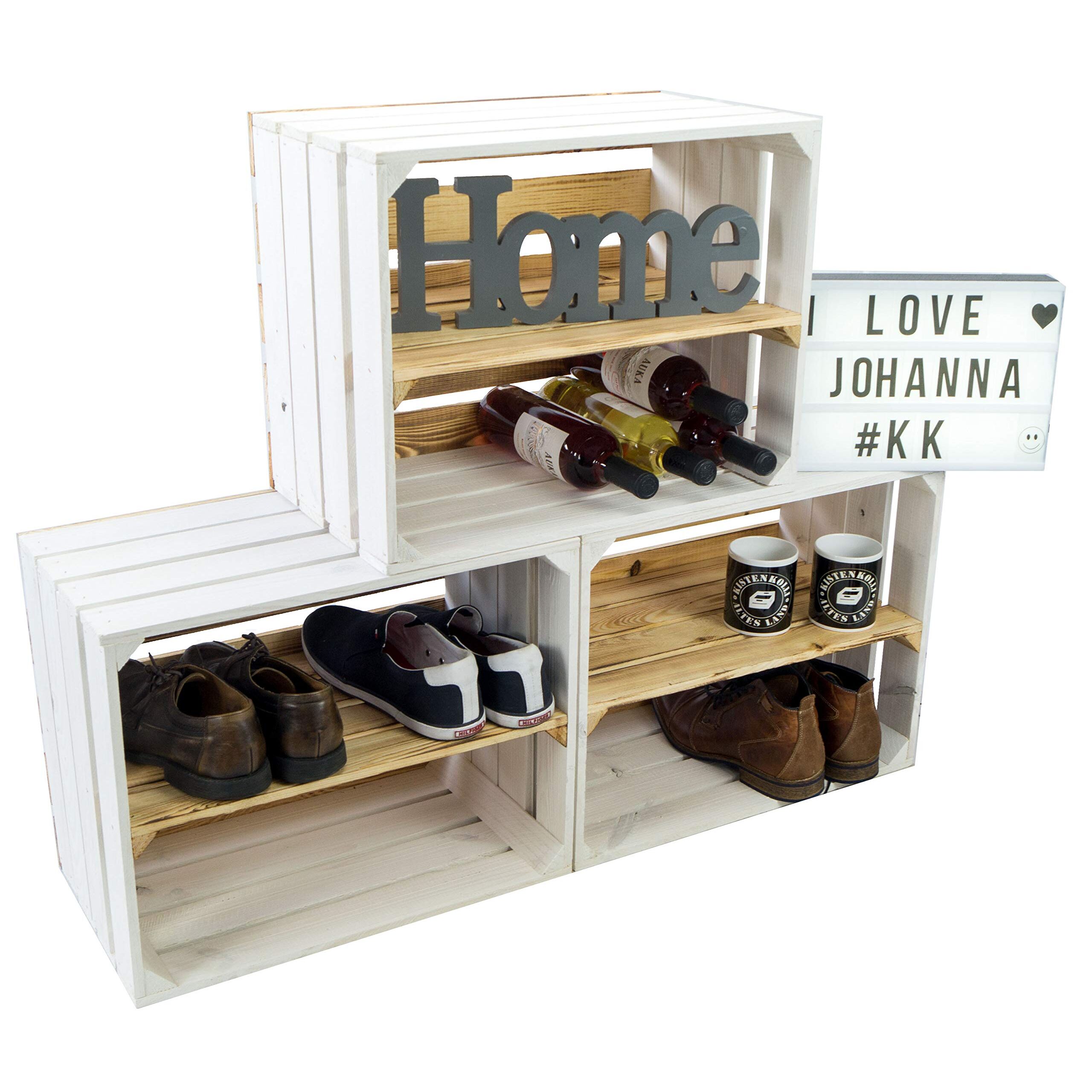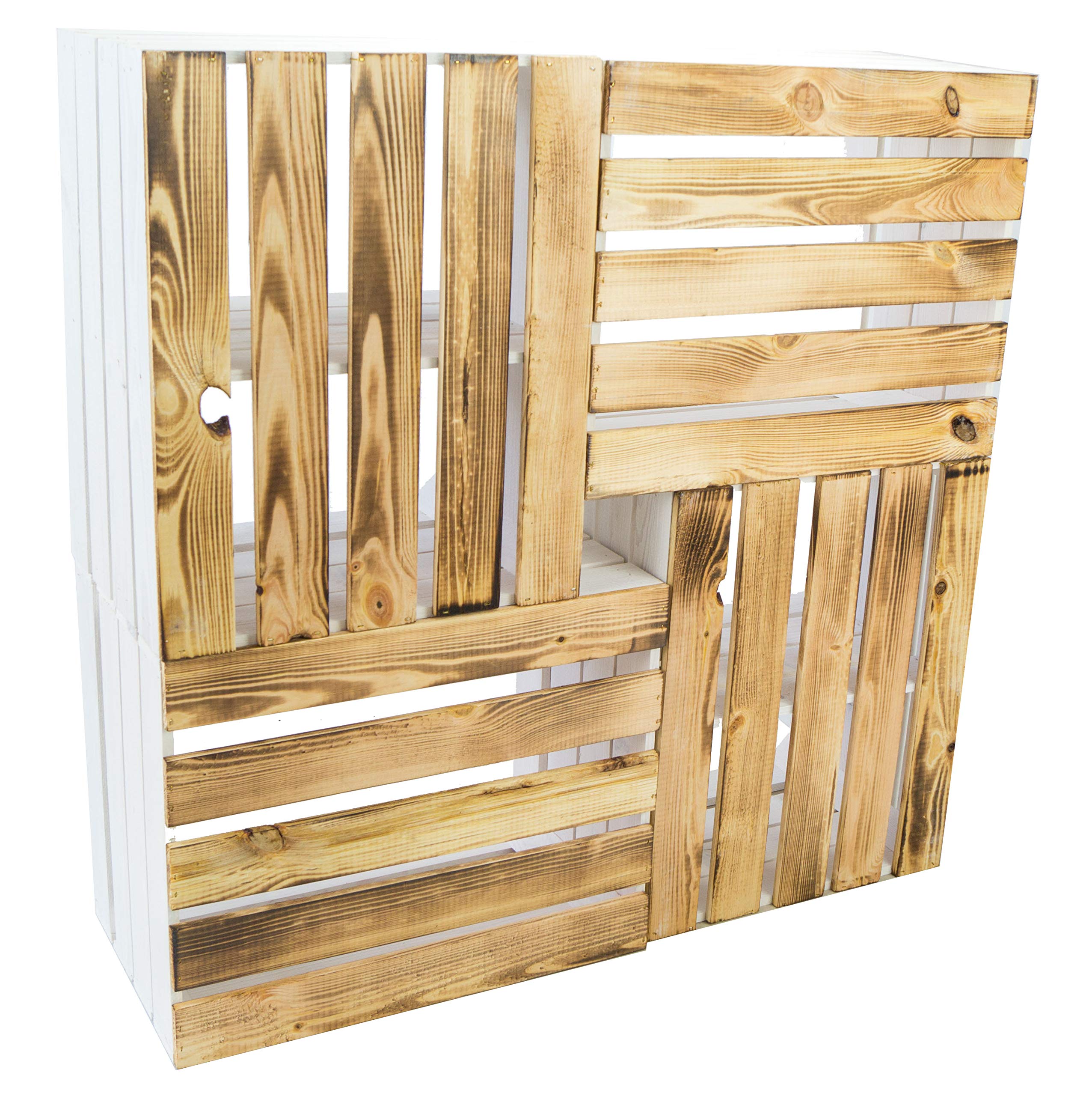 flambierte/geflammte Bücherregal - Schuhregalkiste mit Zwischenbrett/Mittelbrett Einlage ca 50x40x30cm / Apfelkisten Weinkisten Holzkisten aus dem Alten Land (Weiss FLAM Boden FLAM LÄNGS)