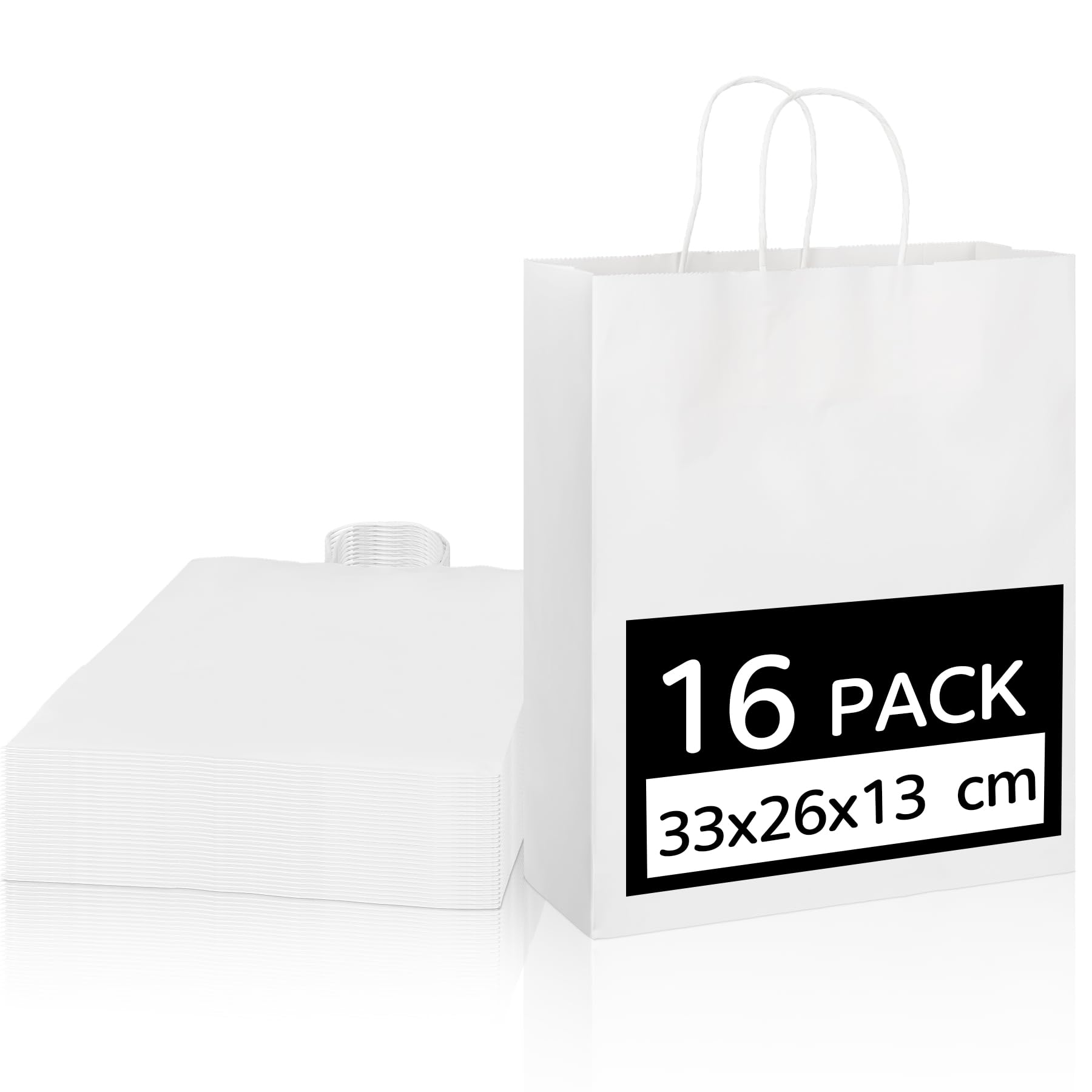 16 Stück grosse Papiertüten, weisses Kraftpapier, Partytüten, dicke Geschenktüten mit Griffen, perfekt für Kinderpartys, Geburtstage, Babypartys (33 x 26 x 13 cm)