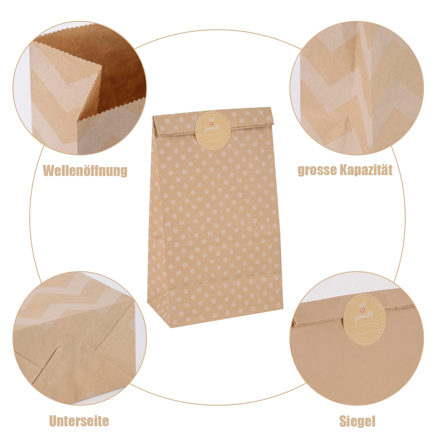 • 【5 STILE】30 Geschenktüten klein, 5 Stile, braun, grosse runde Punkte, kleine runde Punkte, Wellenmuster, diagonale Streifen, ideal für Adventskalender Tüten zum Befüllen, Weihnachtstüten, Mitbringsel Kindergeburtstag und so weiter.