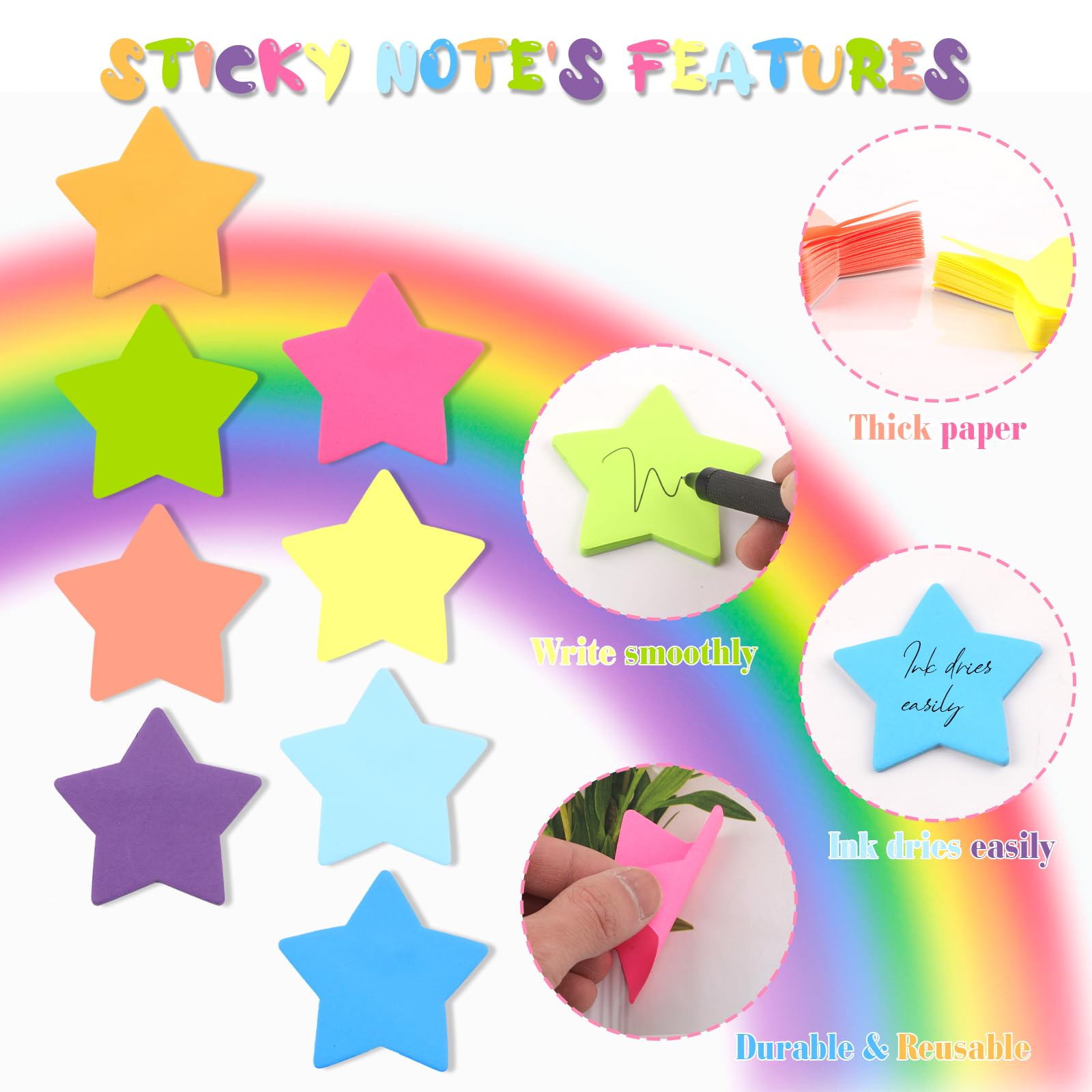 • 【8 FARBEN】 Diese Sticky Notes sind in 8 hellen und lebendigen Farben im niedlichen sternförmigen Design erhältlich. Wählen Sie aus diesen wunderschönen Farben, um Ihre Nachrichten zu sortieren und Ihre Informationen mit den speziellen sternförmigen Haftnotizen sichtbar und organisiert zu machen.