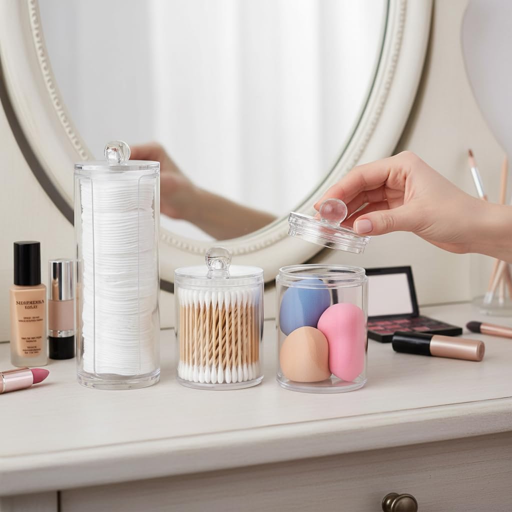 3er Set Kosmetik Organizer – Wattepads Spender & Wattestäbchen Behälter mit Deckel – Transparente Acryl Aufbewahrungsbox für Schminktisch, Badezimmer & Schlafzimmer – Make-up Aufbewahrungssystem