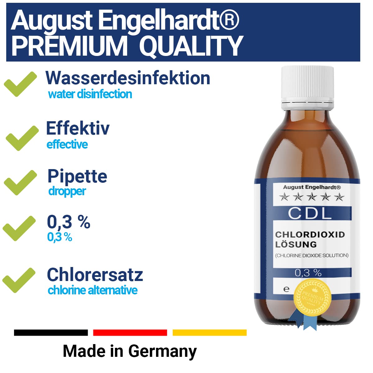 Chlordioxid-Lösung 0,3% – CDL/CDS in Braunglasflasche & HD-PE Pipette zum Tropfen. Vor Gebrauch stets Etikett und Produktinformationen lesen. BauA Registriernummer N-110569.