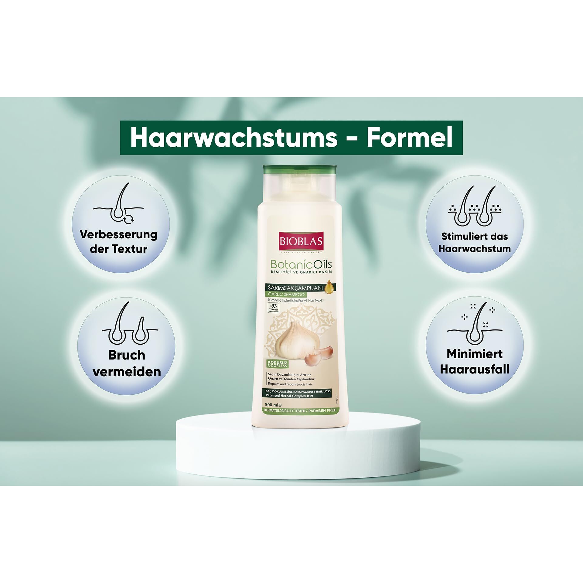 • ???? HAARPFLEGE: Effektivere Pflege durch die Kräuterformel mit echtem Knoblauchextrakt. Dank der speziellen Formel mit echtem Knoblauchextrakt beugt BIOBLAS BotanicOils Knoblauch Shampoo nicht nur Haarausfall vor, sondern korrigiert den natürlichen Fettgehalt des Haars, baut es auf und verleiht ihm neuen Glanz und Geschmeidigkeit