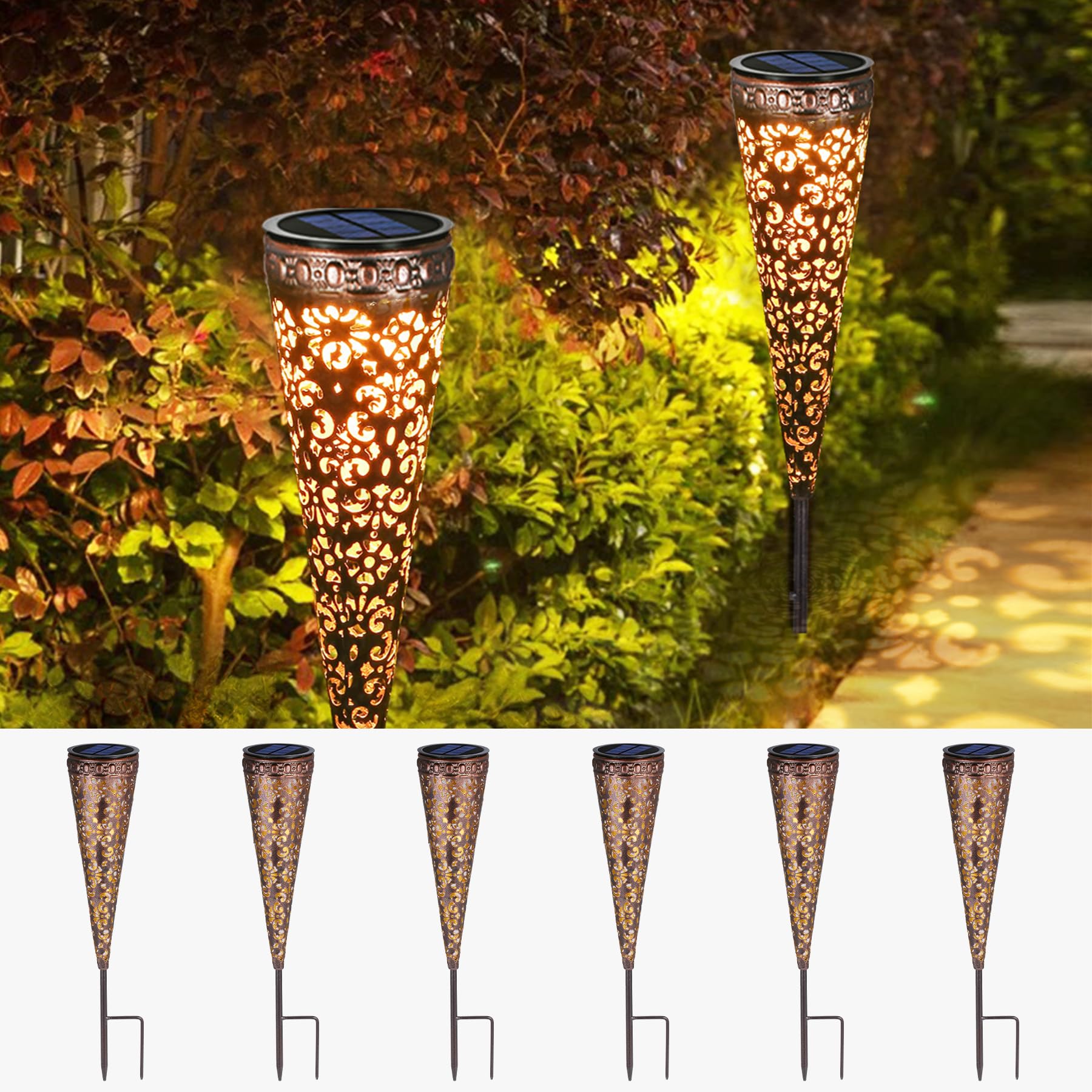 Görvitor Solarlampen für Aussen Garten 6 Stück, Metall Solarleuchten für Aussen mit IP65 Wasserdicht, LED Warmweiss Gartenleuchten Solar mit Erdspiess für Deko Balkon Terrasse Blumenkasten Hinterhöfe