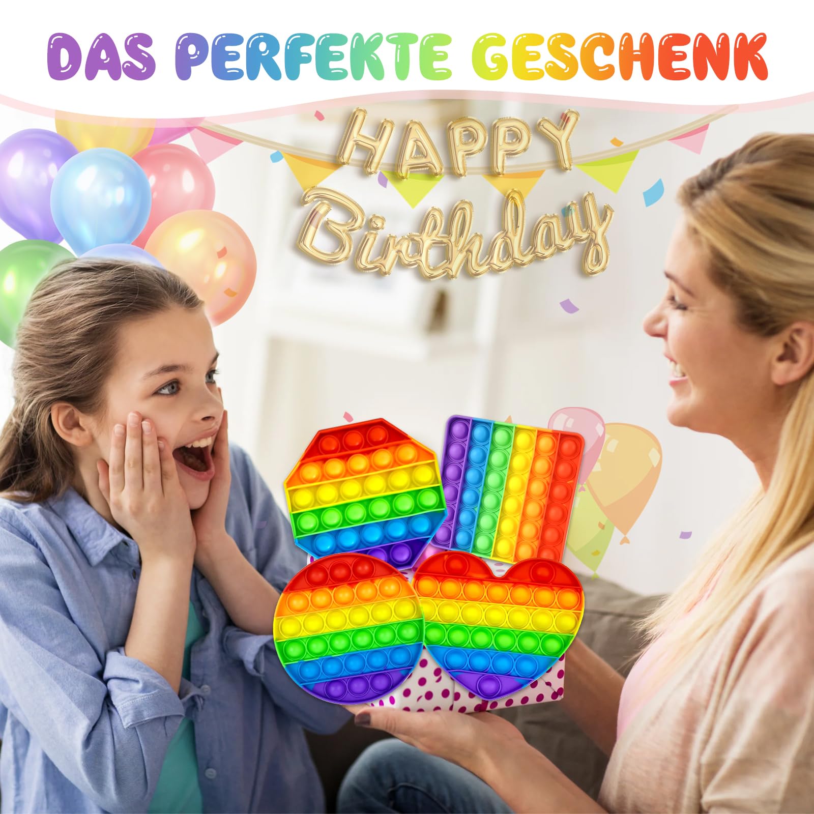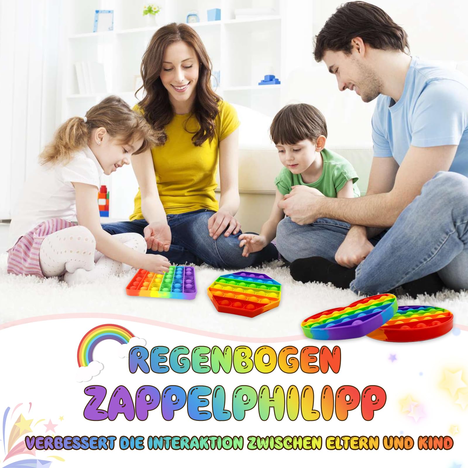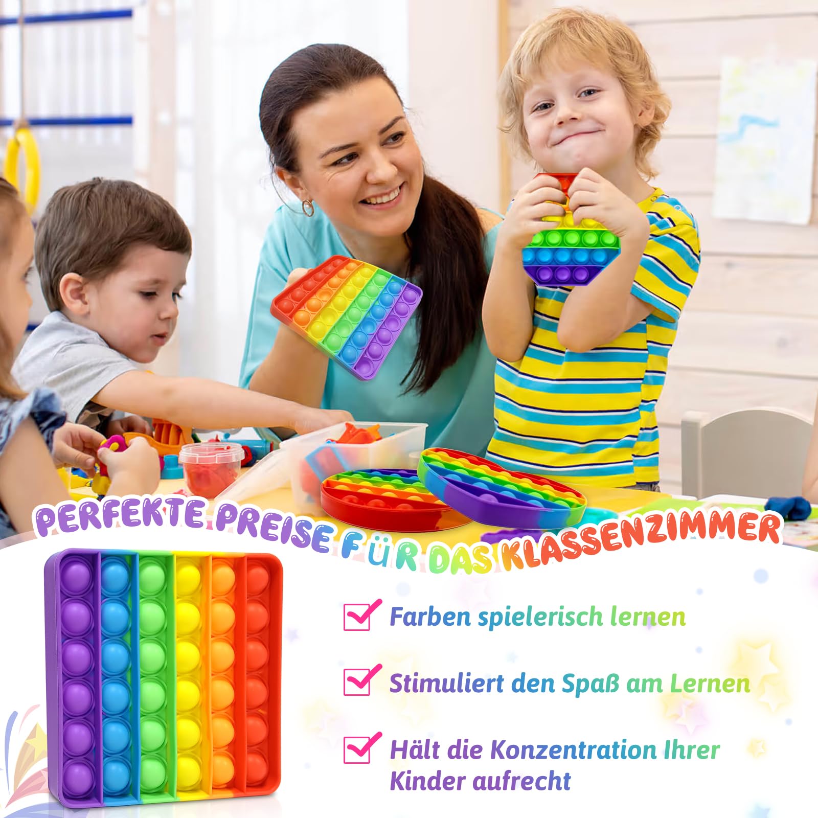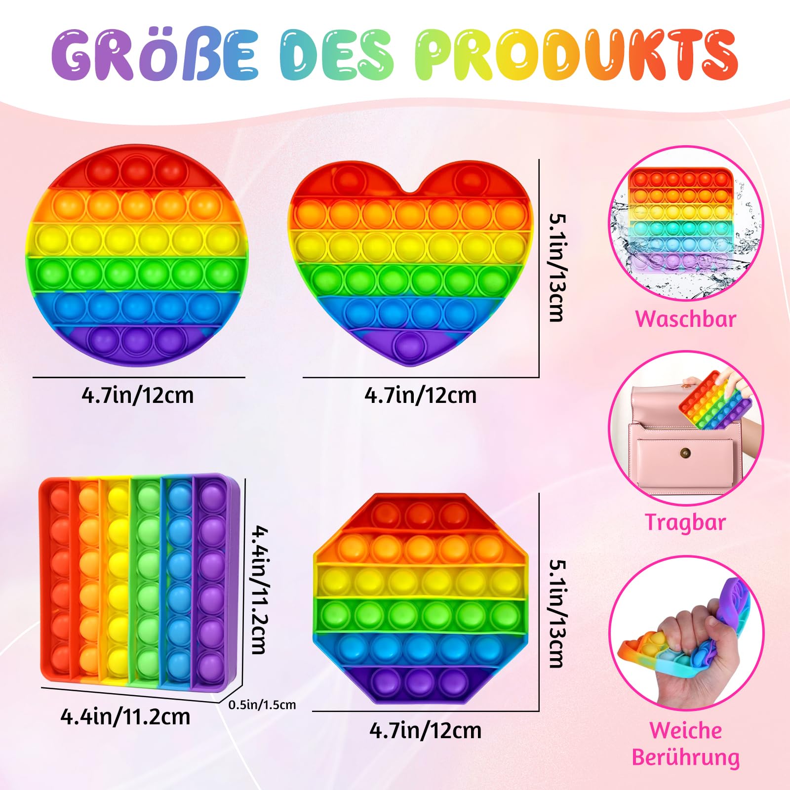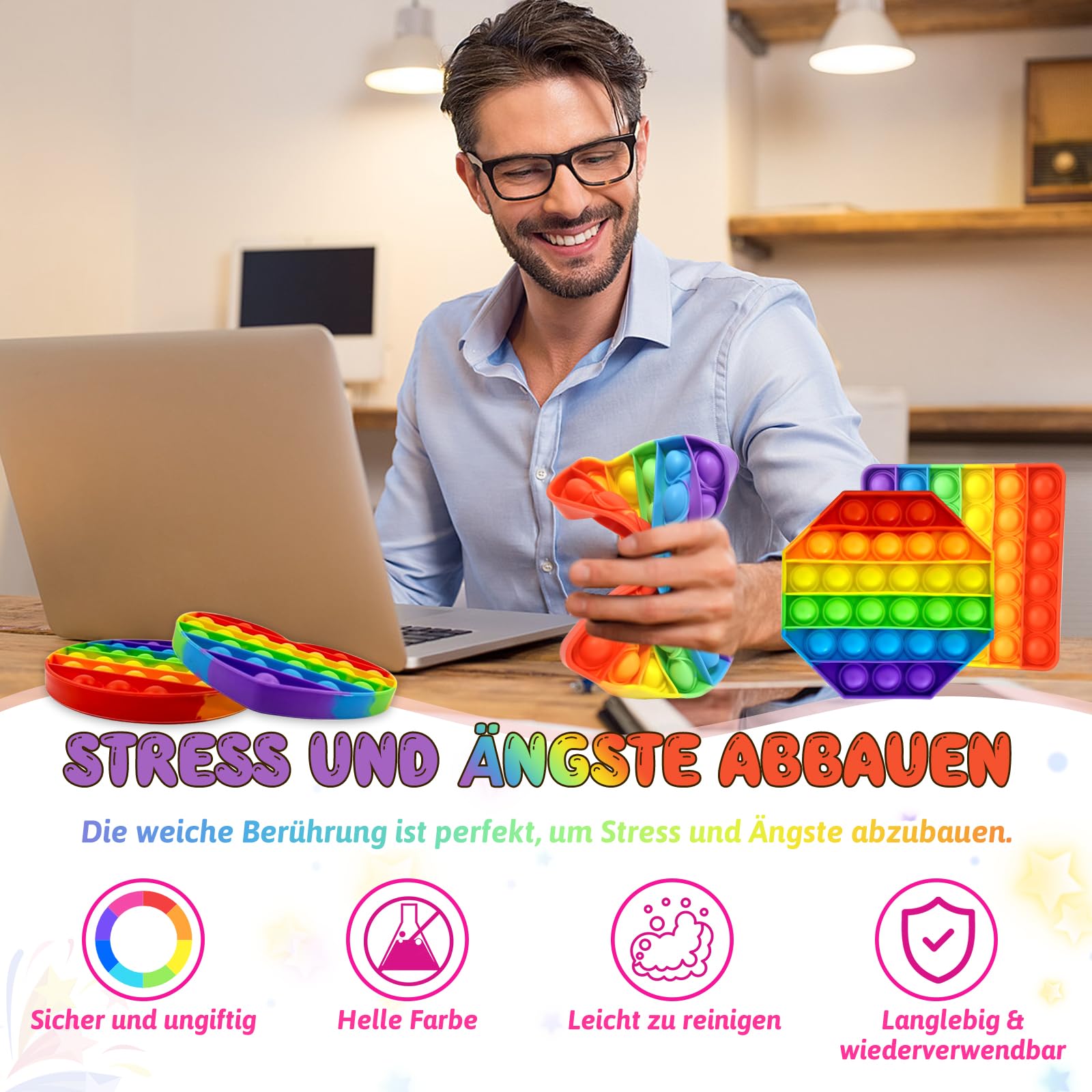 • ????【Regenbogen Zappelspielzeug】Es erzeugt ein befriedigendes Knallgeräusch, das Ihre Ohren beruhigt, und die weiche Silikontextur jedes Knalls hat eine verwöhnende Wirkung auf Ihre Fingerspitzen, hilft, Ihren Geist und Körper zu entspannen, Stress und Angst zu beseitigen! Wenn alle Blasen auf der Vorderseite zusammengedrückt werden, dann drehen Sie es um und beginnen Sie erneut.